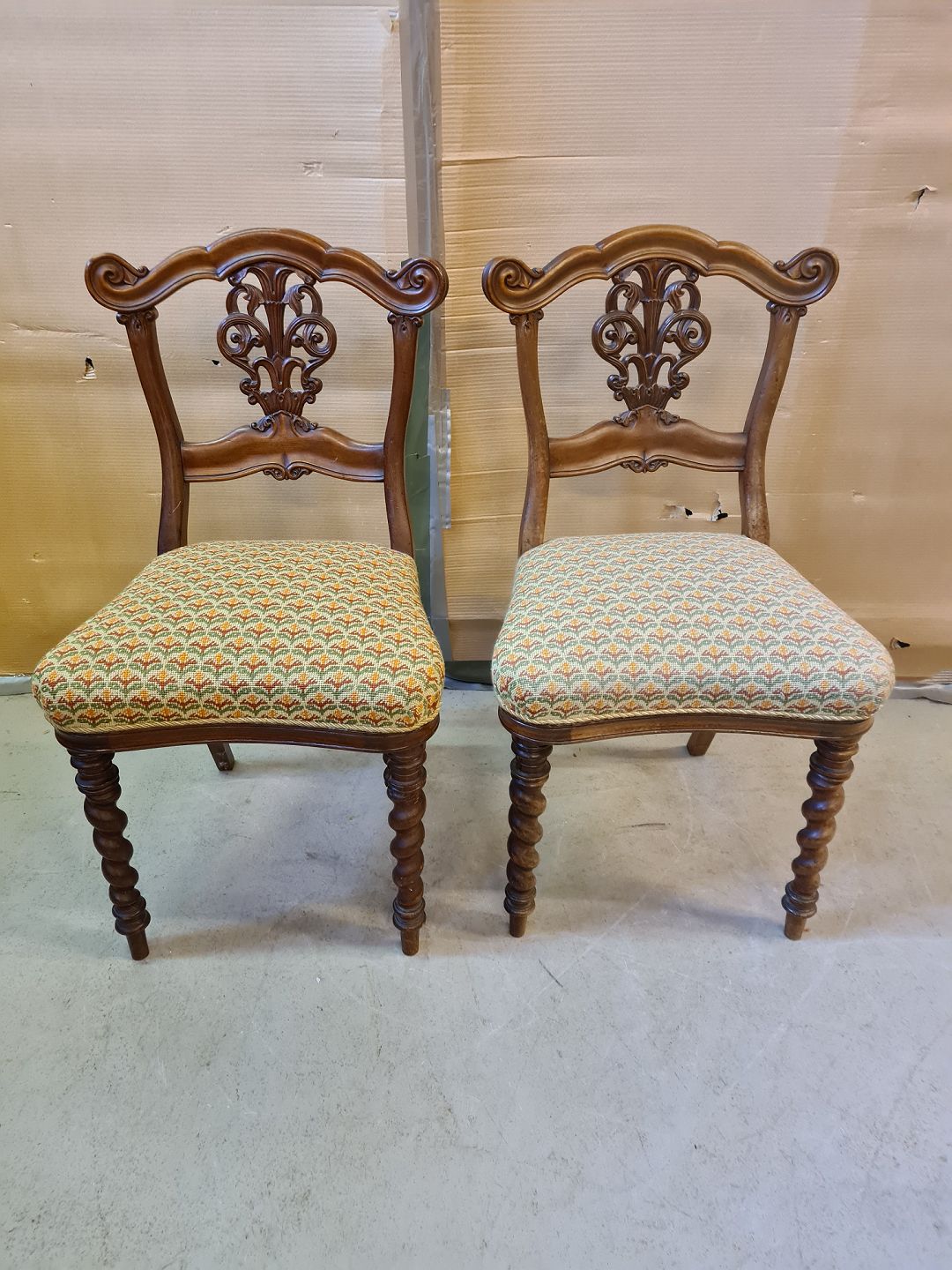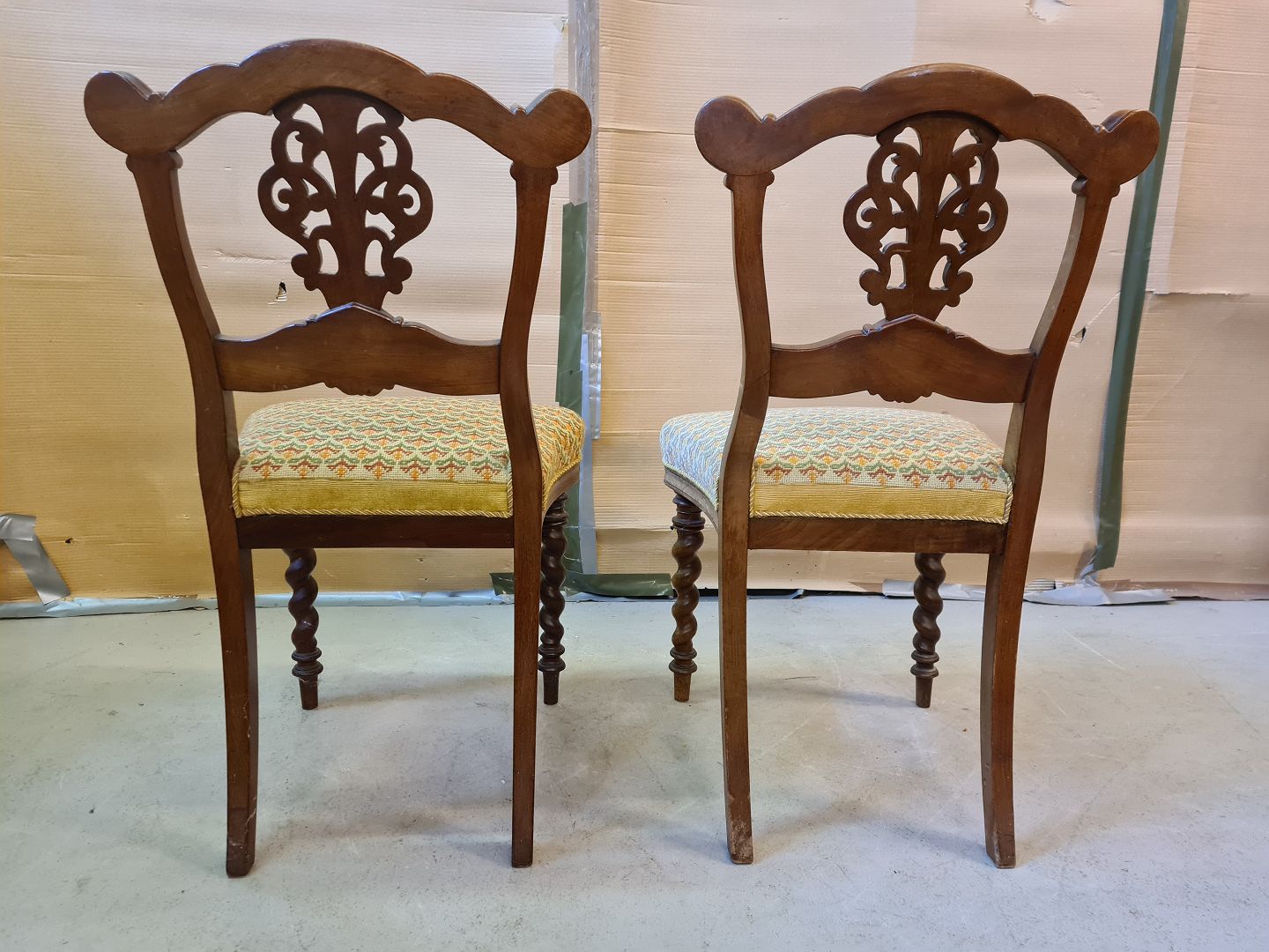 2 Salonstole i mahogni med broderet betræk, fra 1890erne.
