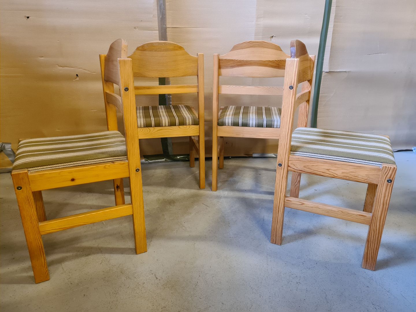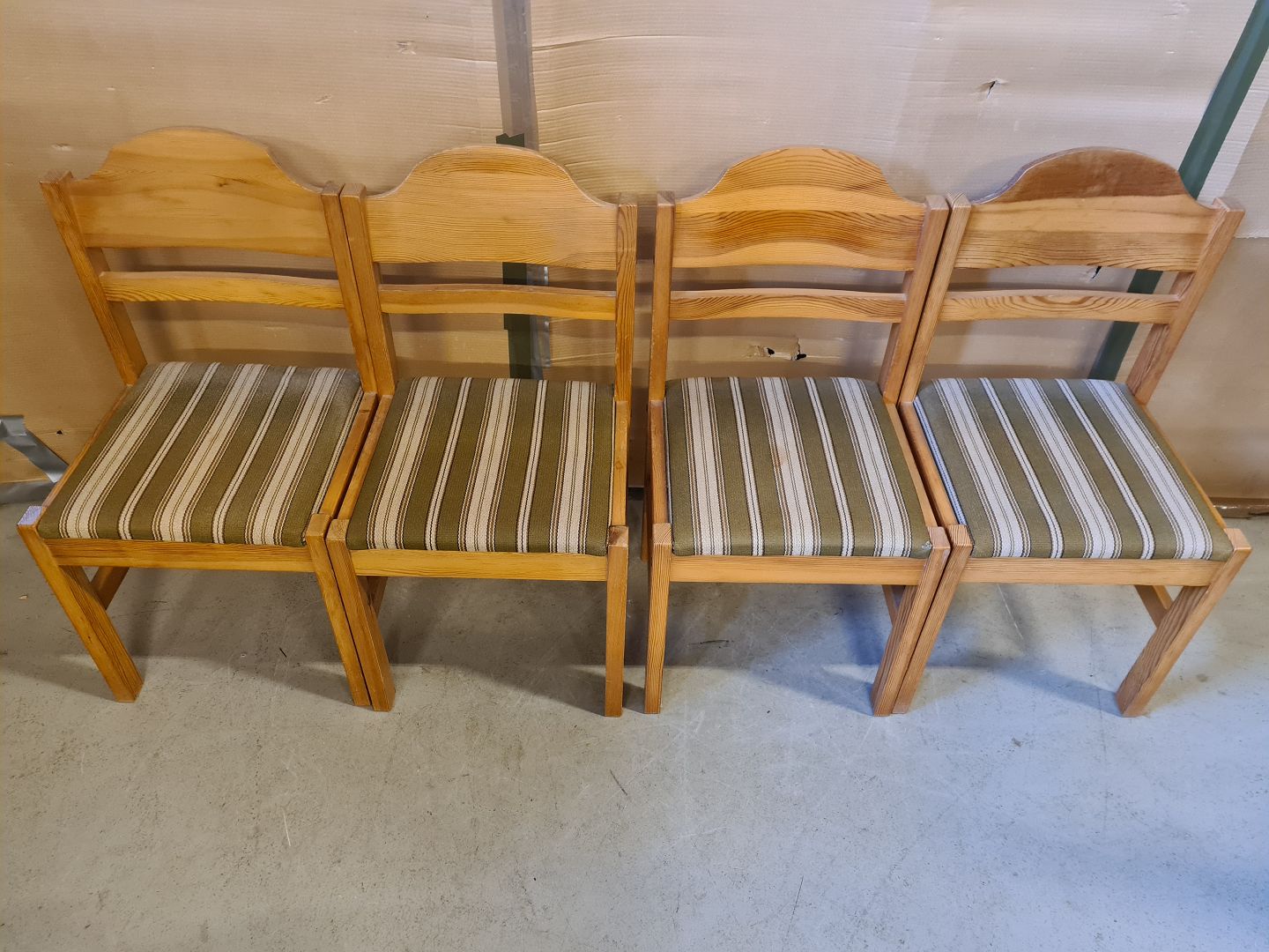 4 Stole i massivt fyrretræ, fra 1990erne. De har brugsspor. Ryghøjde 85cm Sædehøjde 45cm Emne nummer: 74587