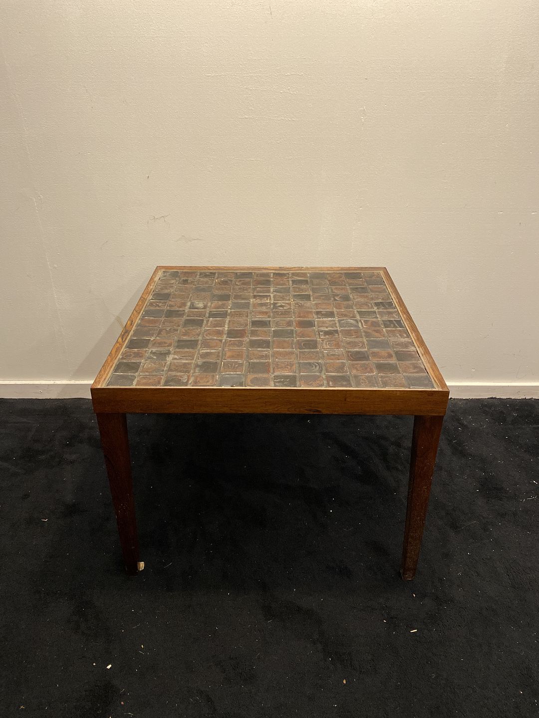Kvadratisk sofabord fra 1970´erne i palisander og med kakler. Fremstår pænt og velholdt uden nævneværdige brugsspor. HxLxB 50x65x65 cm Emne nummer: 80340