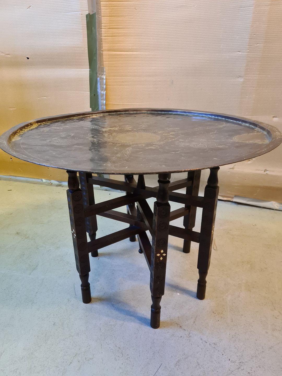 Afghansk bakkebord i træ med kobberplade, fra 1970erne.