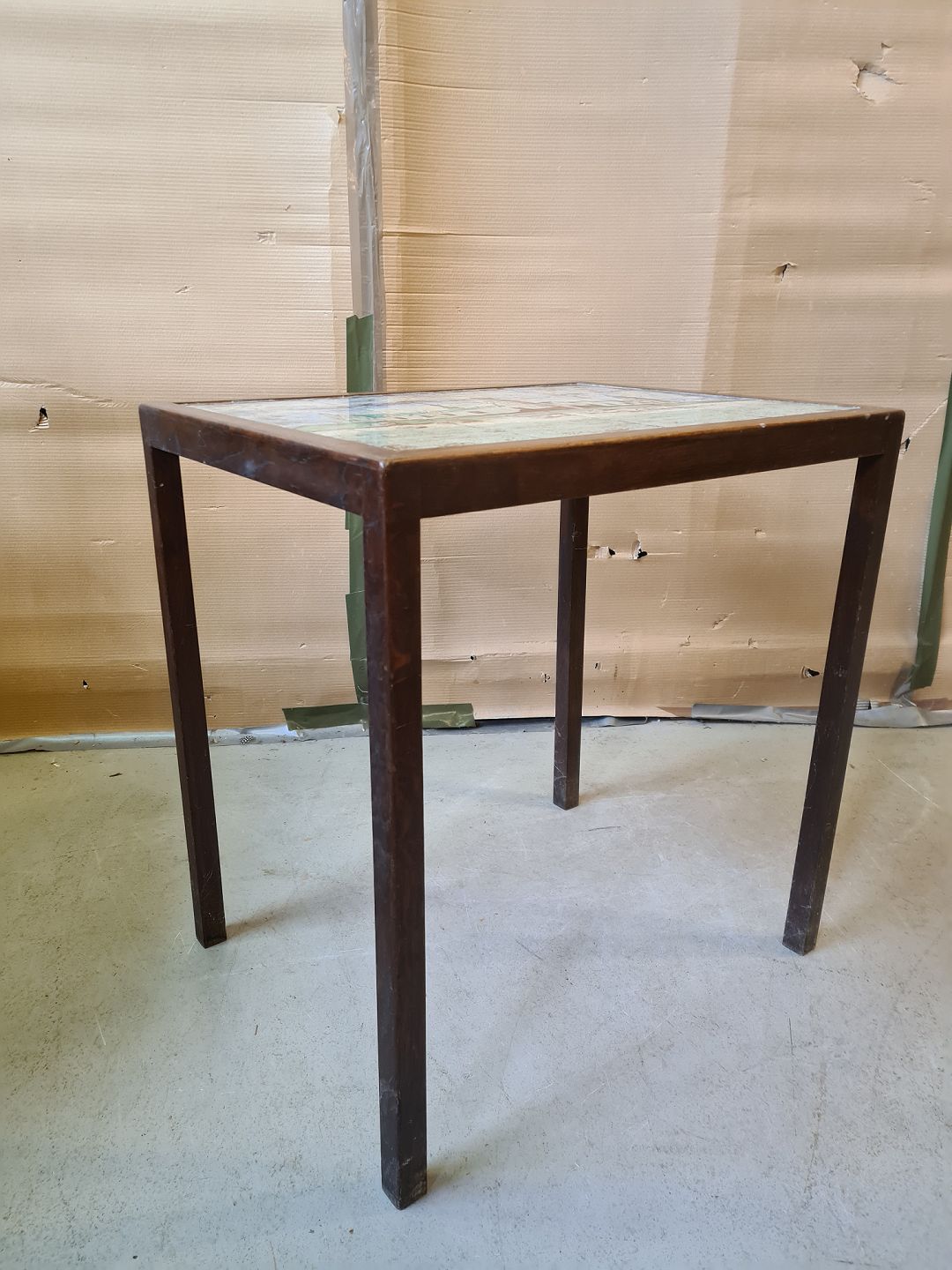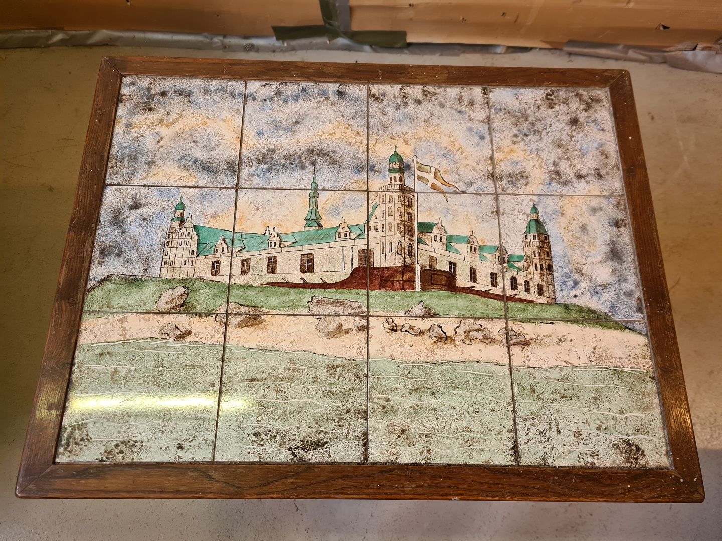 Bord i egetræ med Kronborg malet på kakler, fra 1960erne. Det har brugsspor. Højde 70cm Bredde 67cm Dybde 52cm Emne nummer: 74673