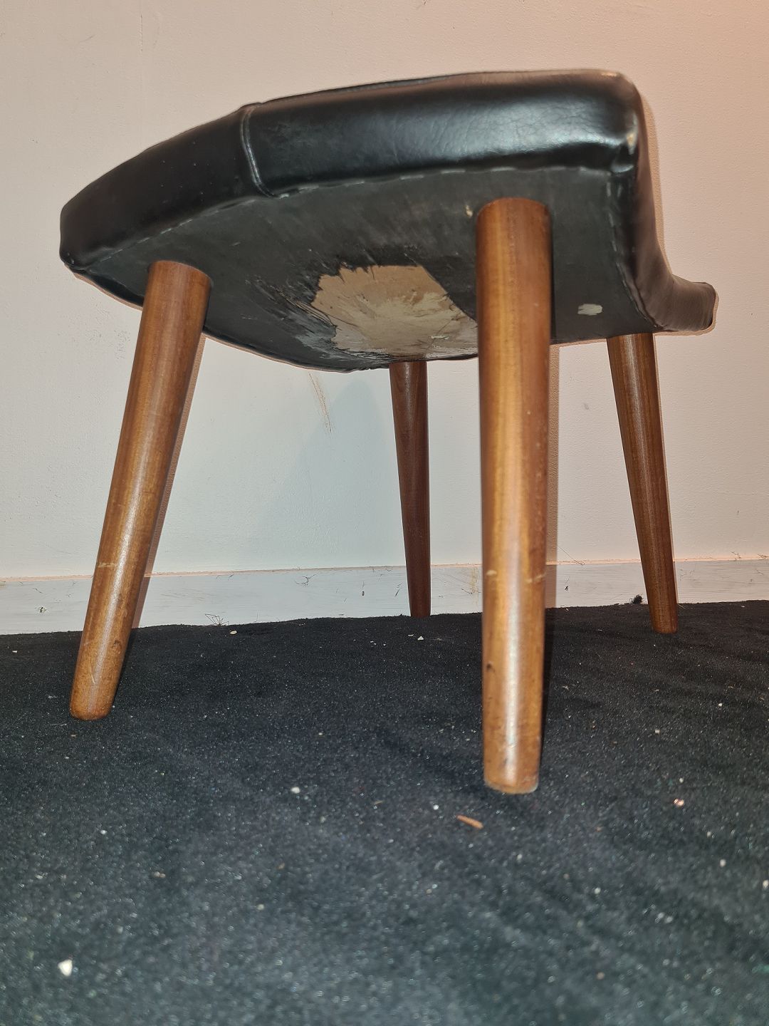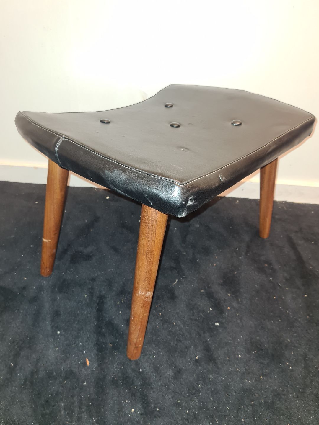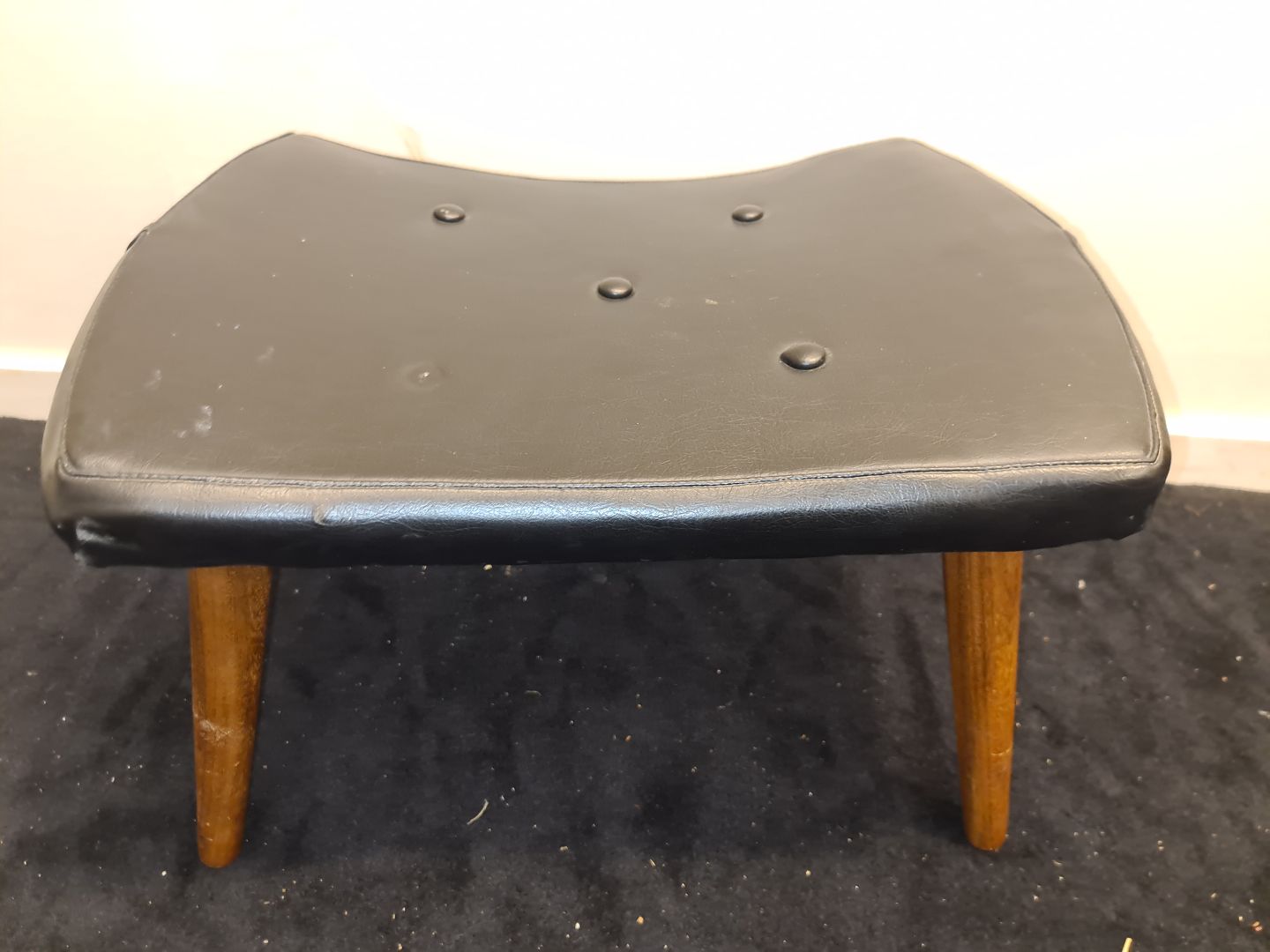 Læderbetrukket fodskammel med ben i teak. Fremstår stabil og ok pæn dog med manglende knap. (billede) HxLxB 35x51x38 cm. Emne nummer: 80376