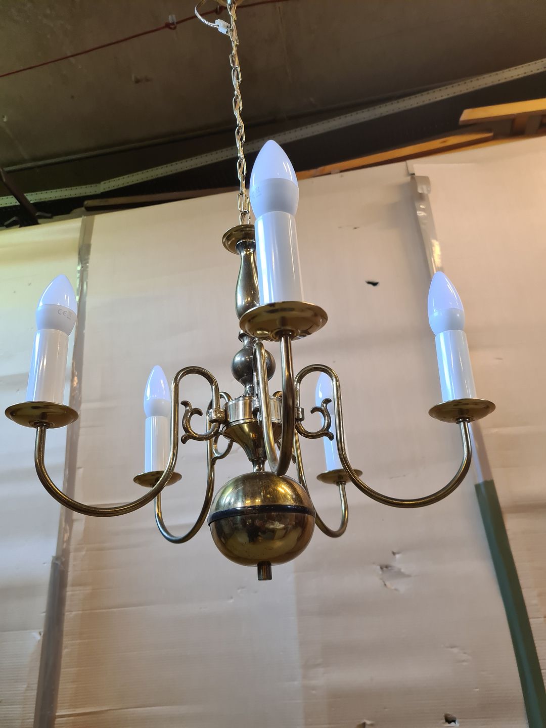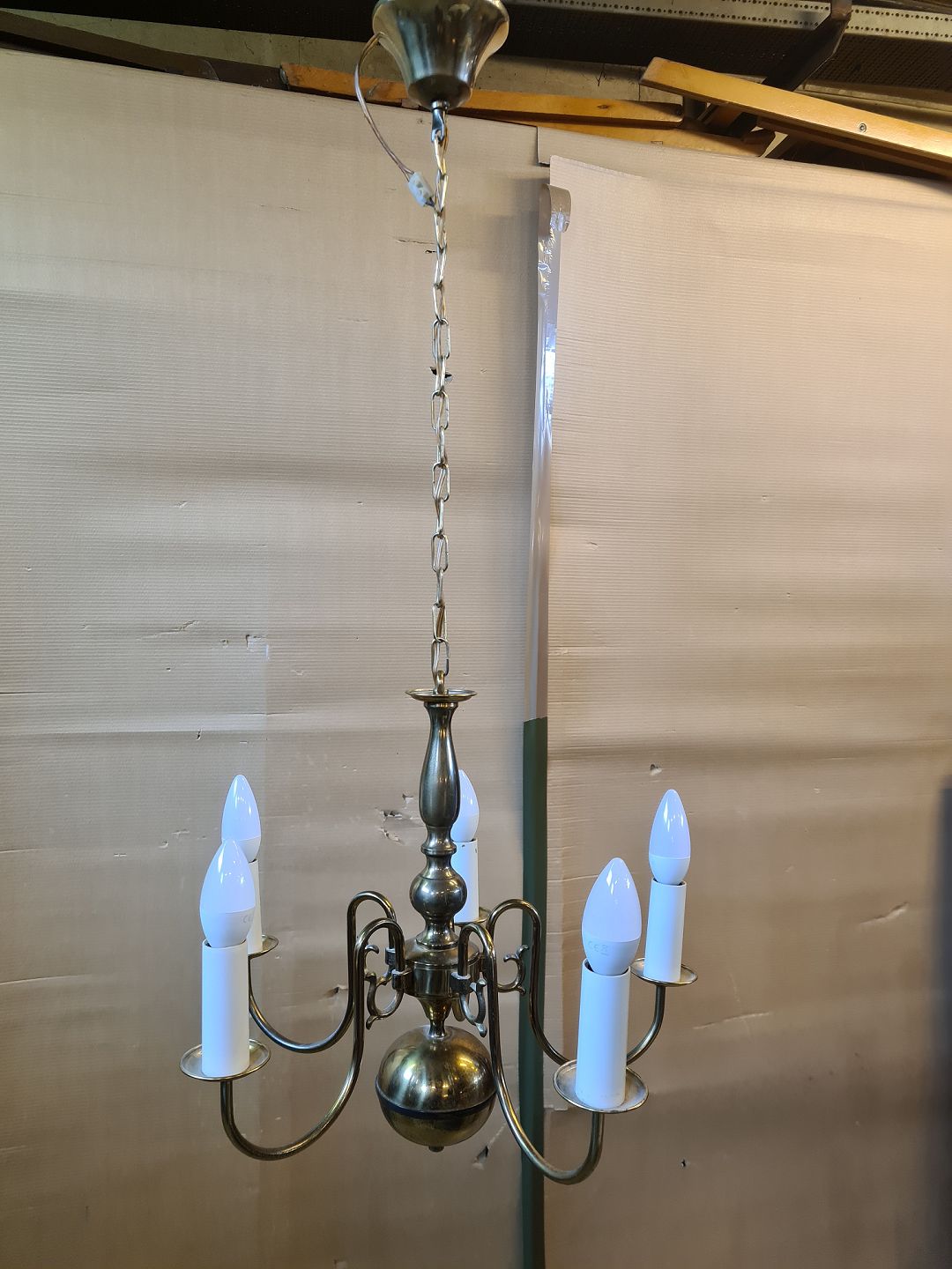 Kirkekrone i metal, fra 1970erne. Den har brugsspor. Højde med kæde 92cm Diameter 47cm Emne nummer: 75373