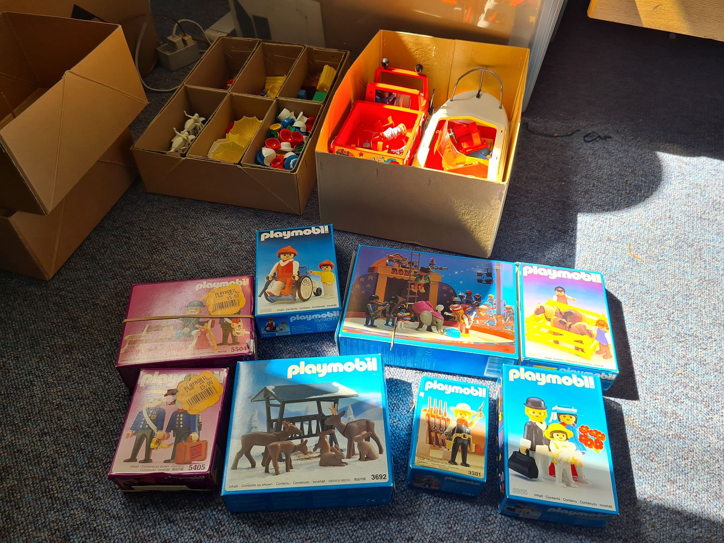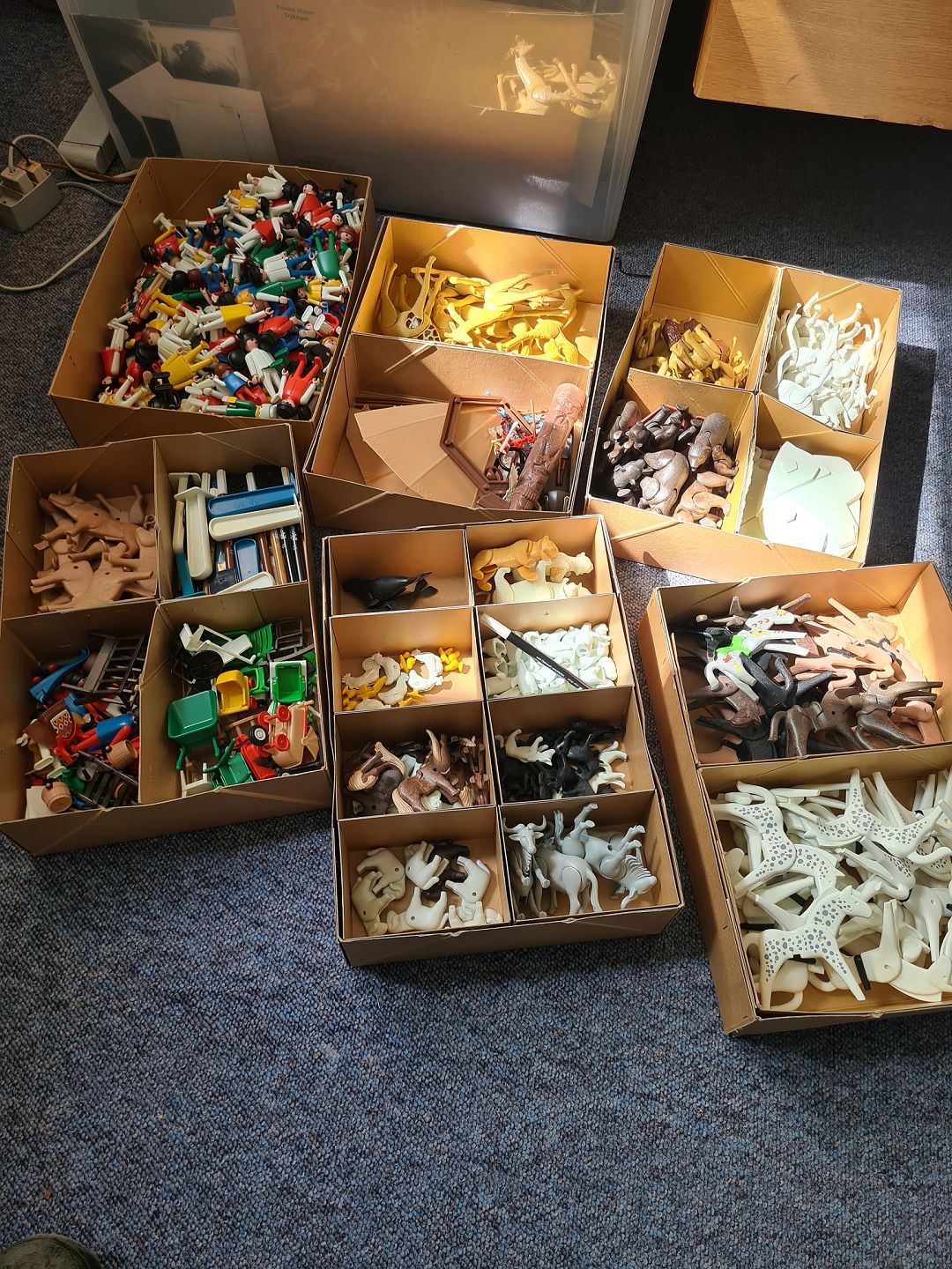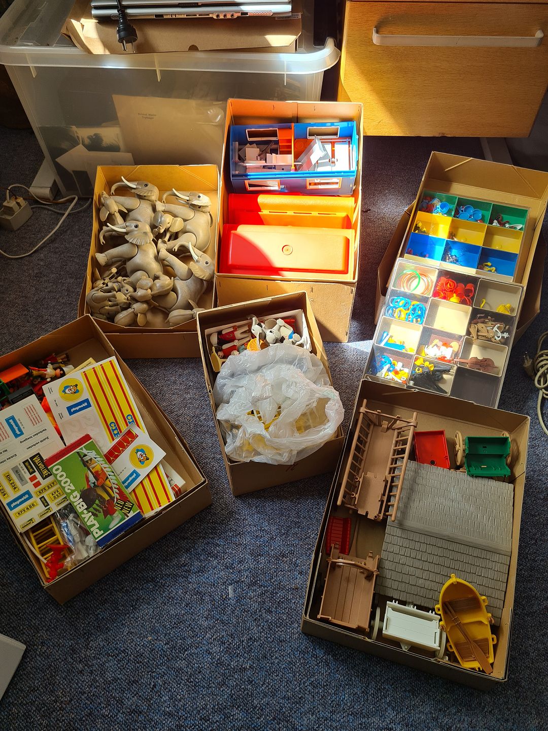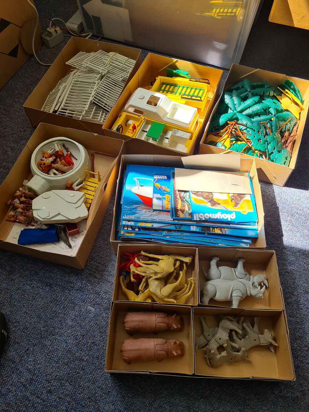 Stor samling vintage Playmobil legetøj fra sidst i 70´erne start 80´erne. Inkluderer alt hvad der vises på billederne. De originale kasser er åbnet men ellers i rigtig pæn stand. Der ligger stadig legetøj i dem men det ser ikke helt komplet ud, så der forestår et pænt sorterings arbejde med at få sættene komplette i deres bokse, for det ligner, at alt er til stede i samlingen. Vær opmærksom på at samlingen fylder 4 store flyttekasser.