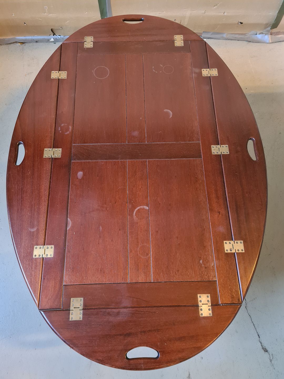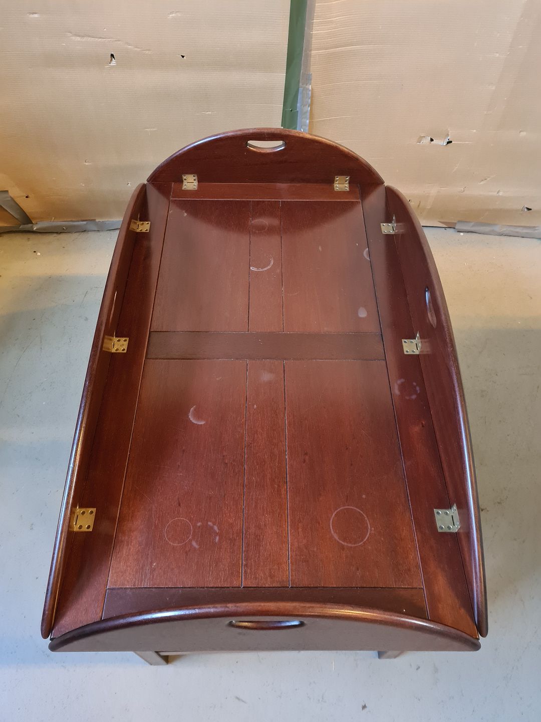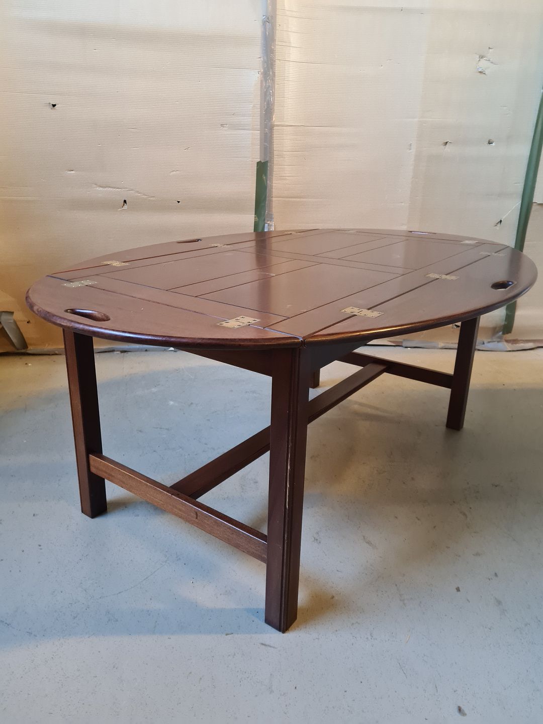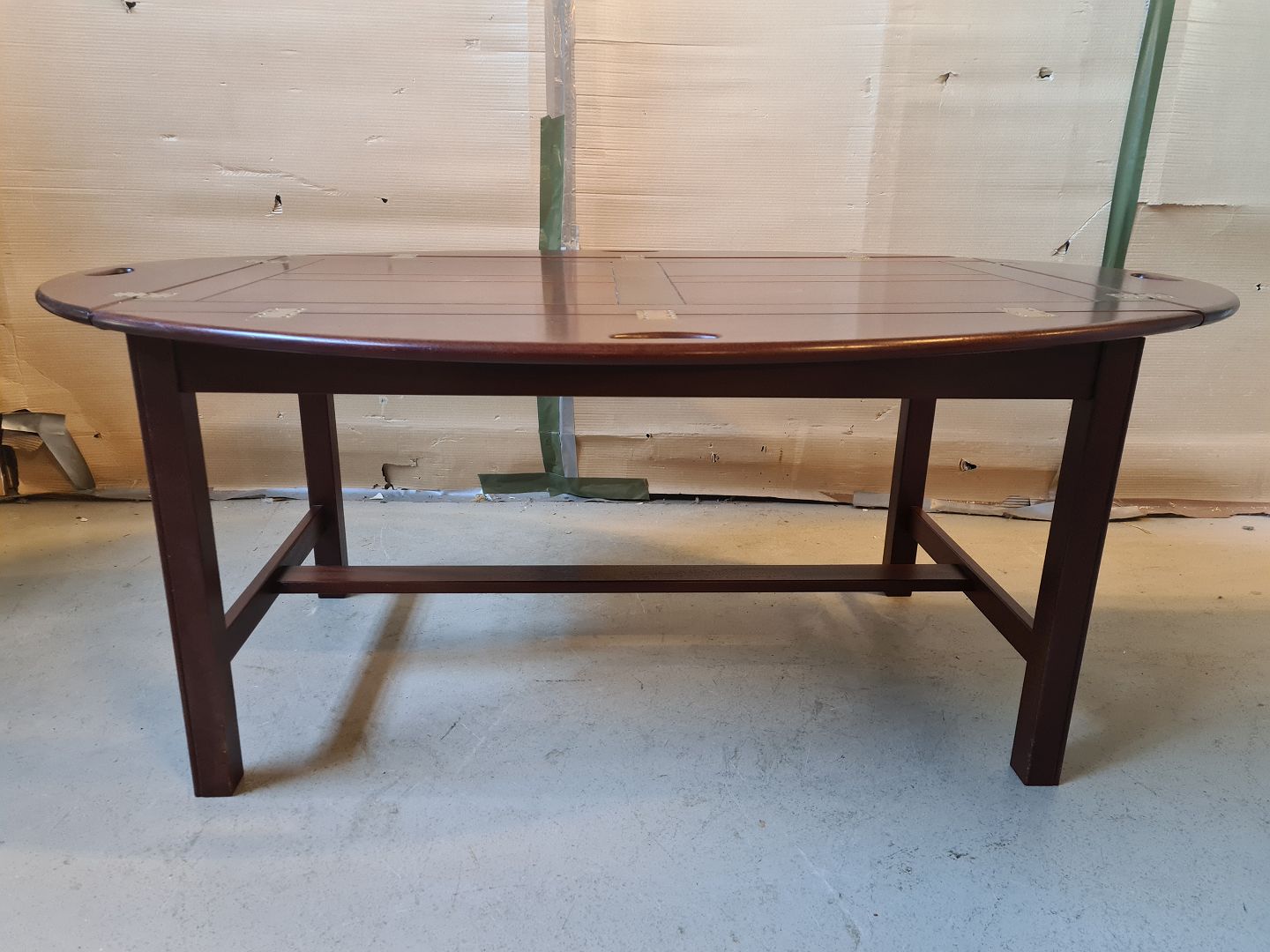 Sofabord i massivt og fineret mahogni, fra 1990erne. Det har brugsspor. Højde 56cm Bredde 95cm Længde 140cm Emne nummer: 75457