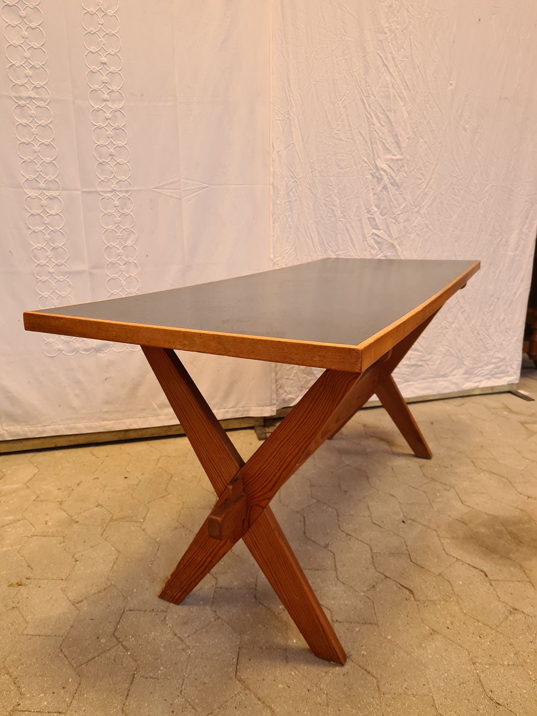 Bord med understel i massivt fyrretræ, plade med lister af egetræ og linoleum.