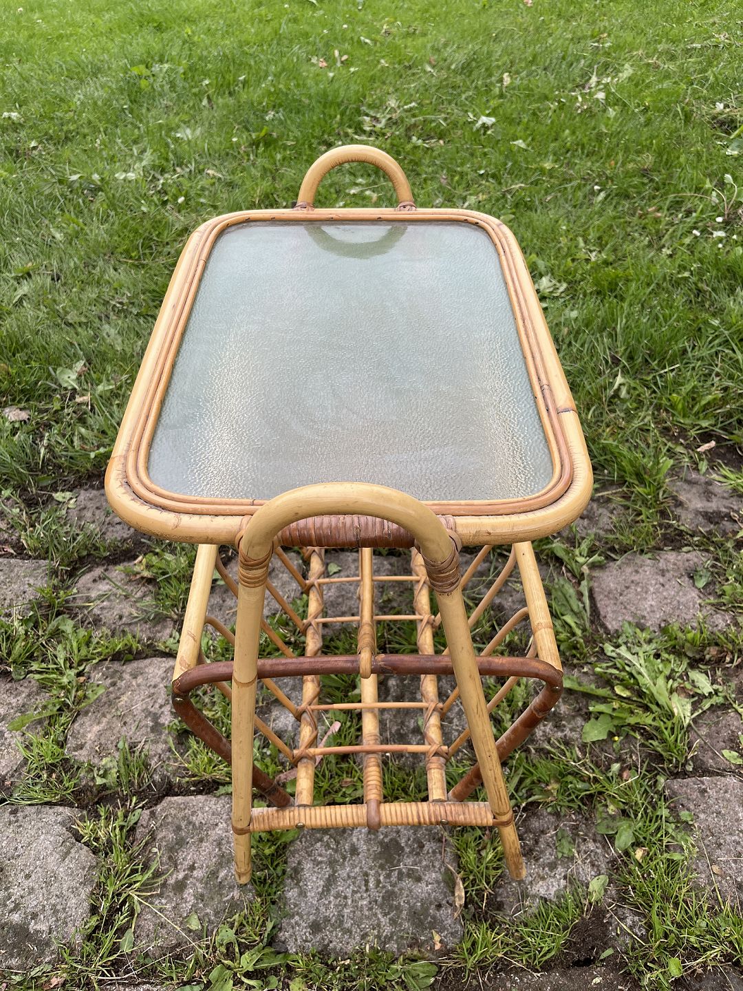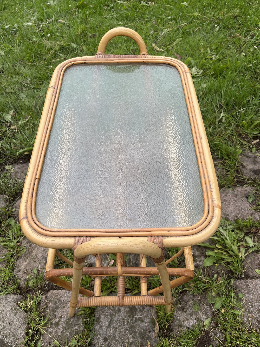 Sidebord med magasinholder i bambus med glasplade. Den står i pæn brugt stand. Total højde 56 cm. Pladehøjde 51 cm. Bredde 49 cm. Dybde 34 cm. Emne nummer: 80500