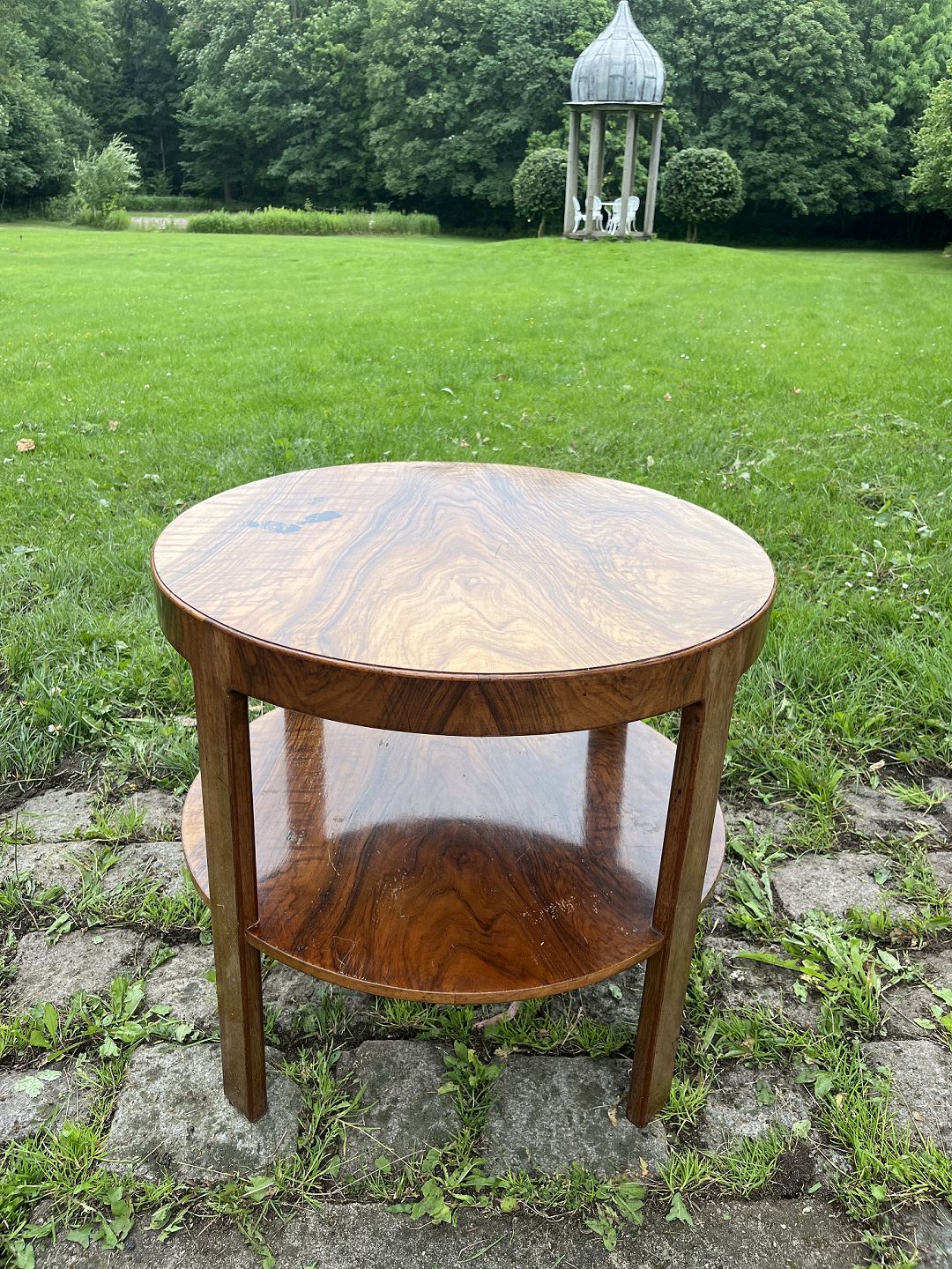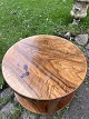 Sofabord med hylde lavet af snedkermester Jørgen Christensen. Bordet er udført i fineret nødetræ. Det har brugsspor. Højde 56 cm. Diameter 60 cm. Emne nummer: 80501
