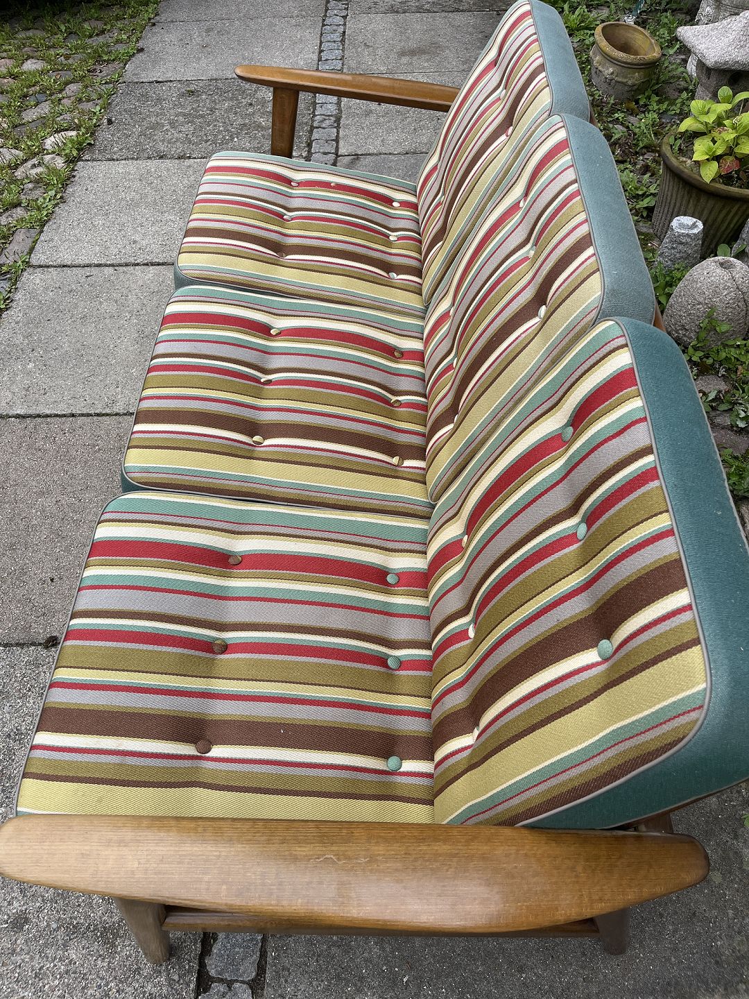 Hans J. Wegner 3. Personers sofa i bejset bøgetræ og fjedrehynder betrukket med Uldstof produceret af Getama i 1950’erne.