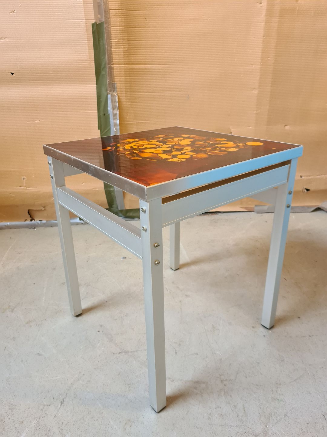 Lille borde i metal med glasplade, fra 1970erne. Det har brugsspor. Højde 48cm Bredden 40cm Dybde 40cm Emne nummer: 75731