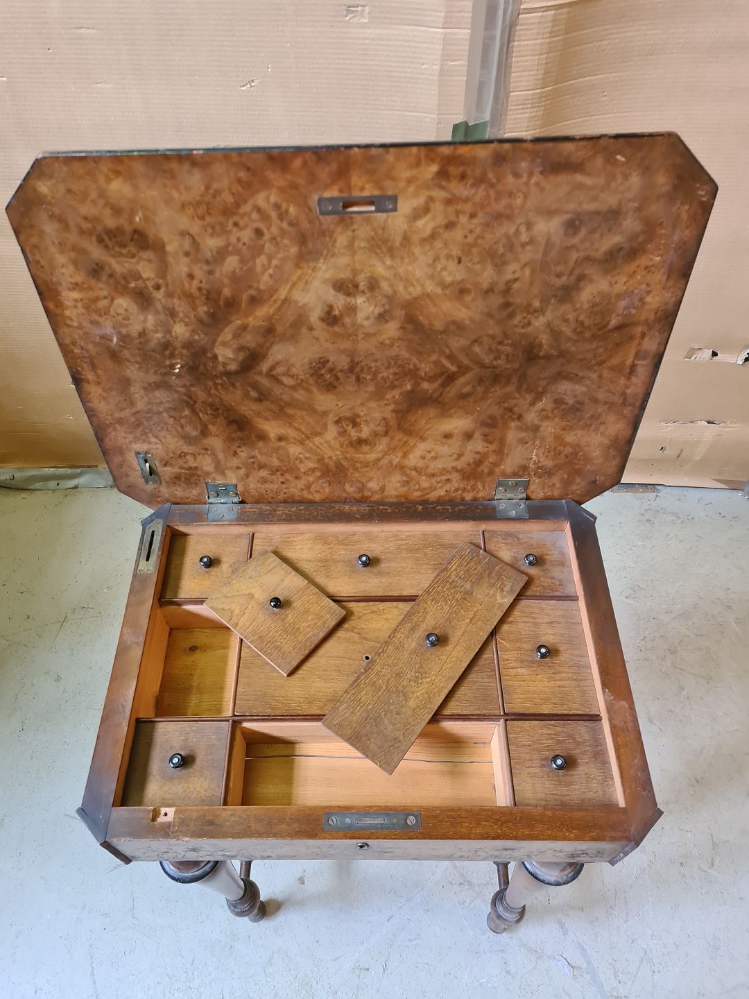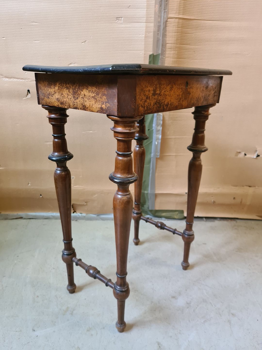 Sybord i fineret og massivt mahogni og bøgetræ, fra 1910erne. Det har brugsspor. Højde 72cm Bredde 51cm Dybde 37cm Emne nummer: 75785