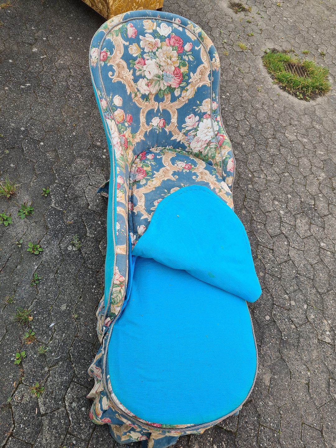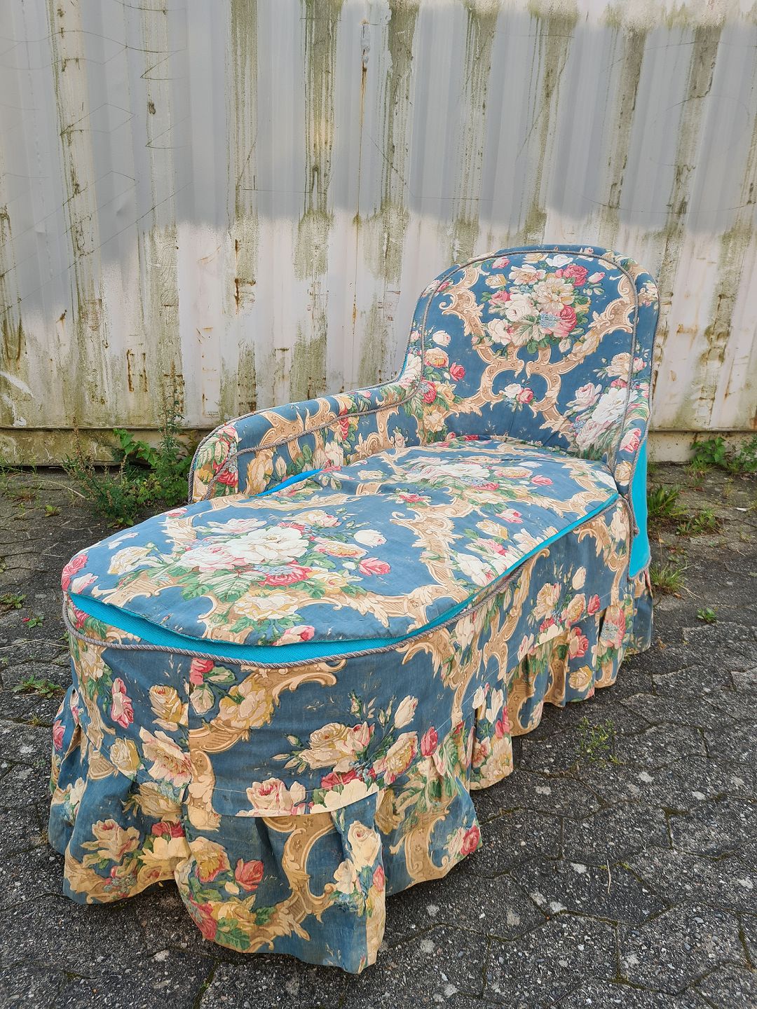 Chaiselong fra 1910erne. Betrækket er hjemmebetrukket og den har brugsspor. Ryghøjde 94cm Sædehøjde 46cm Bredde 61cm Længde 170cm Emne nummer: 75793