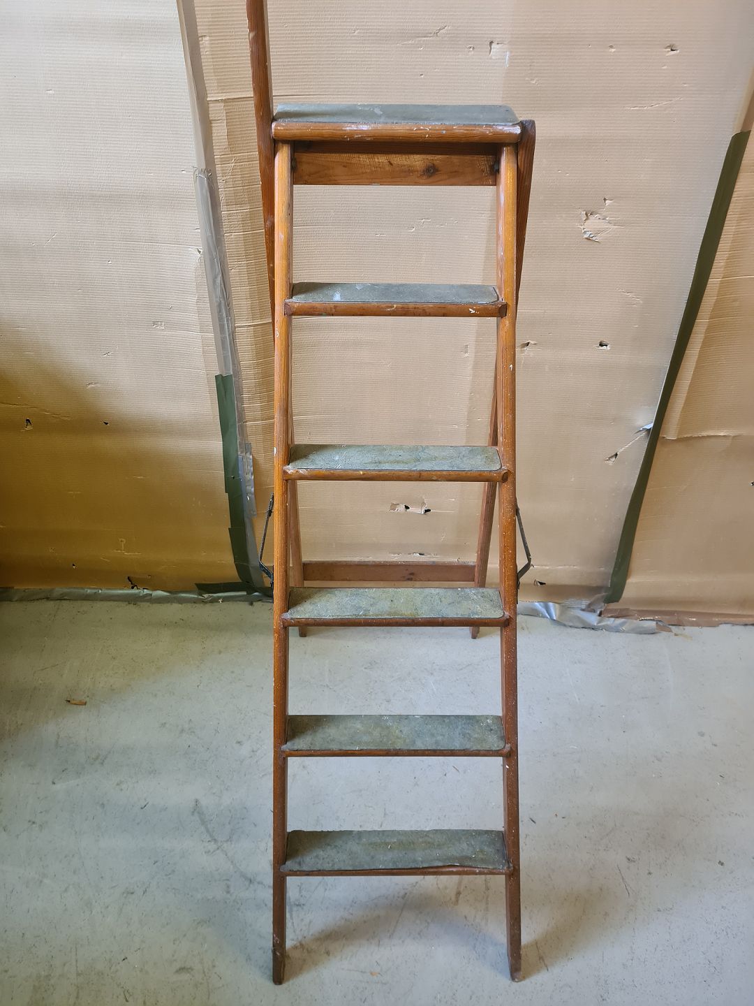 Stige i massivt fyrretræ, fra 1930erne. Den har brugsspor. Højde 194cm Øverste trin højde 149cm Emne nummer: 75814