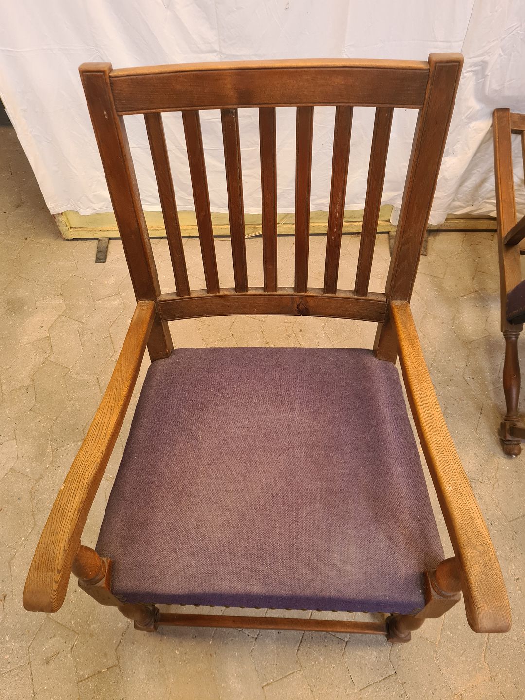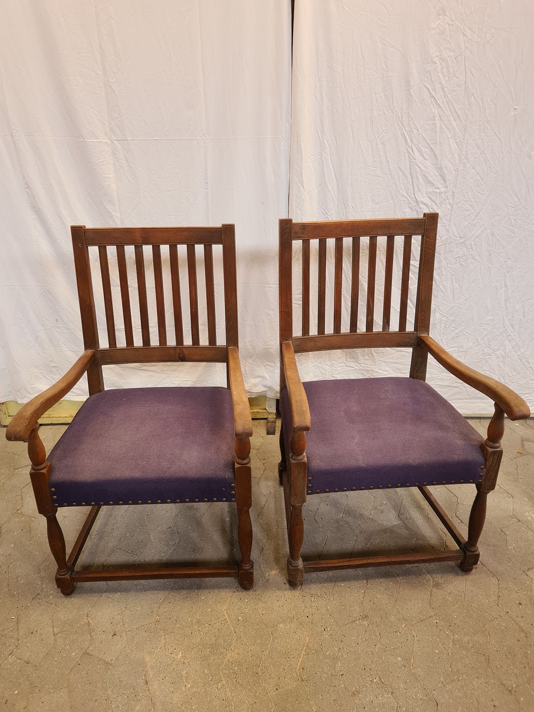 2 Armstole i massivt egetræ, fra 1940erne. De har brugsspor. Ryghøjde 103cm Sædehøjde 47cm Emne nummer: 90866