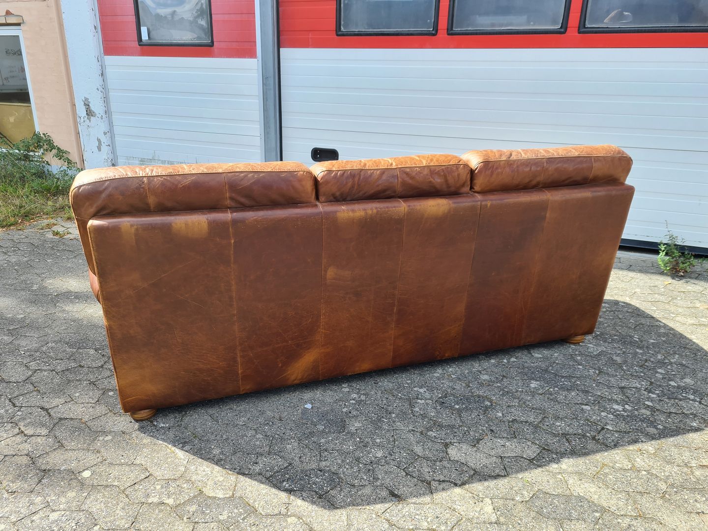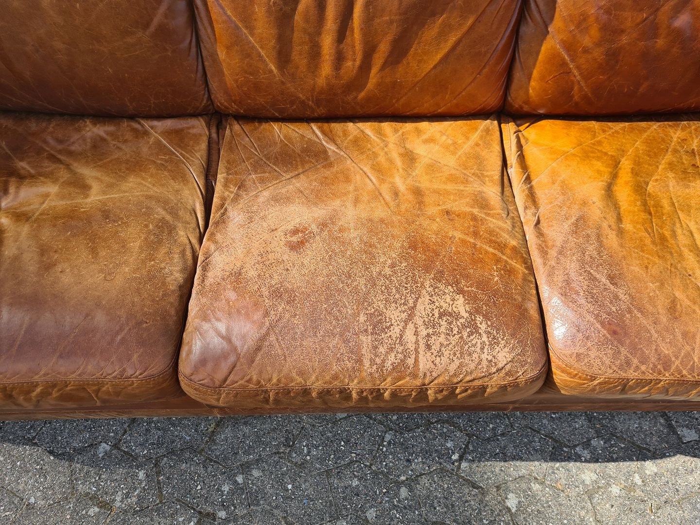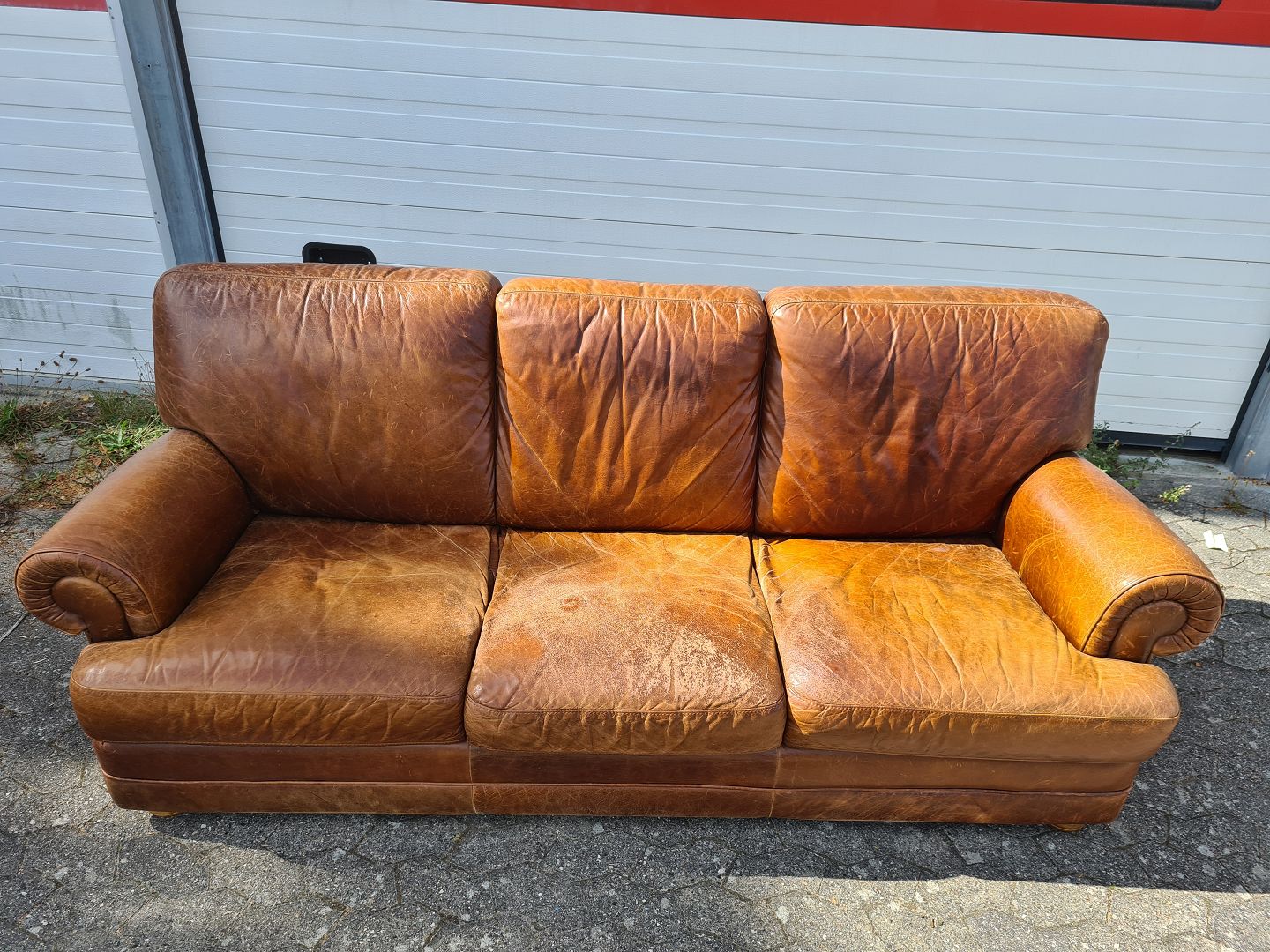 3 Personers lædersofa fra 2000erne. Den har brugsspor og slid på sædet. Ryghøjde 90cm Bredde 230cm Dybde 96cm Sædehøjde 44cm Emne nummer: 75851