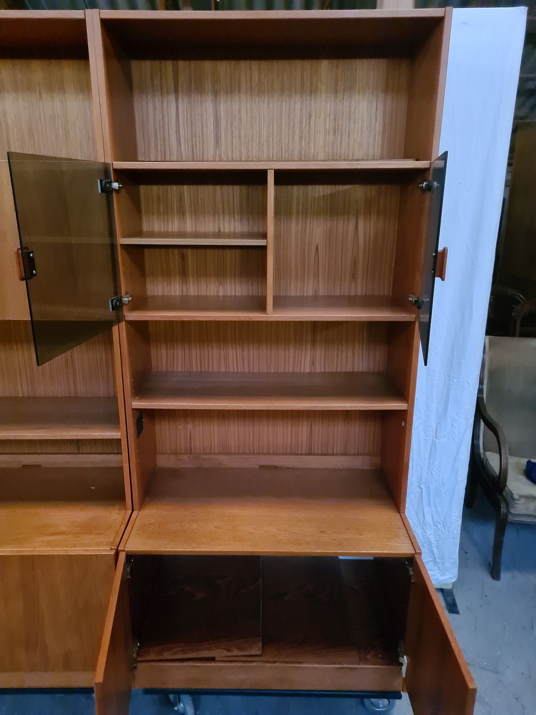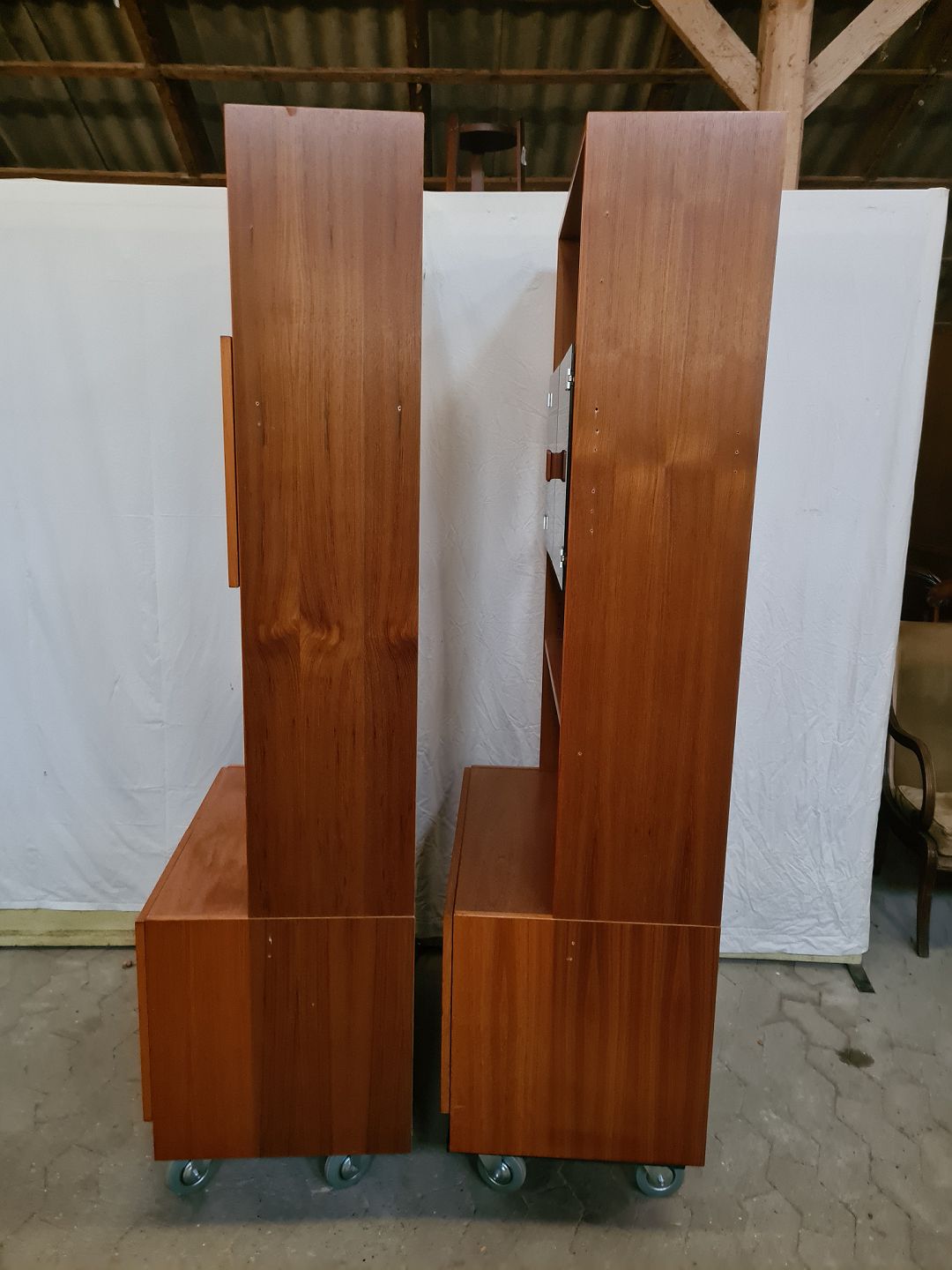 2 Reolsektioner i fineret teaktræ, fra 1970erne. De har brugsspor og der er savet i den side. Højde 180cm Bredde 82cm Dybde 49cm Emne nummer: 90873