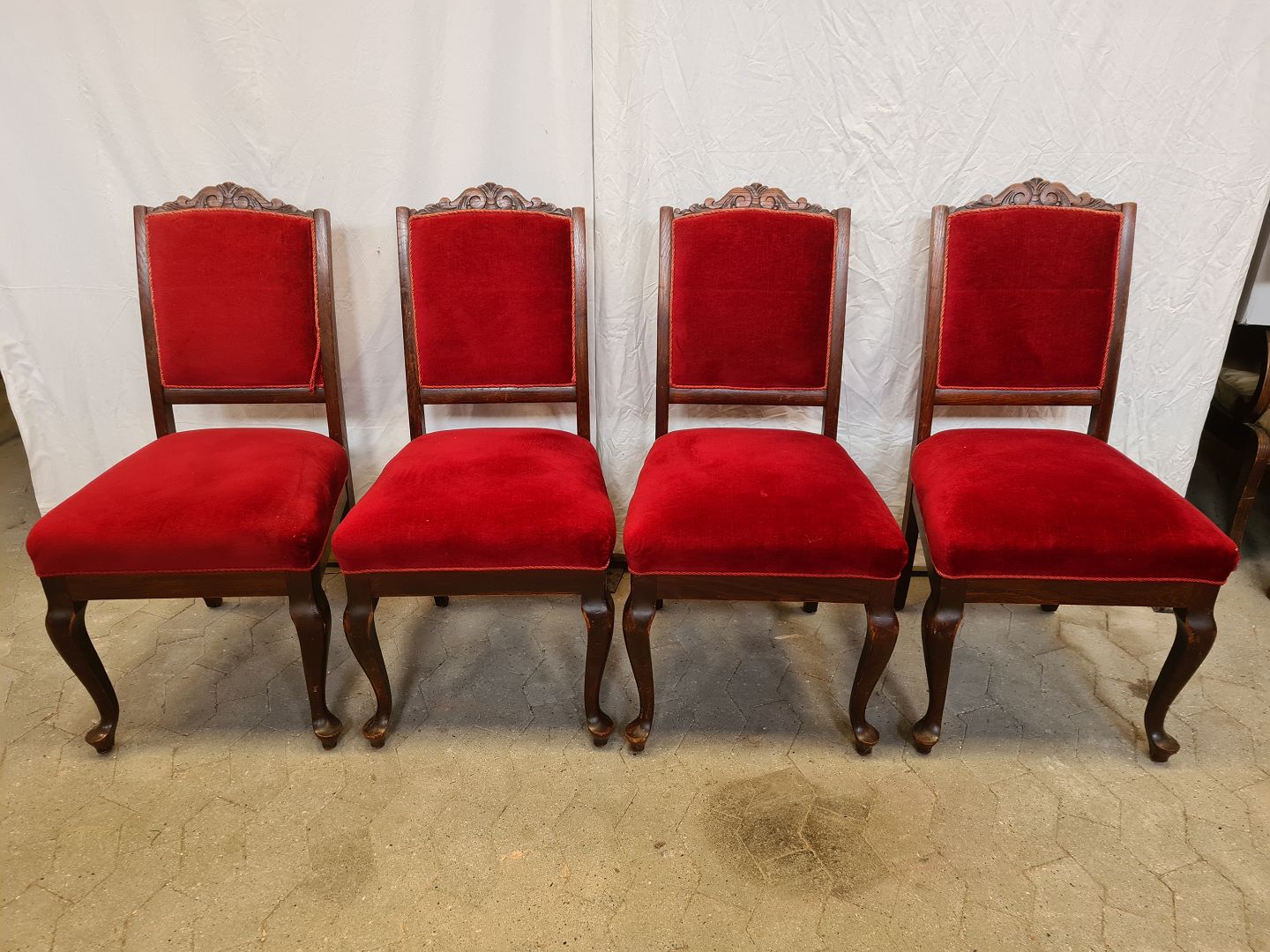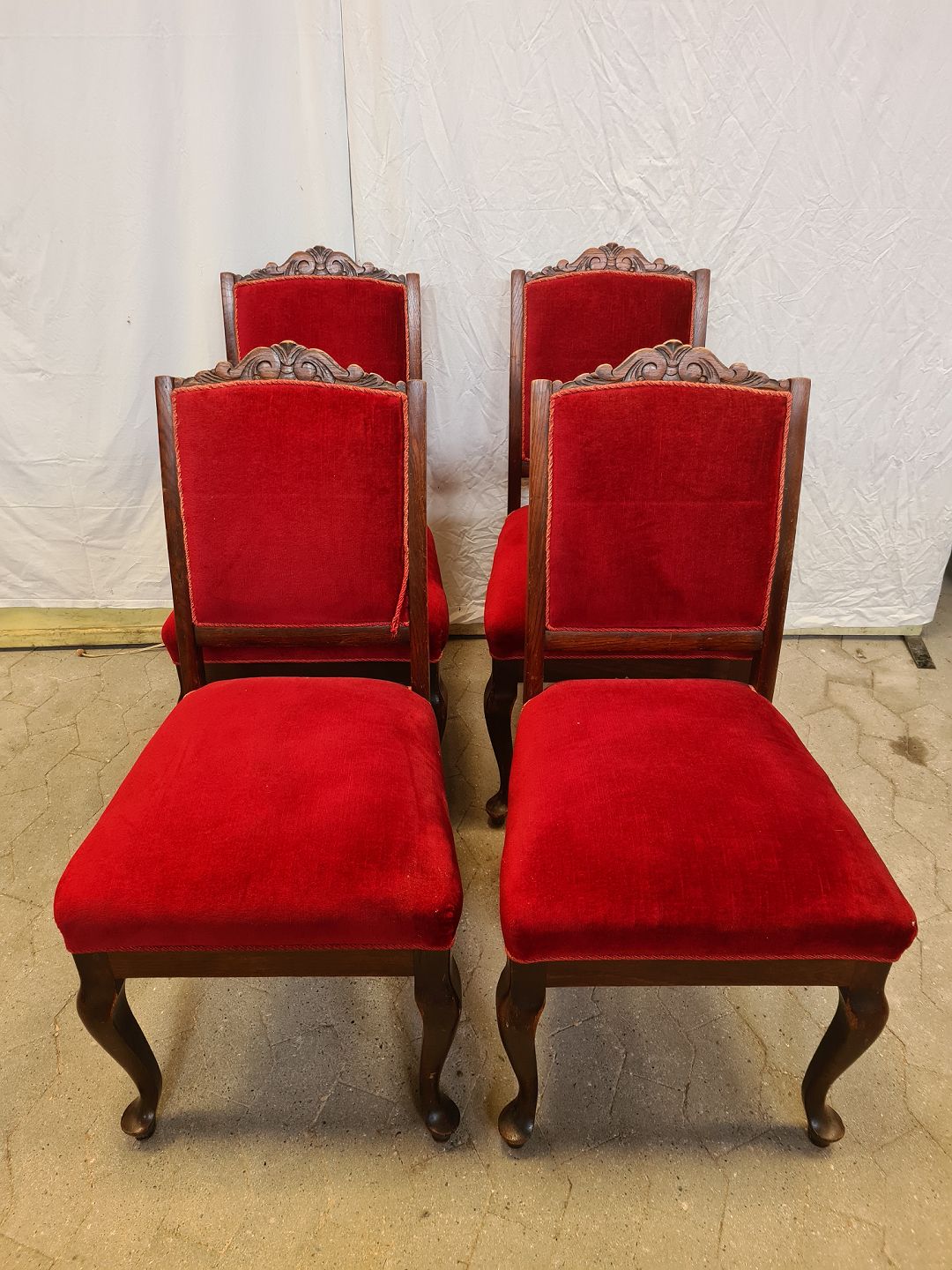 4 Salonstole i egetræ med velourbetræk, fra 1920erne.