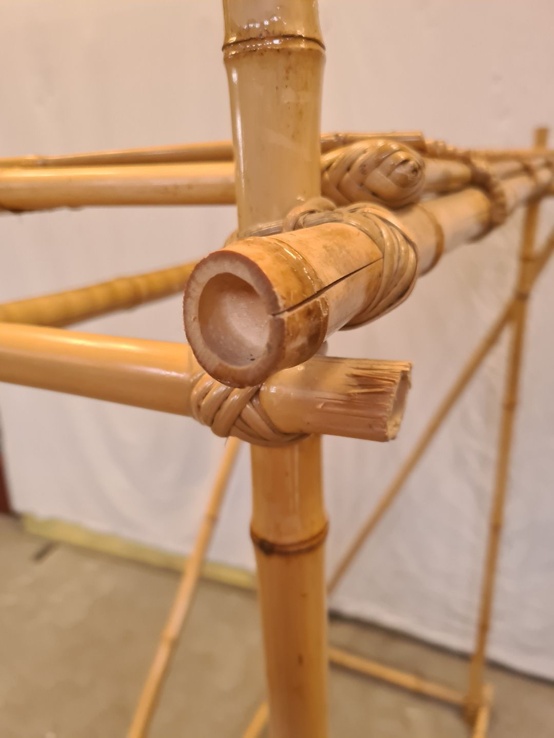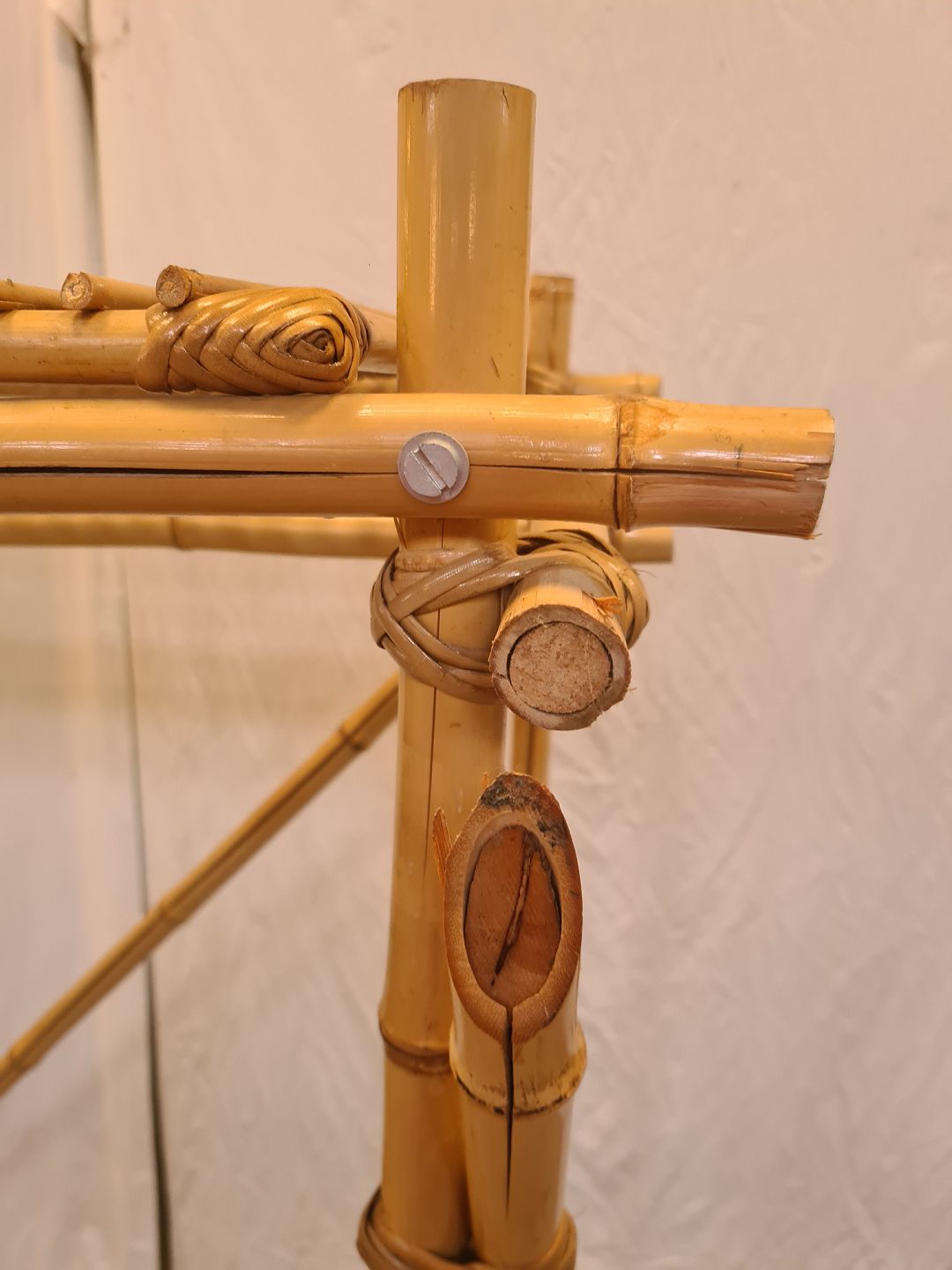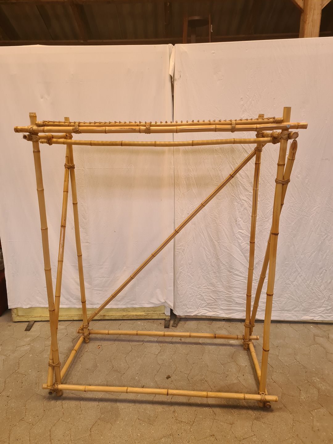 Tøjstativ i bambus til tøjbøjler og med hattehylde, fra 1990erne. Det har brugsspor og små defekter. Højde 160cm Bredde 142cm Dybde 65cm Emne nummer: 90950