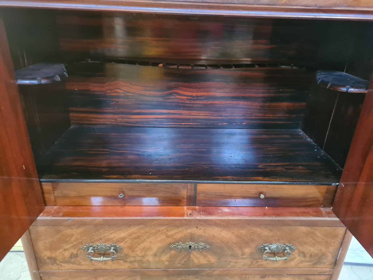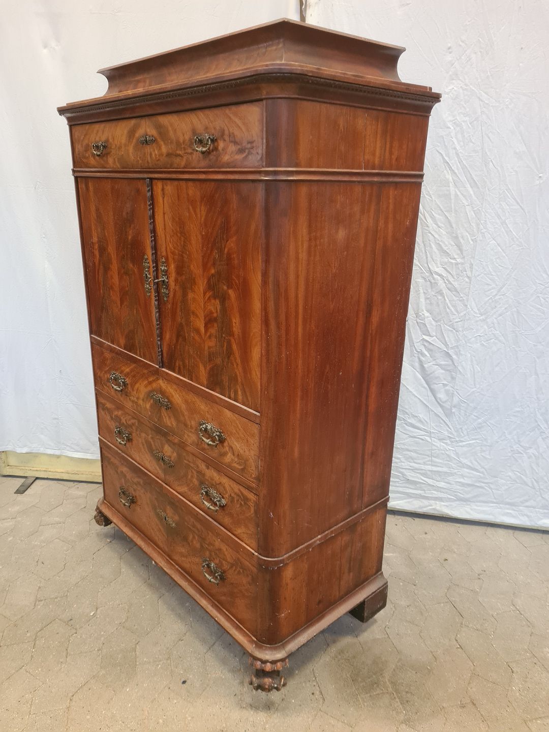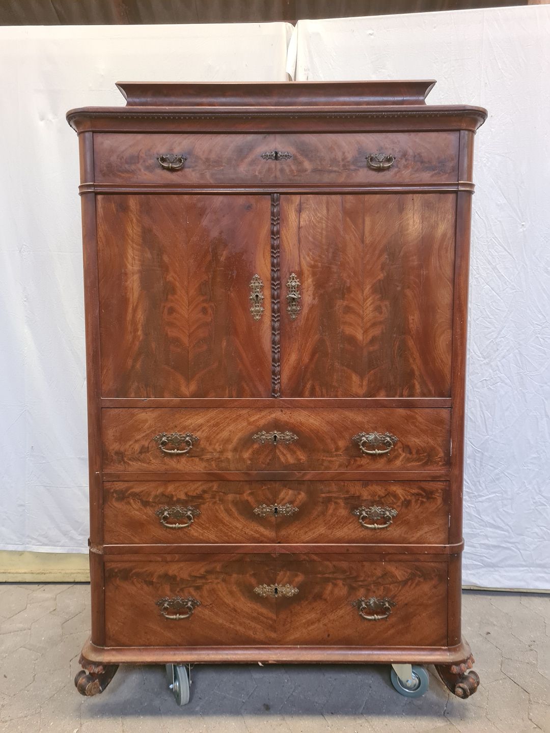 Skab i fineret mahogni, fra 1890erne. Det har brugsspor og små defekter. Højde 154cm Bredde 102cm Dybde 50cm Emne nummer: 90953