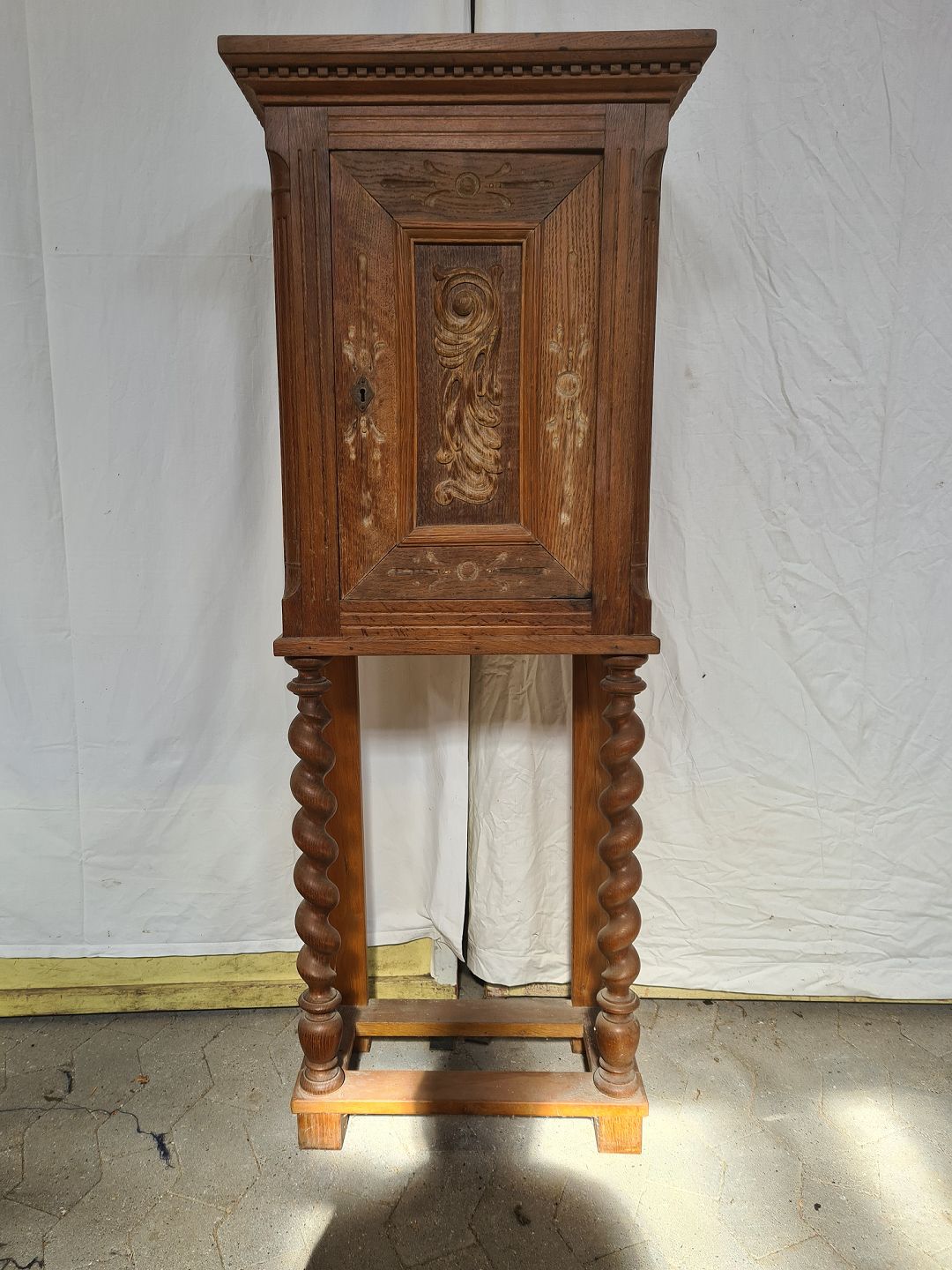 Skab i massivt egetræ, fra 1900erne. Det har brugsspor. Højde 140cm Bredde 54cm Dybde 29cm Emne nummer: 90968