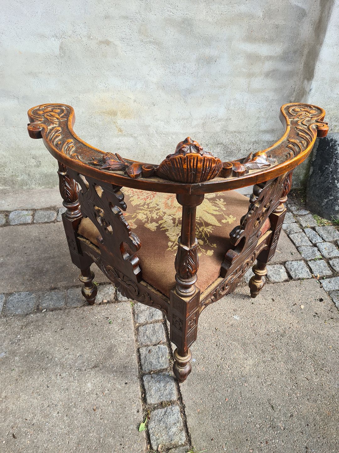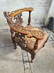 Hjørnestol fra 1920´erne i mahogni med udskæringer og broderet sæde. Fremstår pæn og velholdt. Dog en smule tyndslidt på sædet.