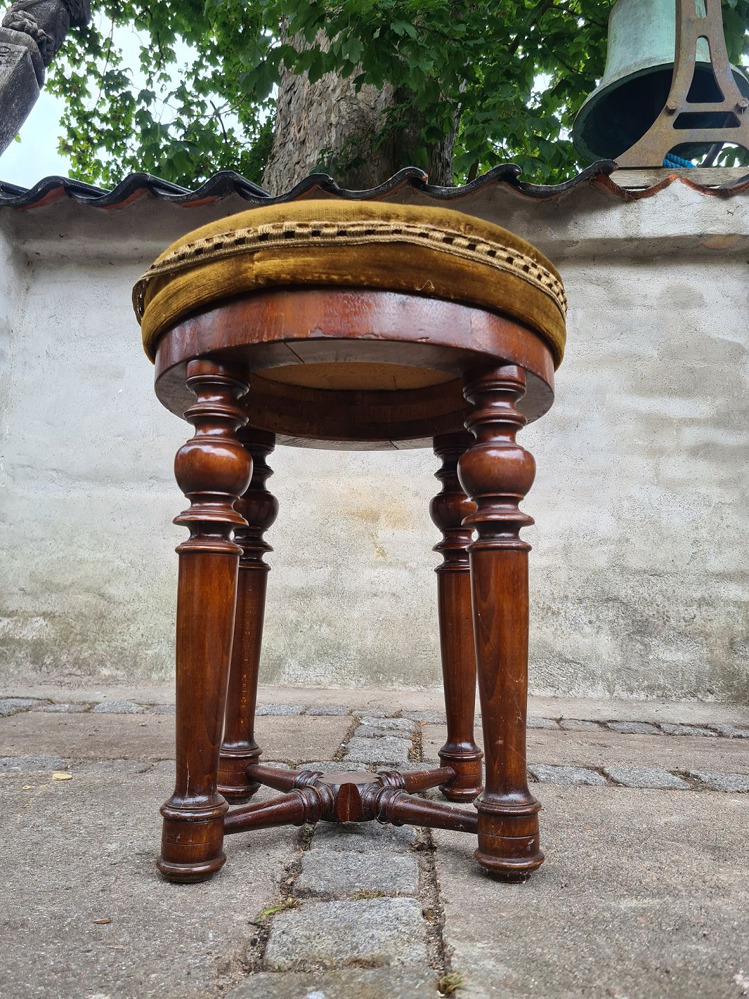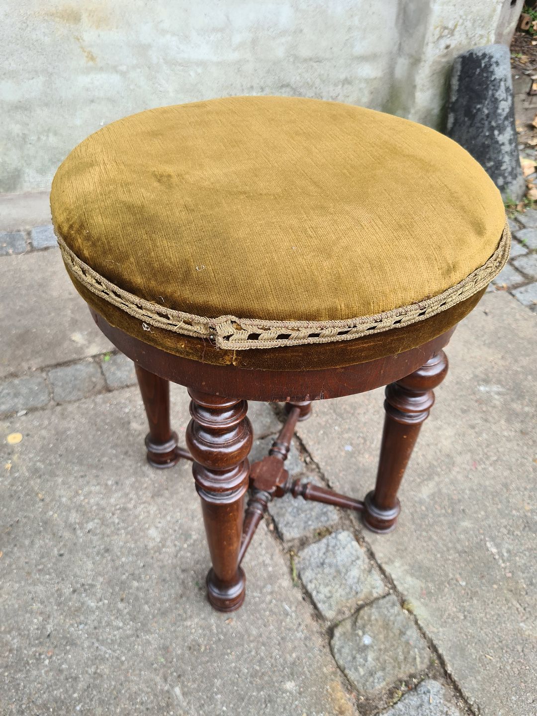 Velourbetrukket taburet fra 1930'erne i mahogni. Fremstår pæn og velholdt uden nævneværdige brugsspor. Højde 49 cm. Diameter 40 cm. Emne nummer: 80603