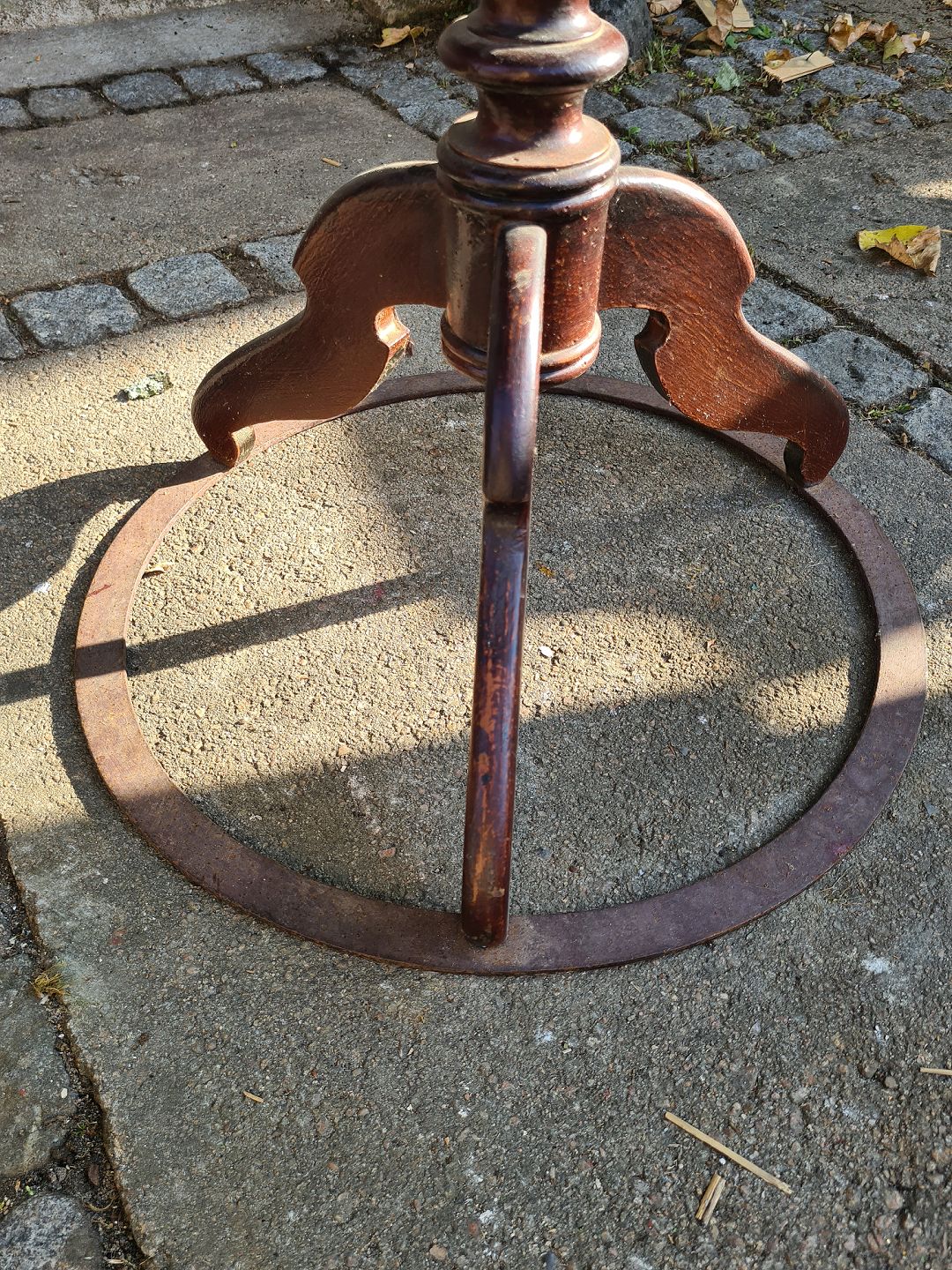 Højt lampebord fra 1940'erne i bejdset fyr. Fremstår med lettere overflade skrammer på pladen og en metal ring på foden for at sikre stabilitet. Højde 79 cm. Diameter 47 cm. Emne nummer: 80614