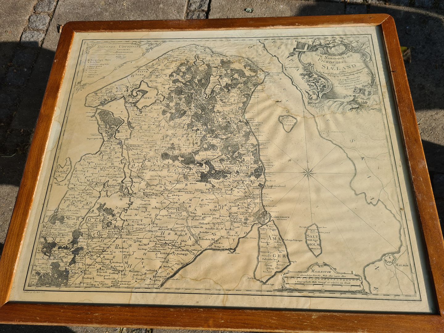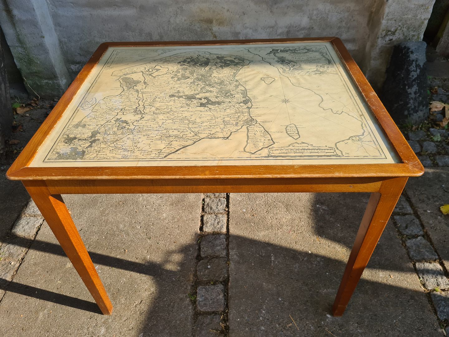 Sofabord fra 1940'erne I mahogni og glasplade. Under glaspladen er ilagt et kort over nord-øst Sjælland. Kortet har lettere fugtskjolder i bunden. Selve bordet er i fin stand og udmærket stabilt.