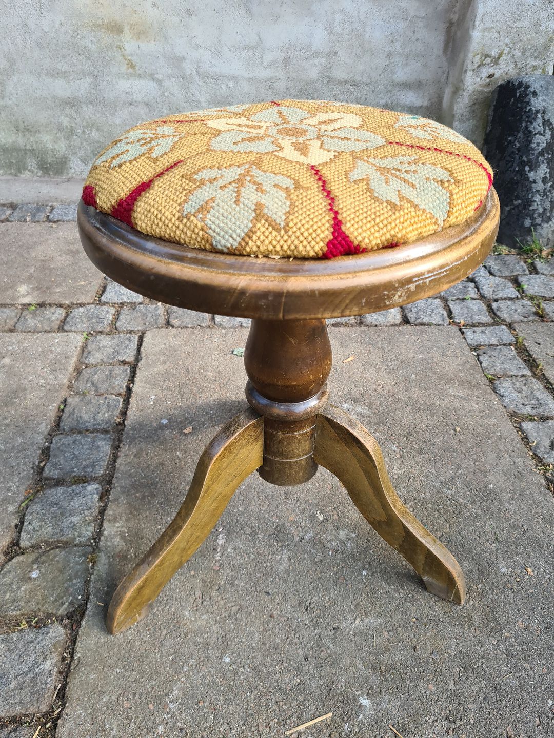 Taburet fra 1950'erne i mahogni og med broderi. Fremstår pæn og velholdt uden nævneværdige brugsspor.