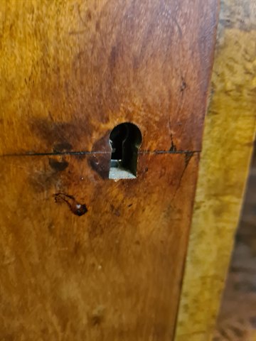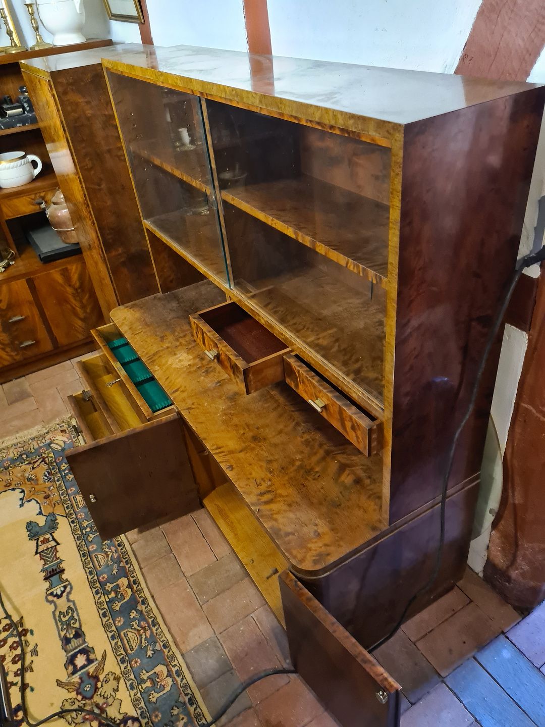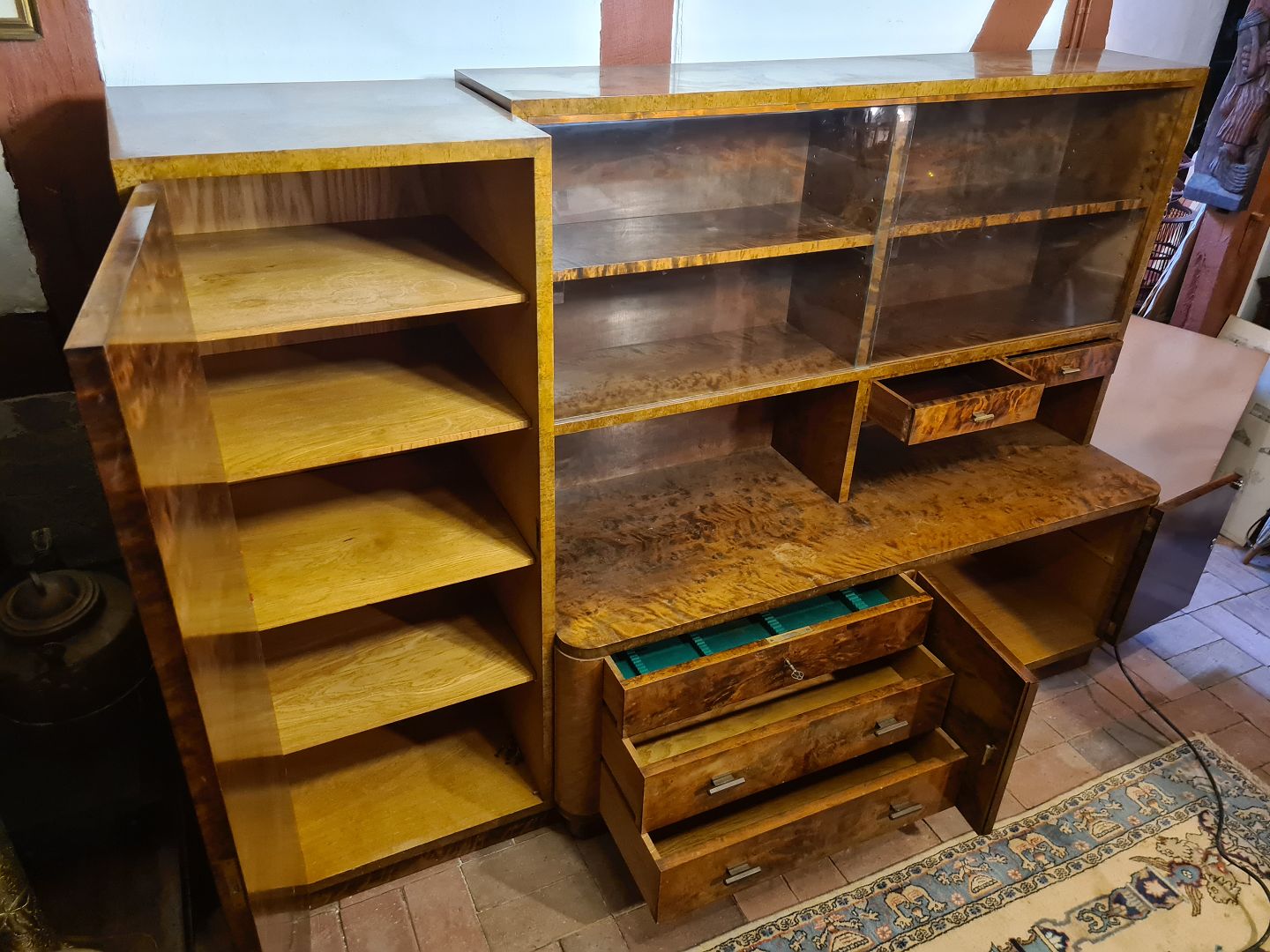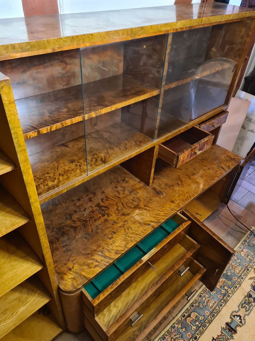 Funkis inspireret dækketøjsskab fra 1940'erne I birk og med glas skydelåger. Fremstår pænt, velholdt og udmærket funktionsdygtigt. Dog mangler en nøglehulskrans på skabsågen. (Billede) Højde 140 cm. Bredde 200 cm. Dybde 53 cm. Emne nummer: 80623