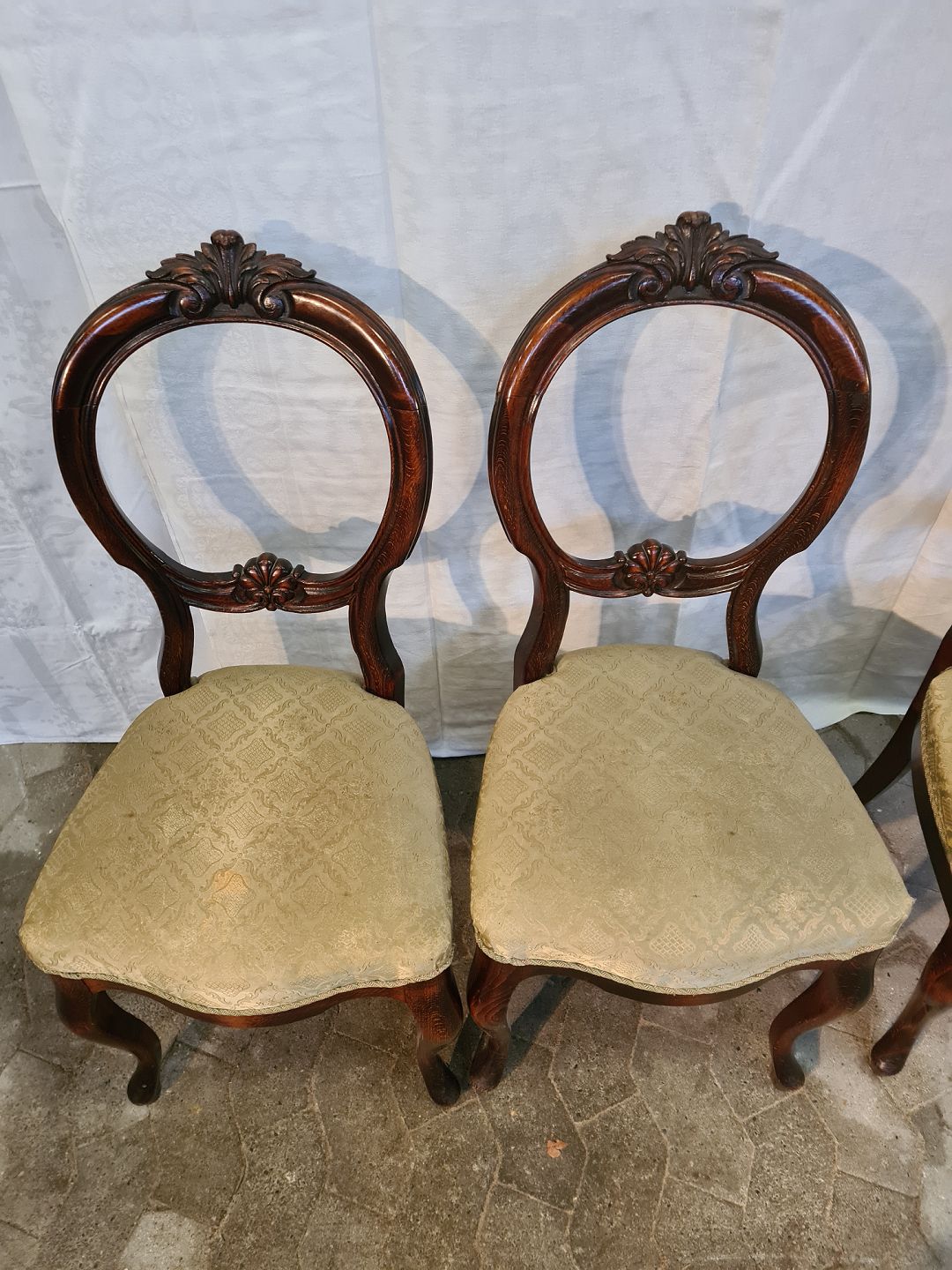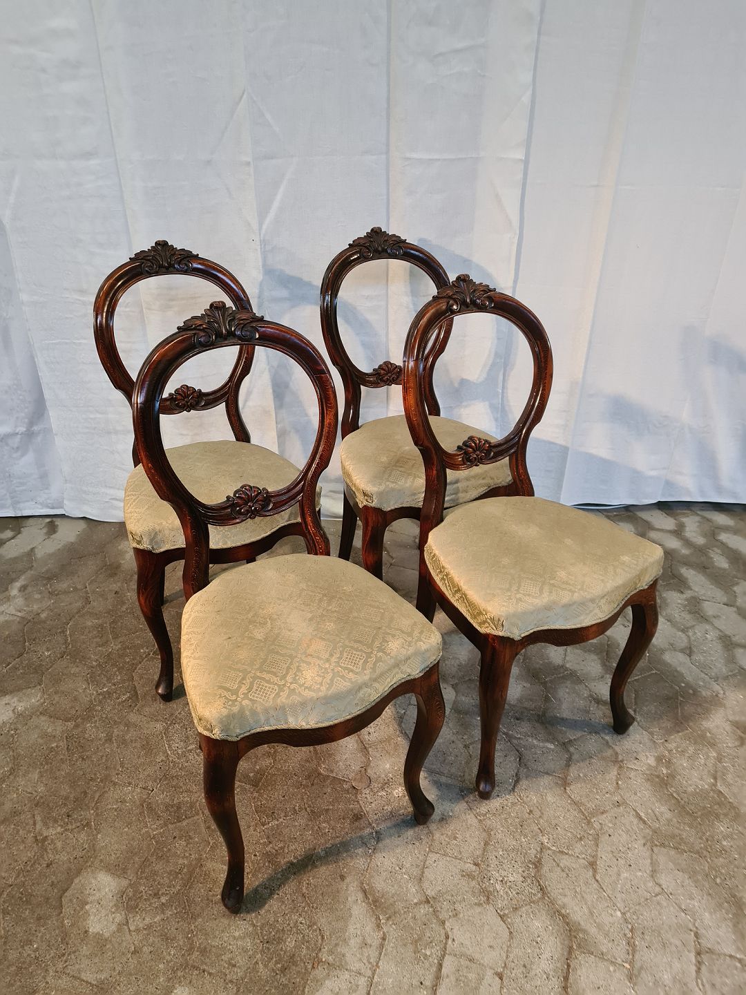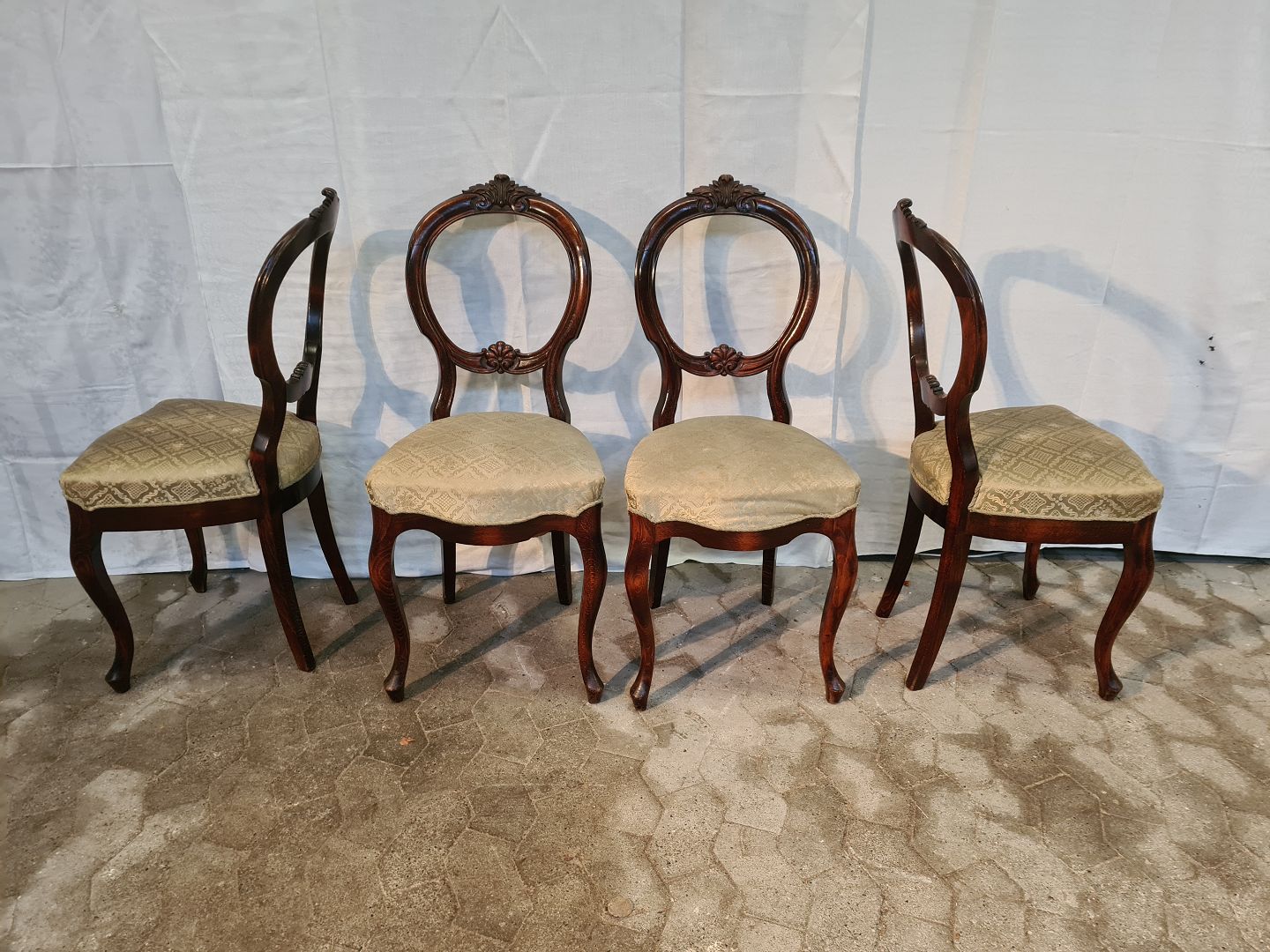 4 Salonstole i bøgetræ, fra 1910erne. Betrækket har slid. Ryghøjde 95cm Sædehøjde 48cm Emne nummer: 91025
