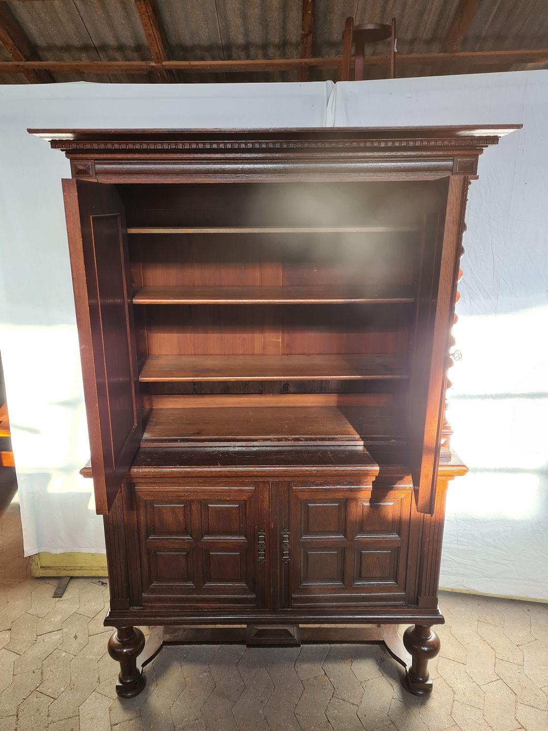 Skab i fineret og massivt egetræ, fra 1930erne. Det har brugsspor. Højde 183cm Bredde 123cm Dybde 43cm Emne nummer: 91046