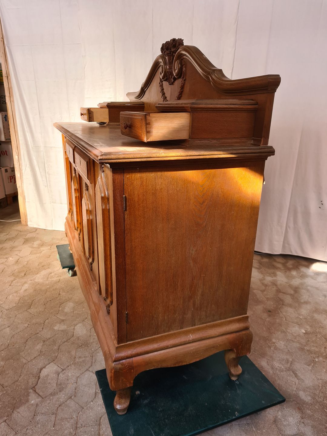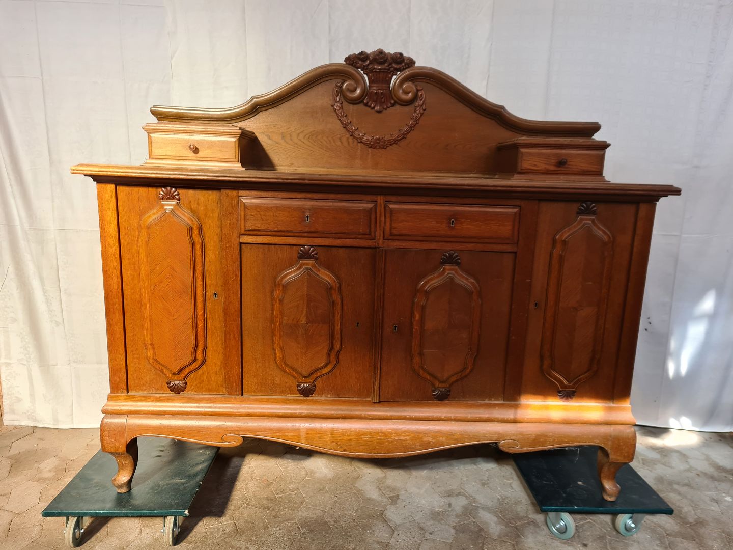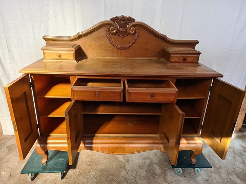 Skænk i fineret og massivt egetræ, fra 1920erne. Den har brugsspor. Højde 152cm Pladehøjde 109cm Bredde 182cm Dybde 63cm Emne nummer: 91049