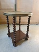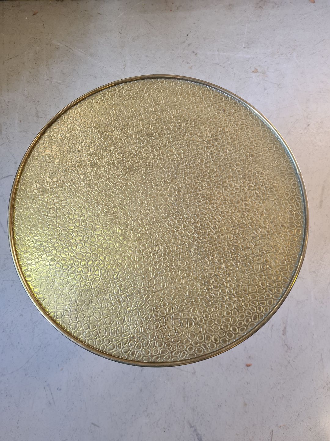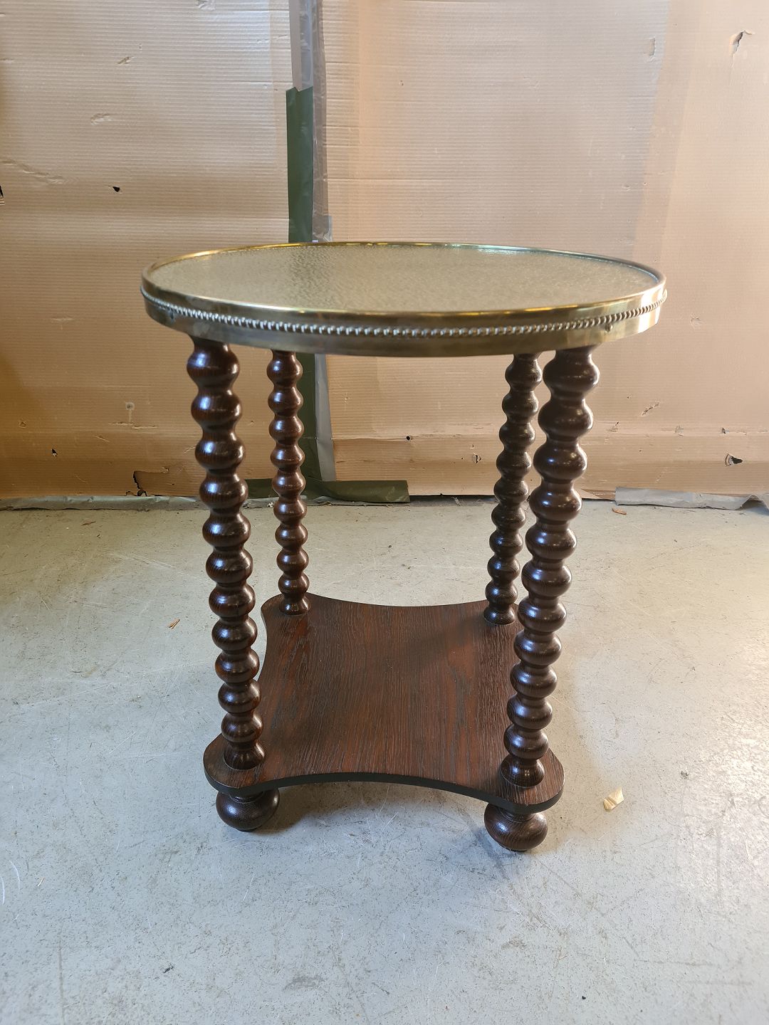 Lampebord i egetræ og messing, fra 1970erne. Det har brugsspor. Højde 60cm Diameter 50cm Emne nummer: 75961