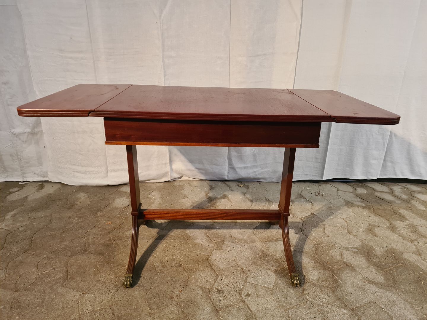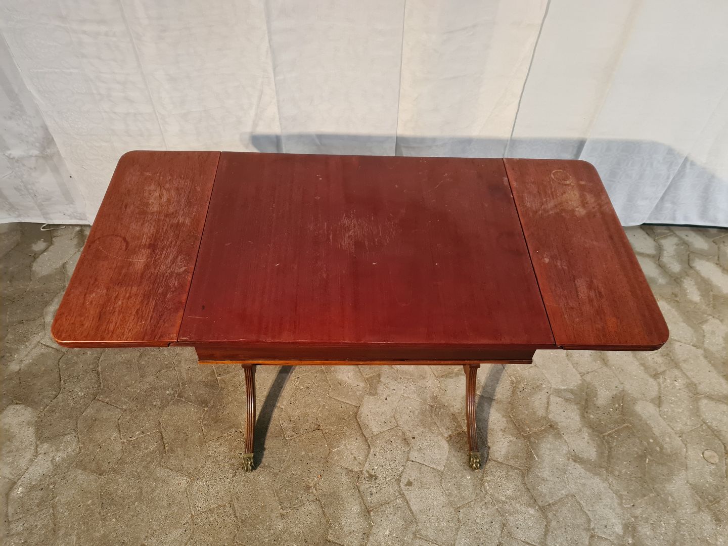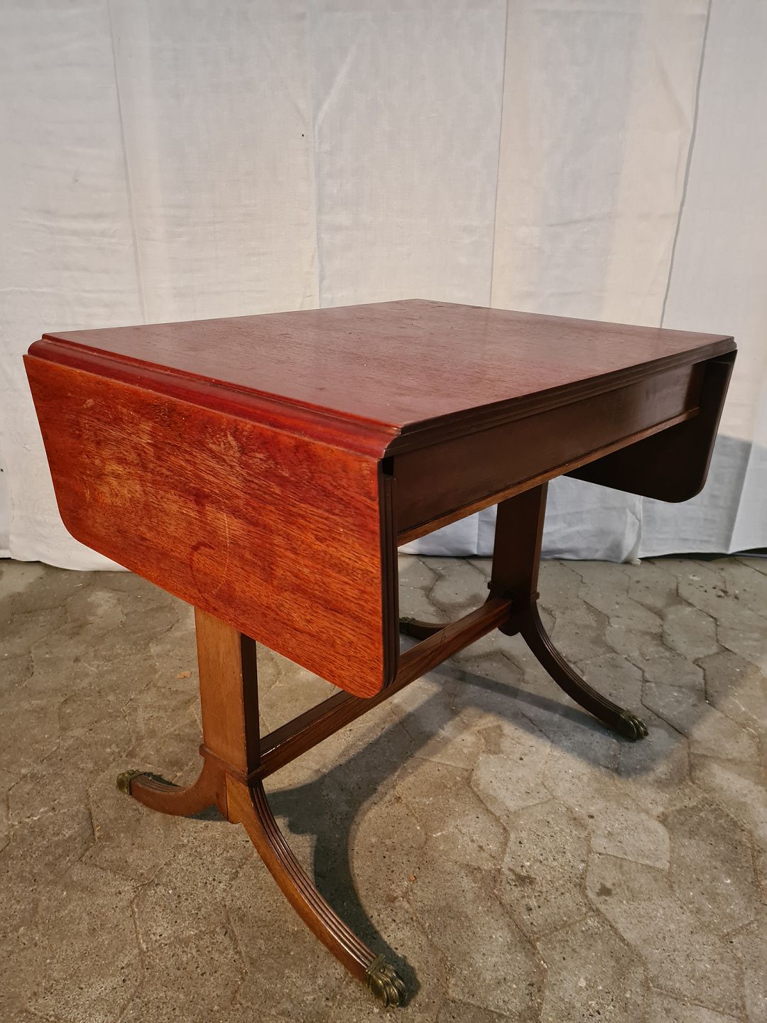 Sofabord i fineret mahogni, fra 1980erne. Det har brugsspor. Højde 63cm Bredde 52cm Længde 70cm Længde med klapper 110cm Emne nummer: 91058