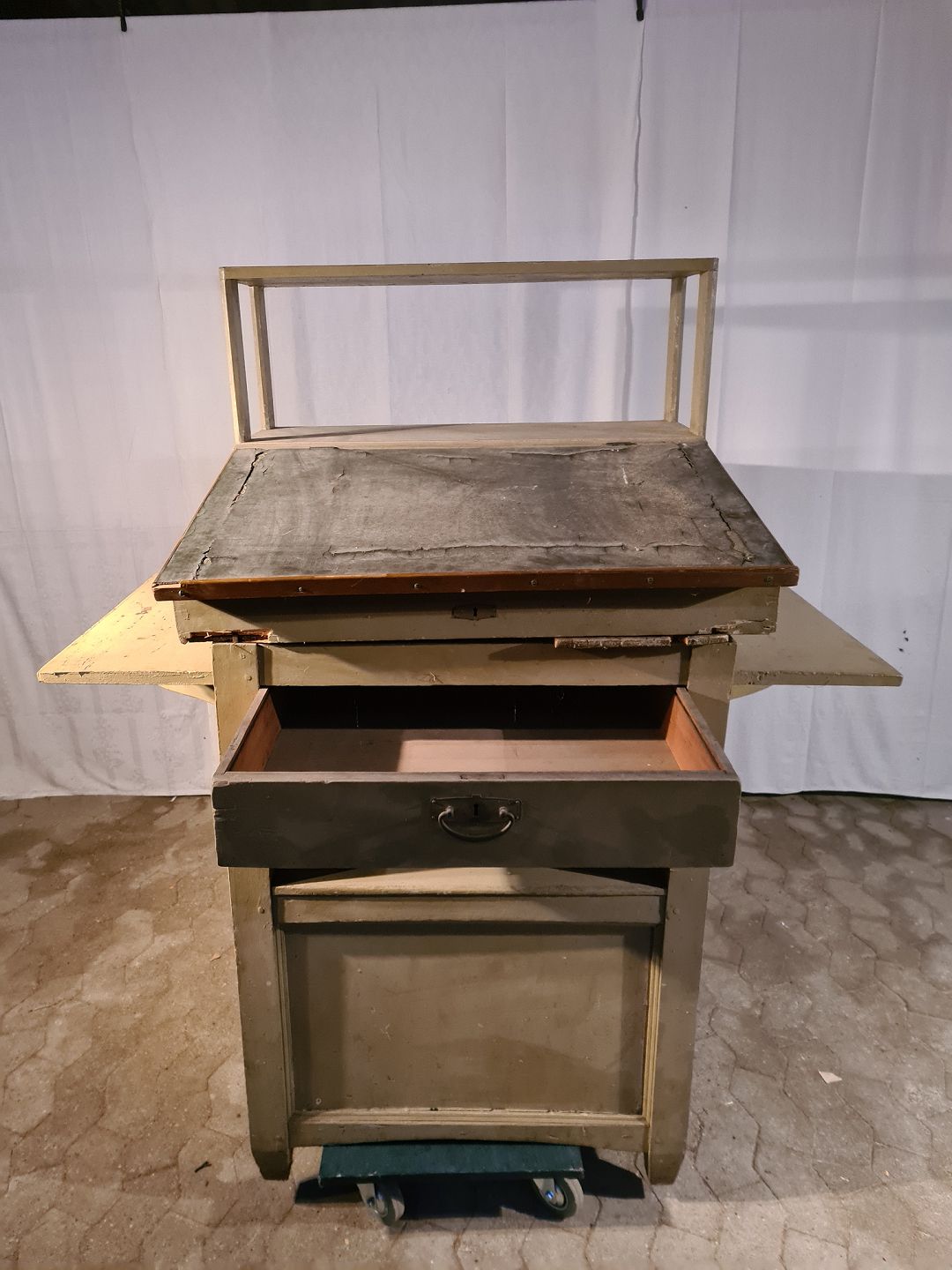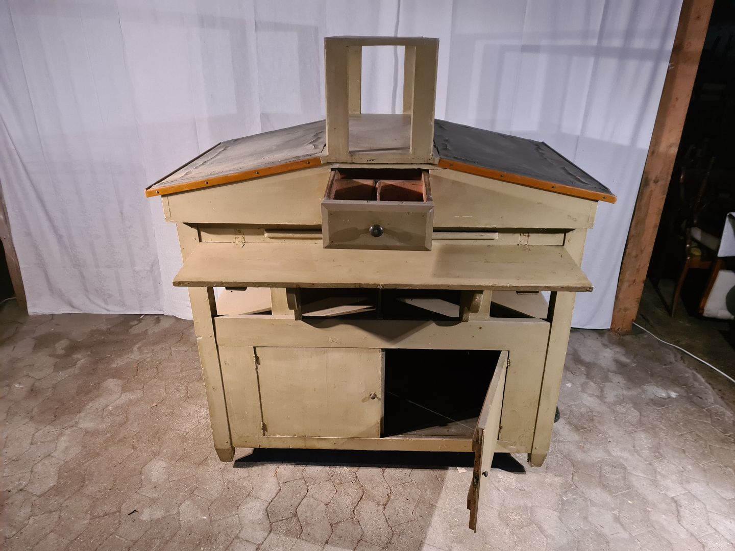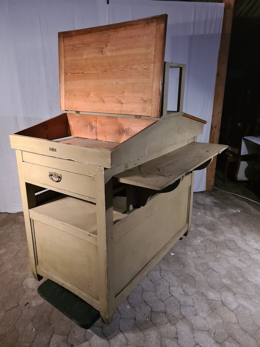 Malet dobbelt skrivepult i massivt fyrretræ, fra 1910-1920erne. Den har brugsspor og små defekter. Højde 156cm Bredde 88cm Længde 144cm Emne nummer: 91089