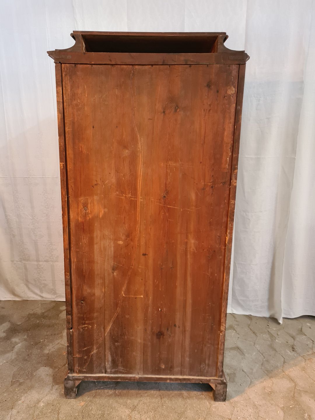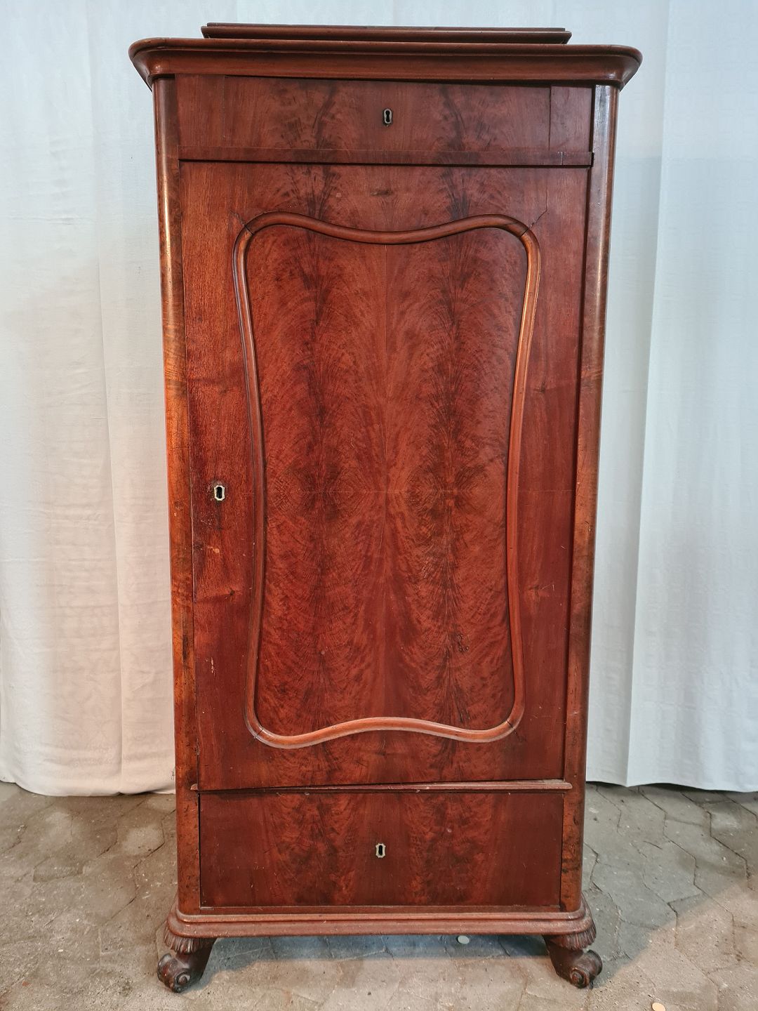 Skab i fineret mahogni, fra 1900erne. Det har brugsspor. Højde 158cm Bredde 78cm Dybde 48cm Emne nummer: 91118
