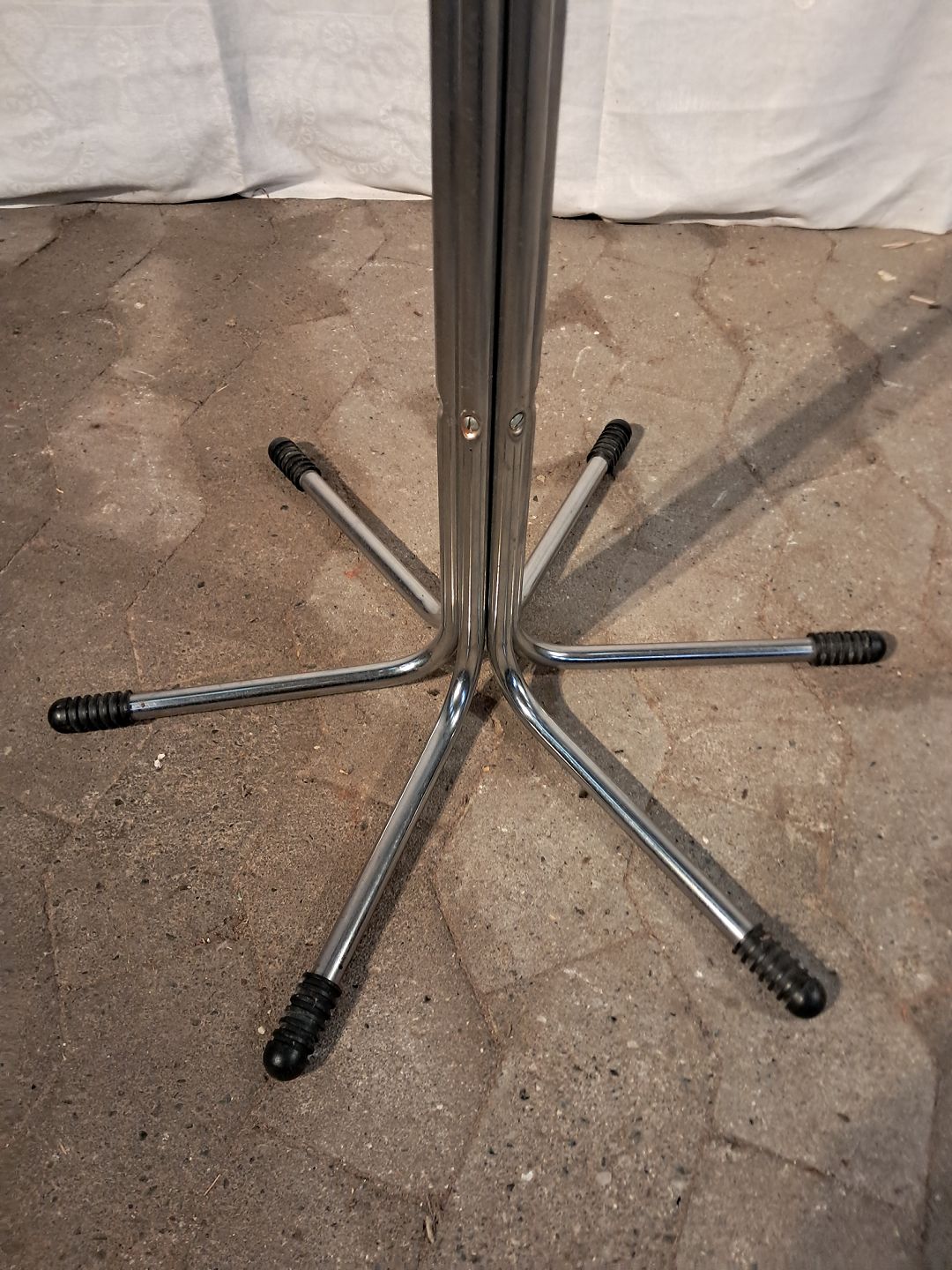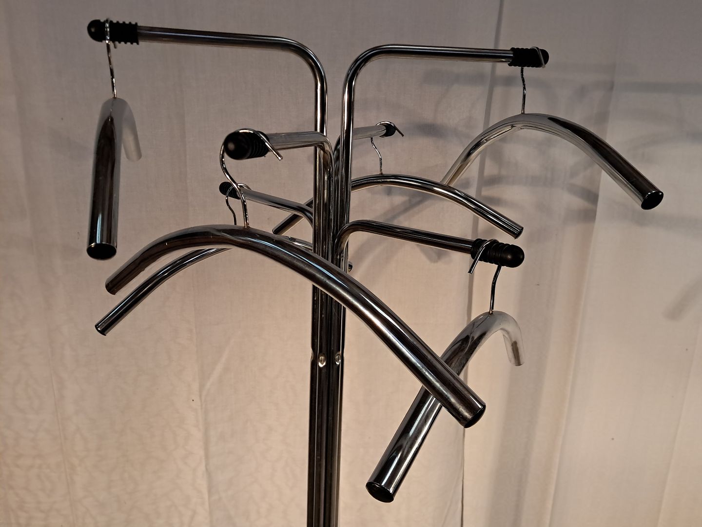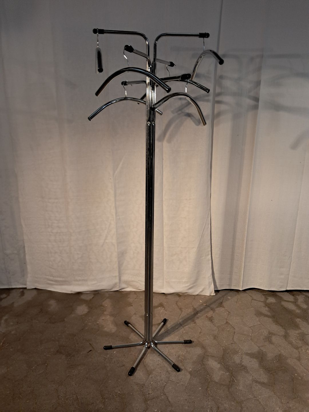 Stumtjener i metal med 6 stk. metalbøjler, fra 1990erne. Den har brugsspor. Højde 169cm Diameter 55cm Emne nummer: 91135