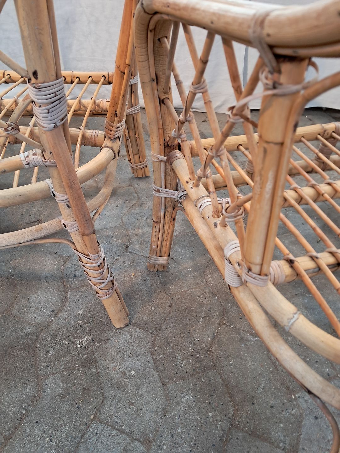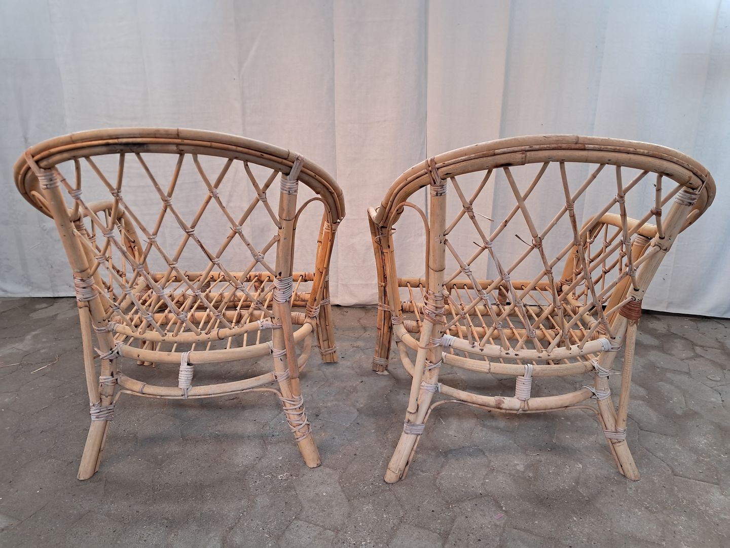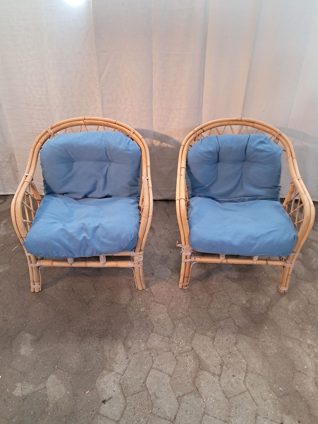 2 Kurvestole i bambus, fra 1990erne. De har brugsspor og små defekter. Ryghøjde 79cm Sædehøjde 35cm Emne nummer: 91160
