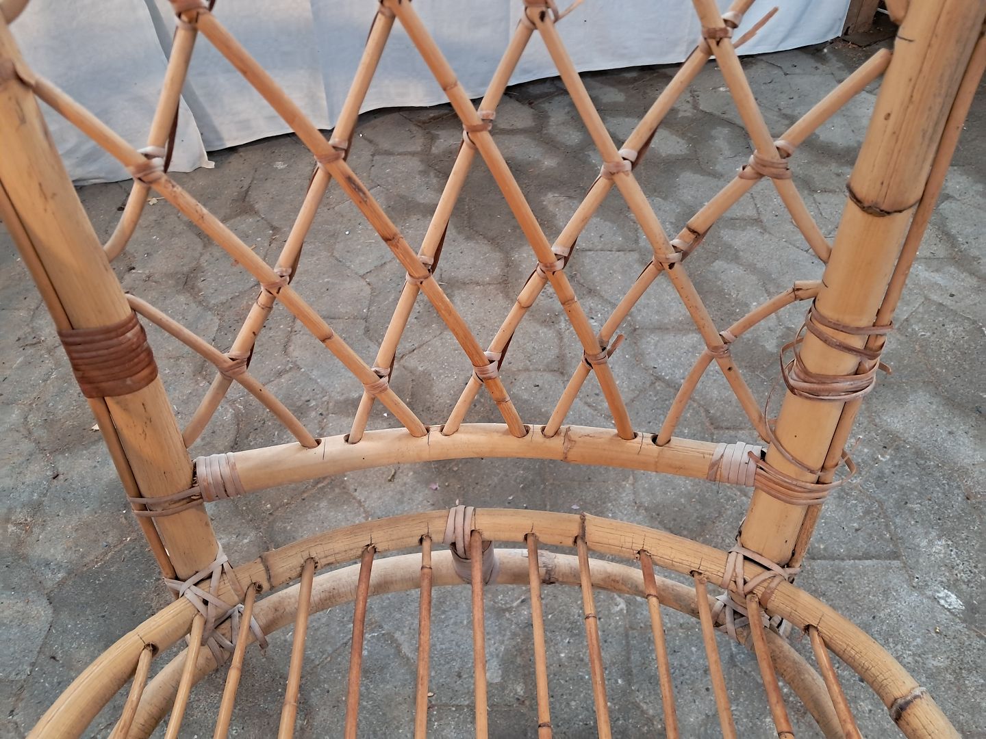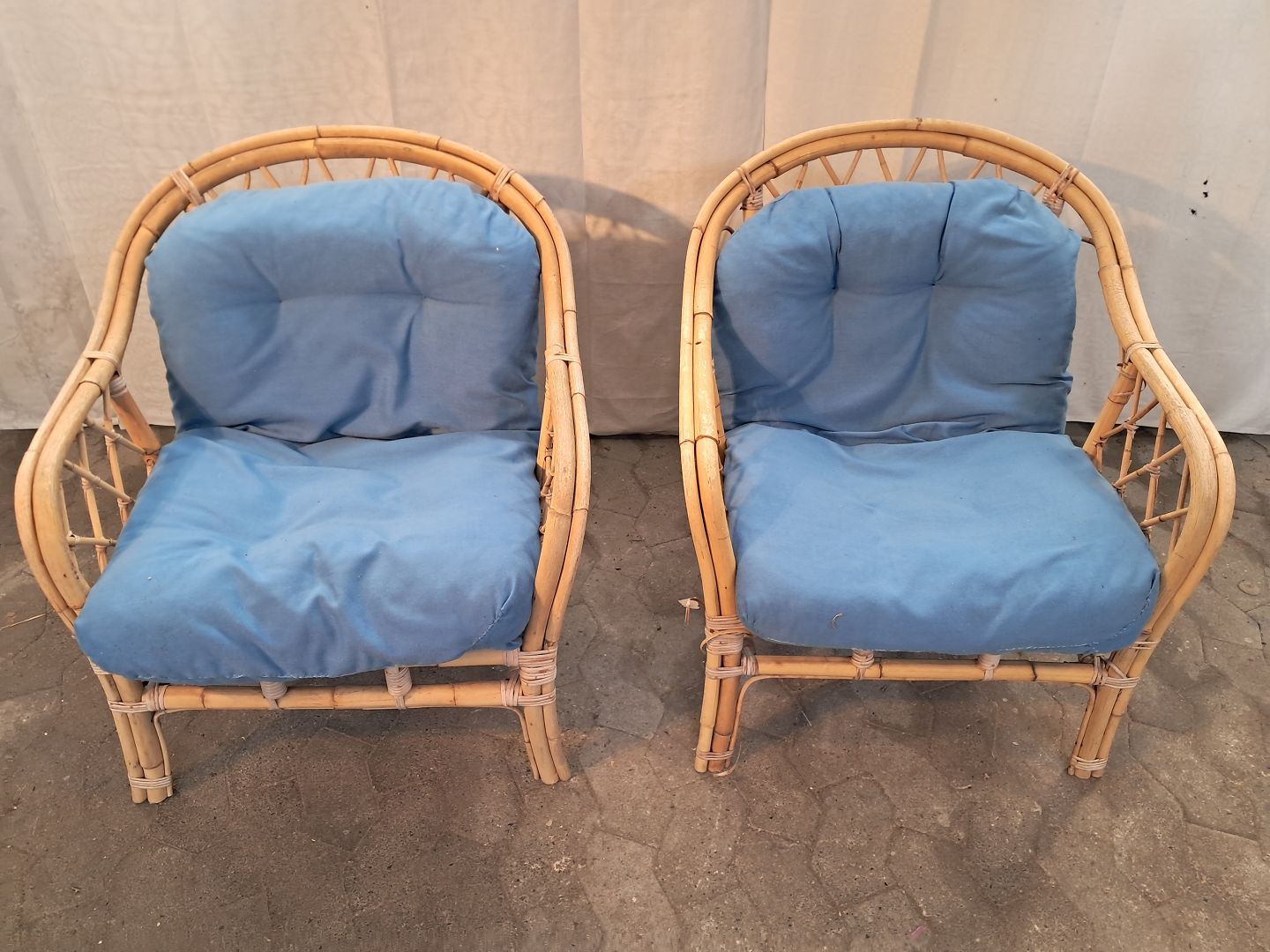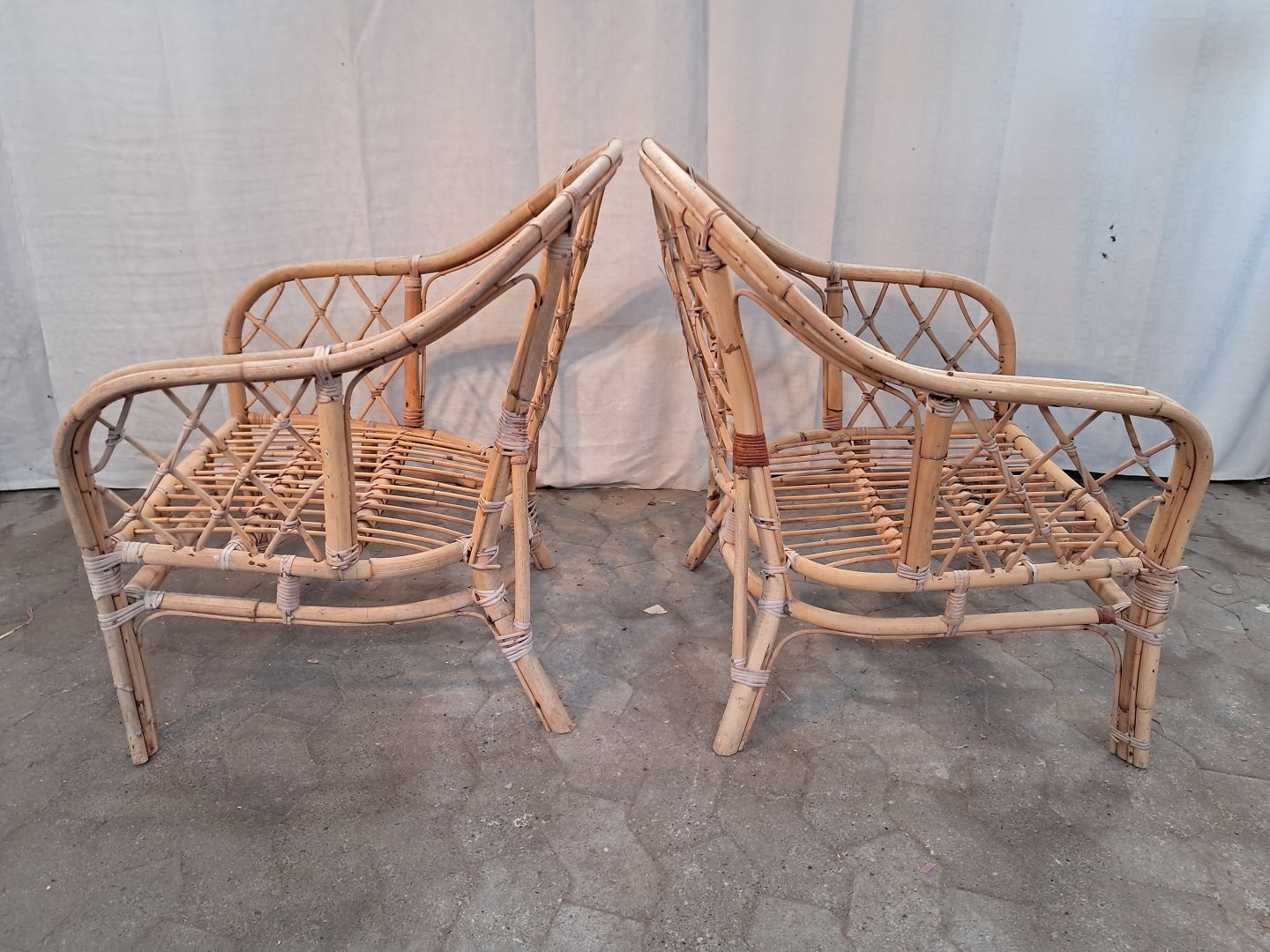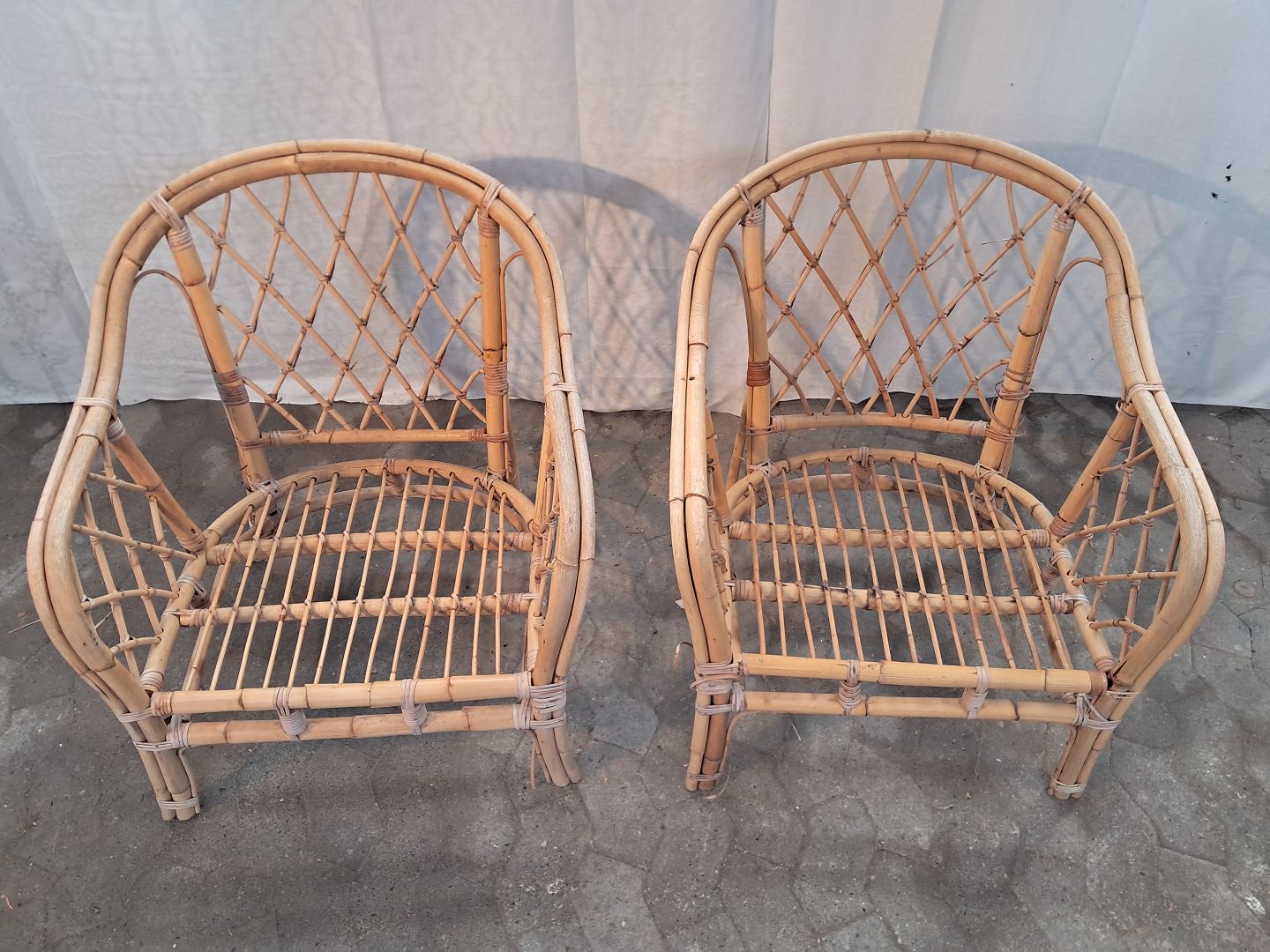2 Kurvestole i bambus, fra 1990erne. De har brugsspor og små defekter. Ryghøjde 79cm Sædehøjde 35cm Emne nummer: 91160