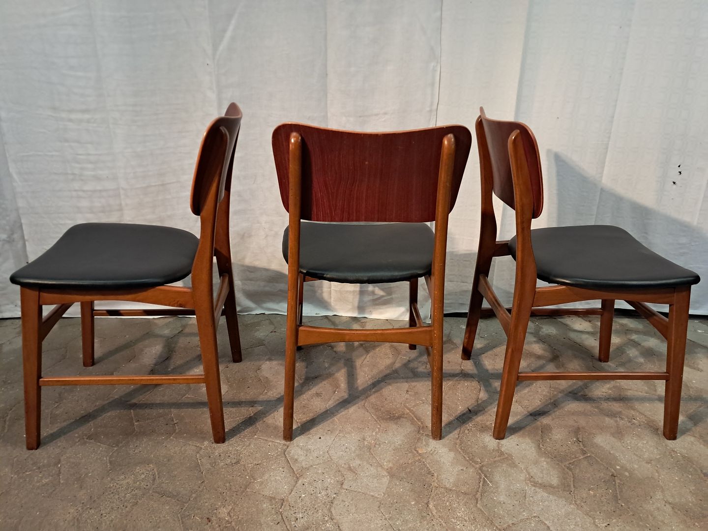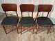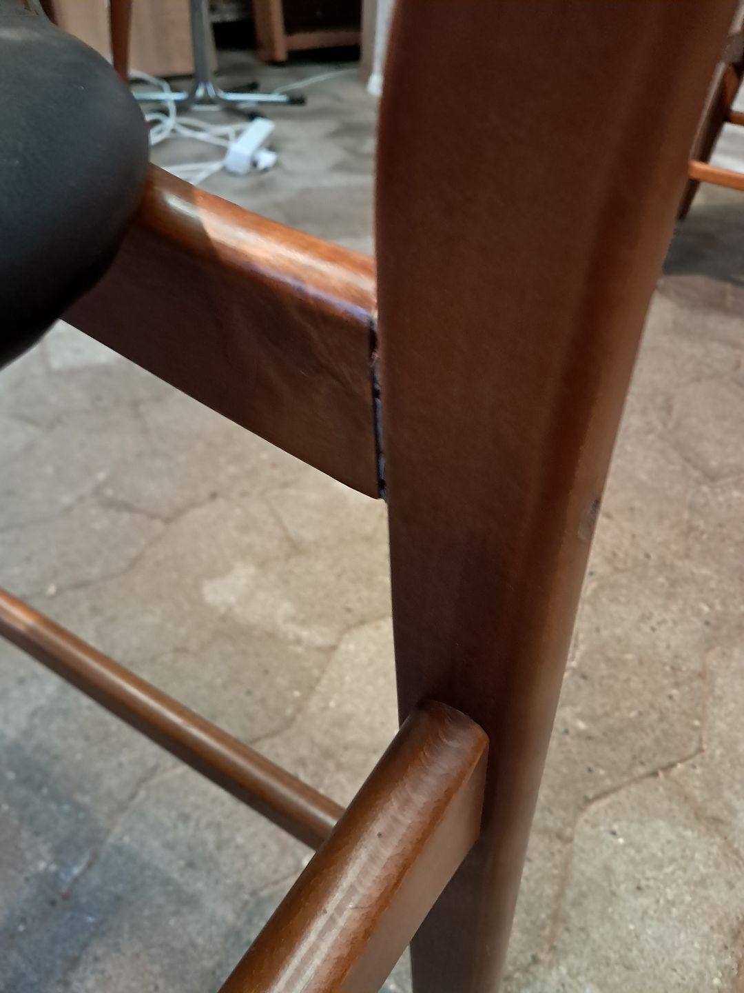 6 Stole i massivt bøgetræ og fineret teaktræ med kunstlæder betræk, fra 1960erne. De har små brugsspor , men den en rokker lidt. Ryghøjde 81cm Sædehøjde 46cm Emne nummer: 91204