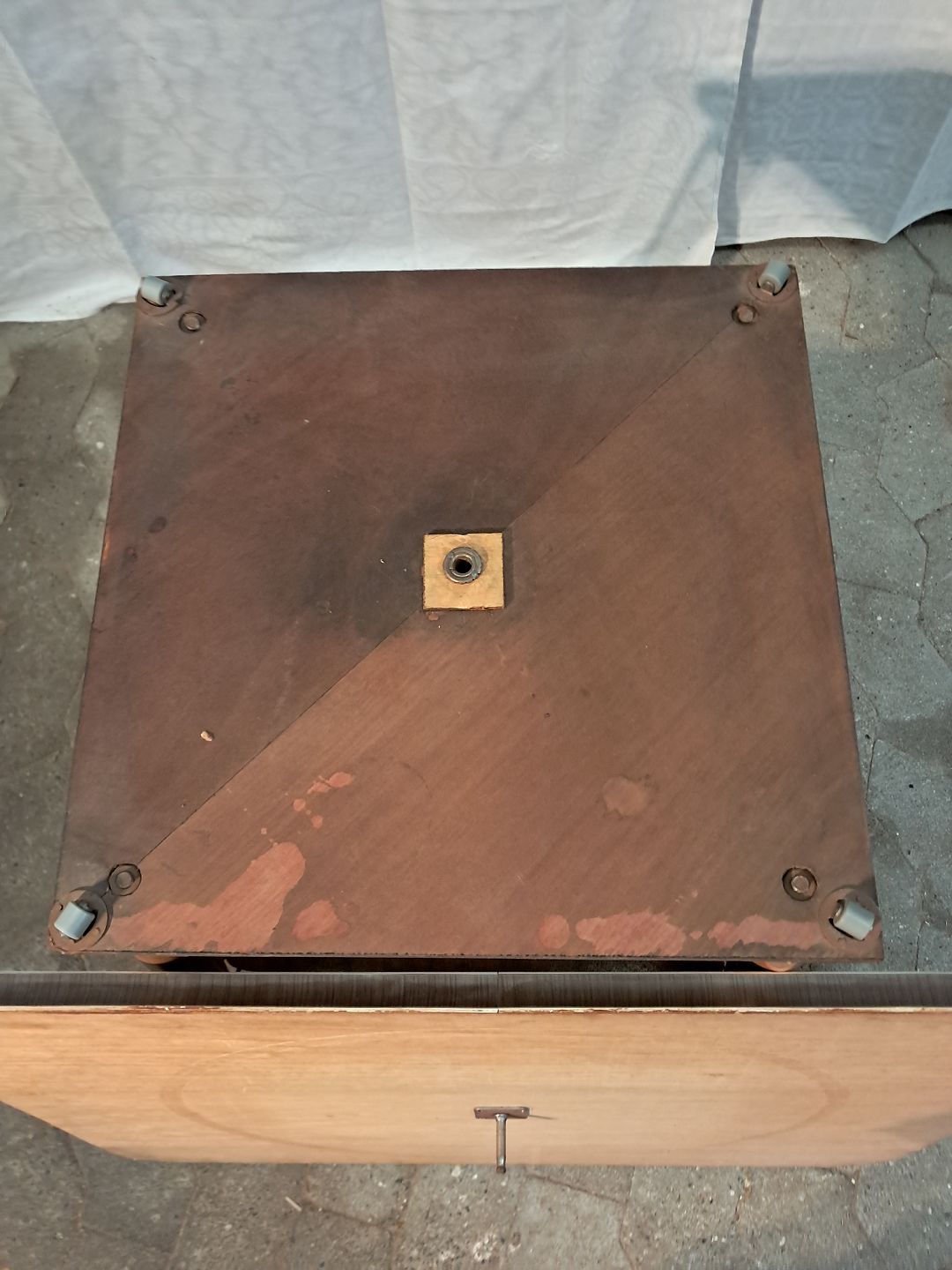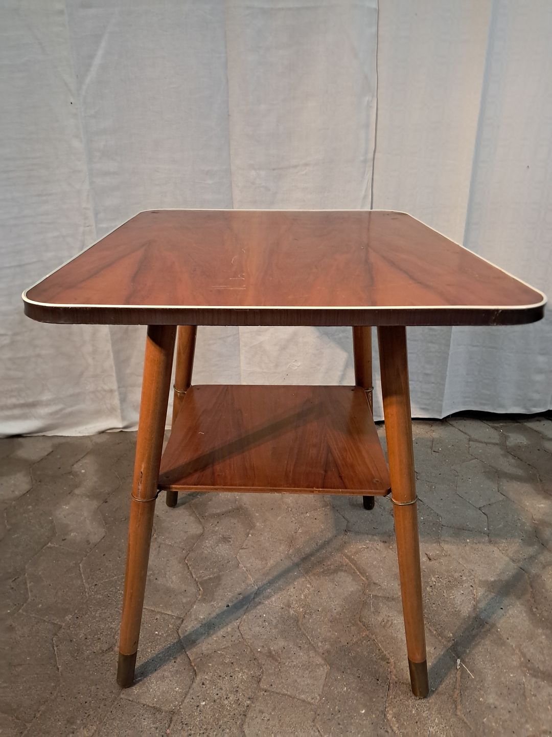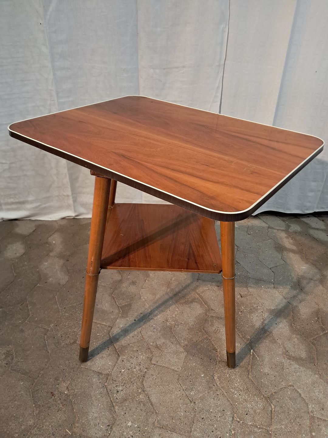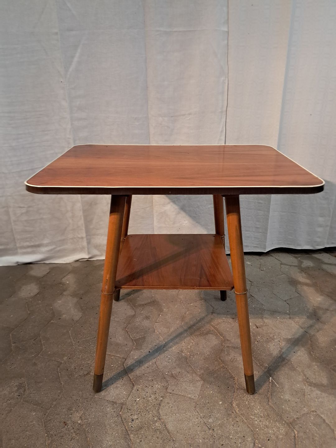 Bord i massivt bøgetræ med plade i fineret nødetræ og plastkant, fra 1950erne. Det har brugsspor. Højde 67cm Bredde 56cm Længde 73cm Emne nummer: 91208