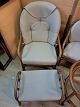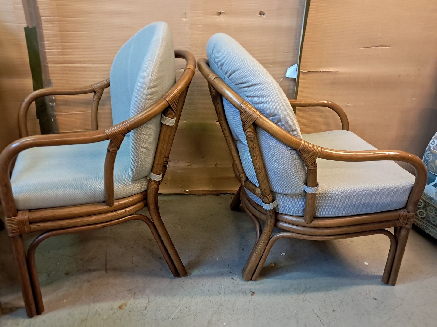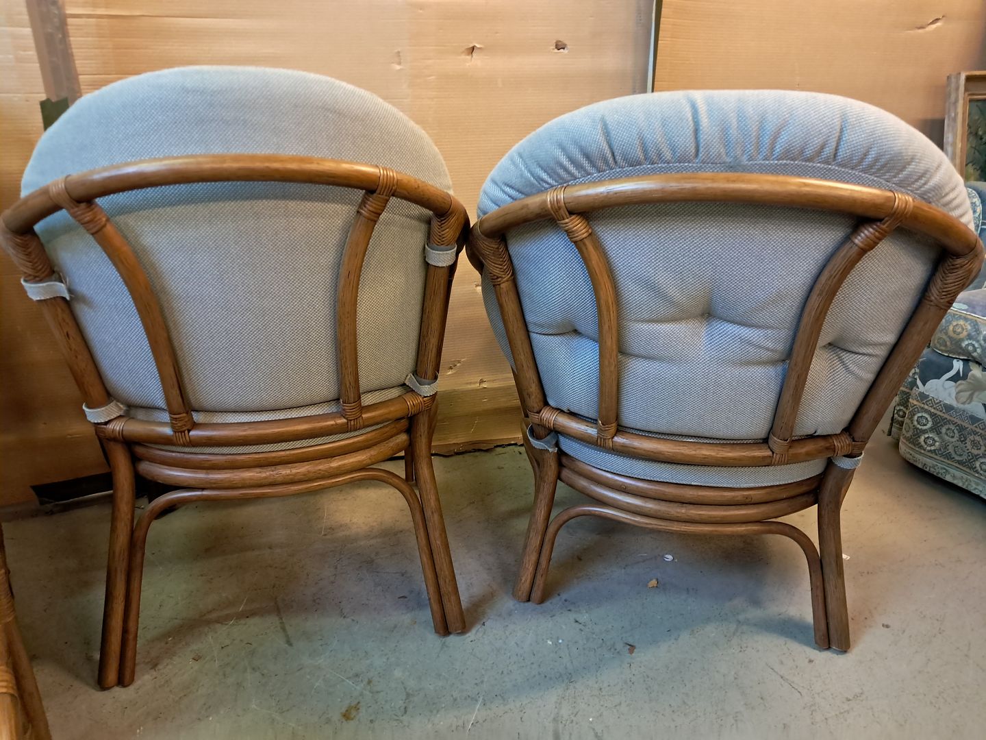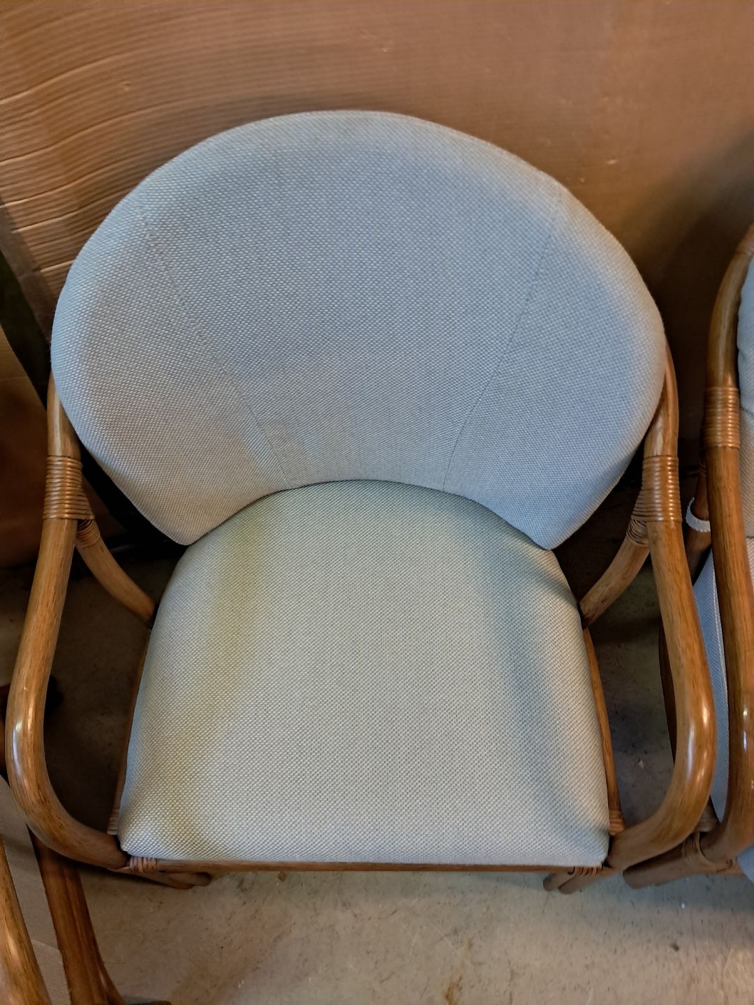3 Stole, en fodskammel og lille bord i bambus, af nyere dato. Den en stol har et skjol på sædet. Sædehøjde 42cm Bord mål : Højde 63cm Diameter 59cm Emne nummer: 76022
