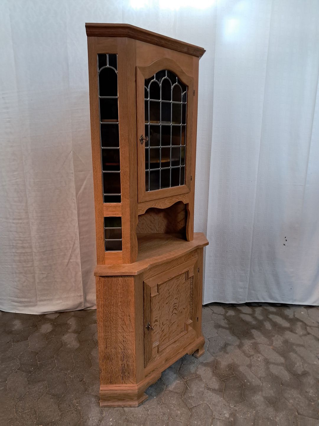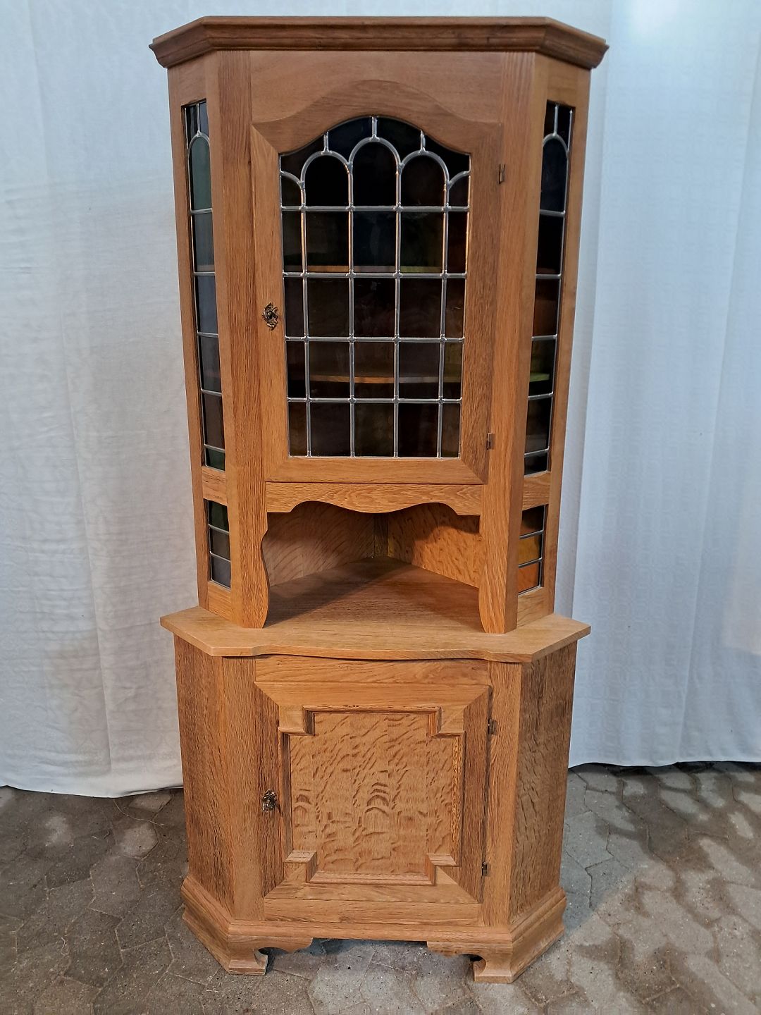 Hjørneskab i massivt og fineret egetræ, fra 1980erne. Højde 180cm Bredde 88cm Dybder 62cm Emne nummer: 91227