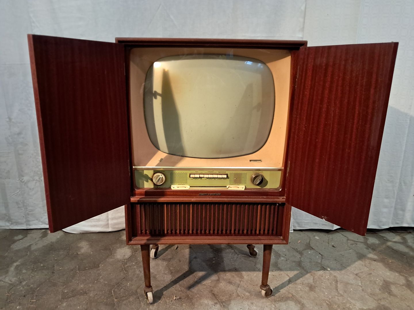 Tv-skab i fineret teaktræ, fra 1950erne. Det har brugsspor og tvét virker ikke. Højde 102cm Bredde 61cm Dybde 44cm Emne nummer: 91304