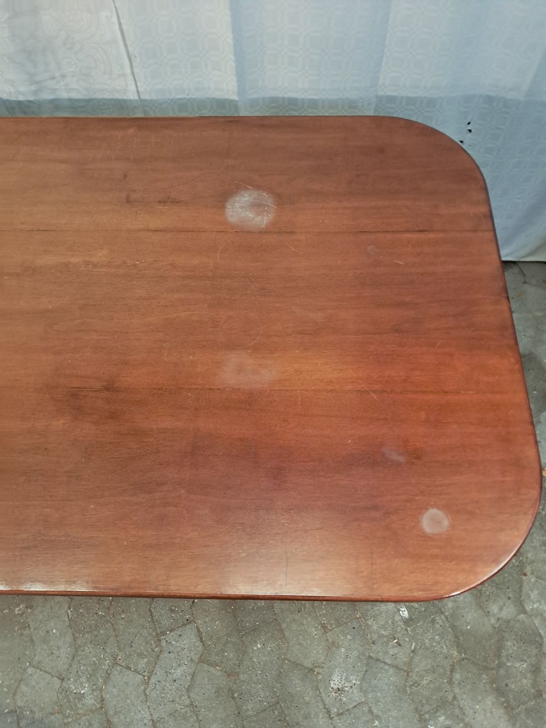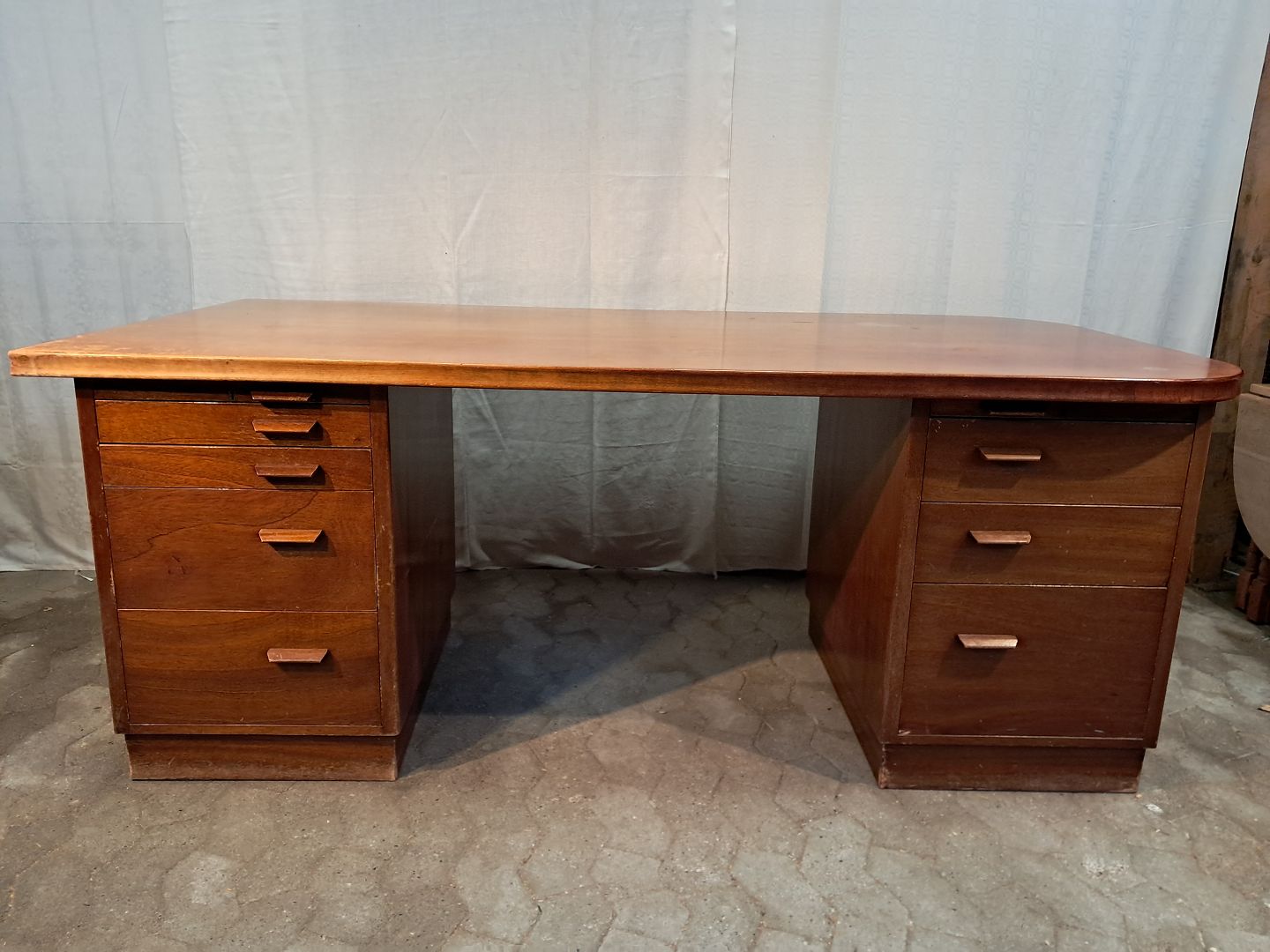 Skrivebord i fineret mahogni, fra 1950erne. Det har brugsspor. Højde 77cm Bredde 200cm Dybde 100cm Emne nummer: 91352