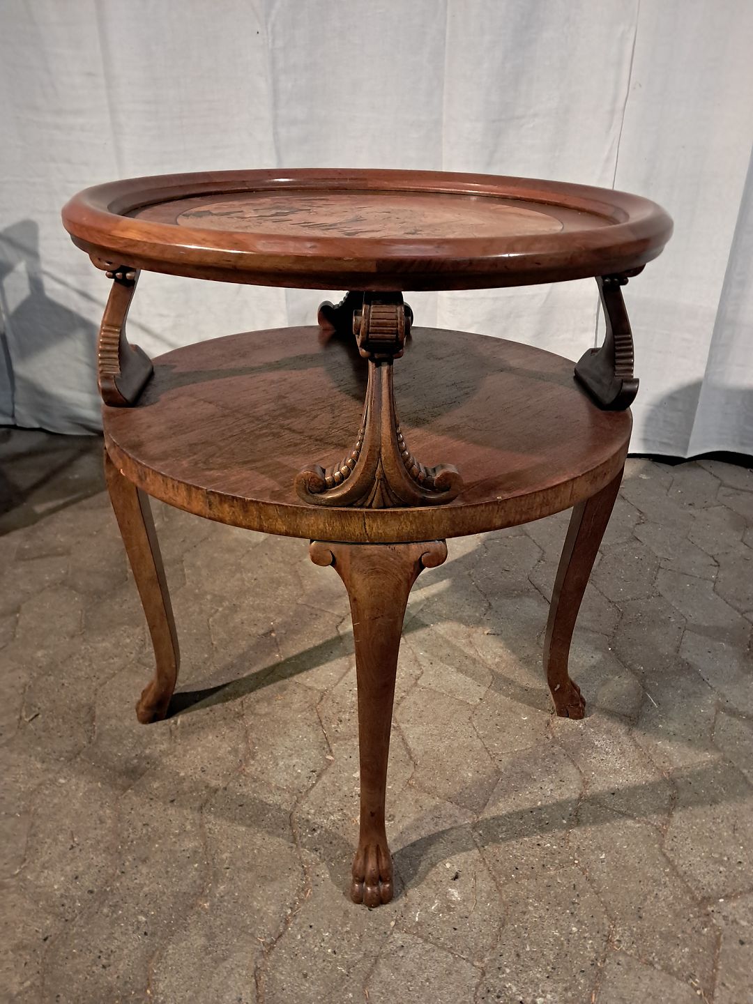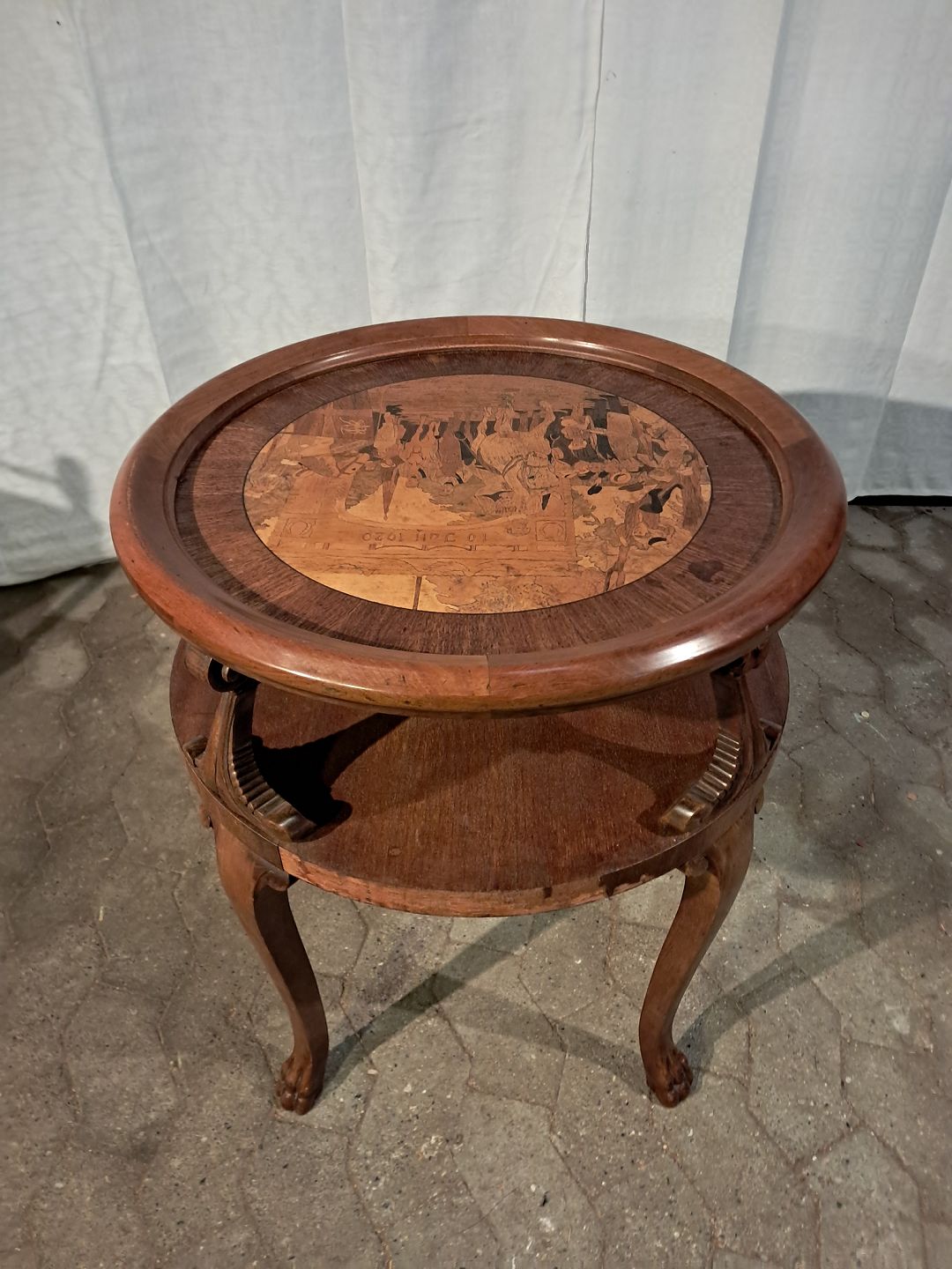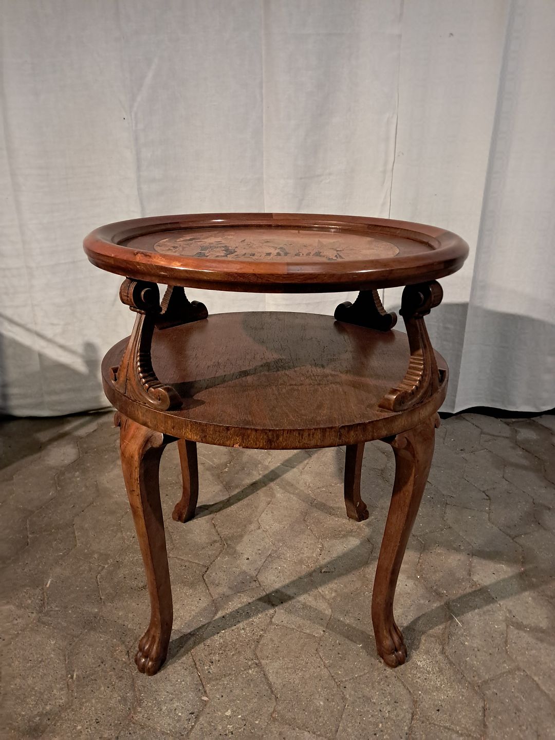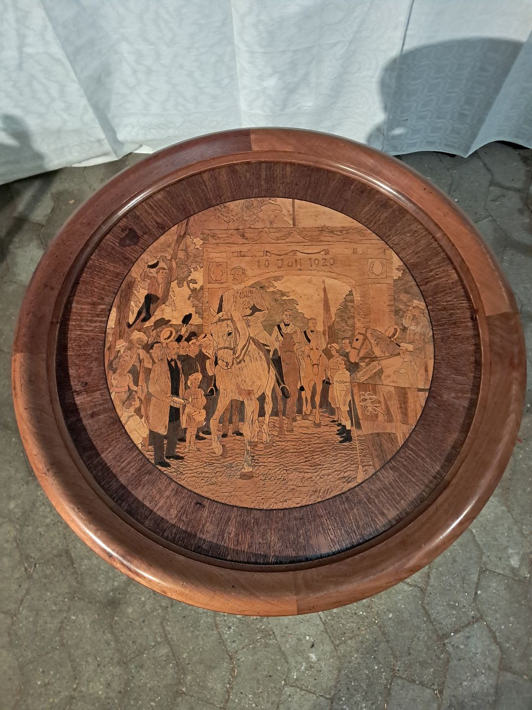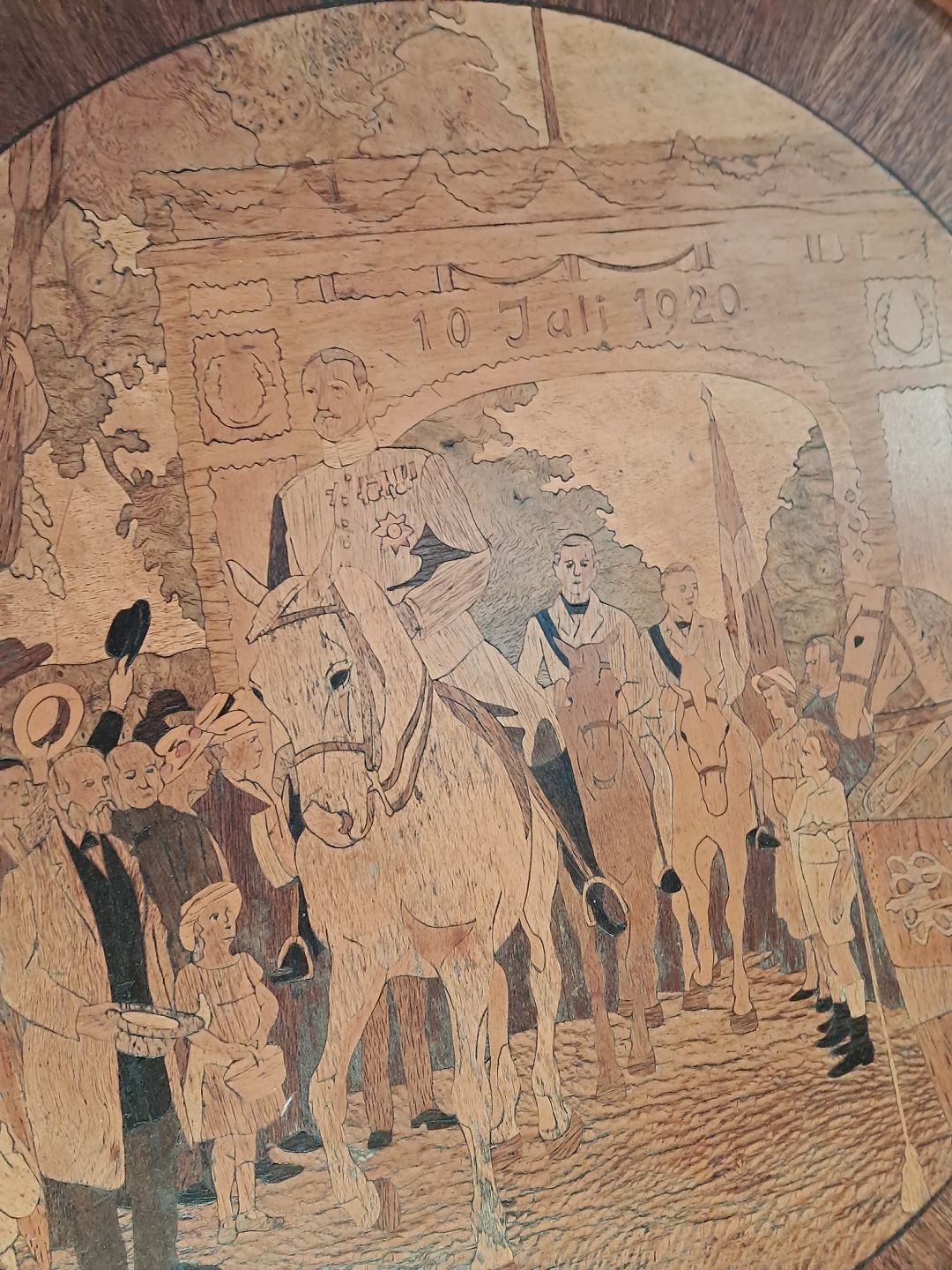 Bord med motiv af Christian X i Sønder Jylland,det er i frineret mahogni, fra 1920erne.