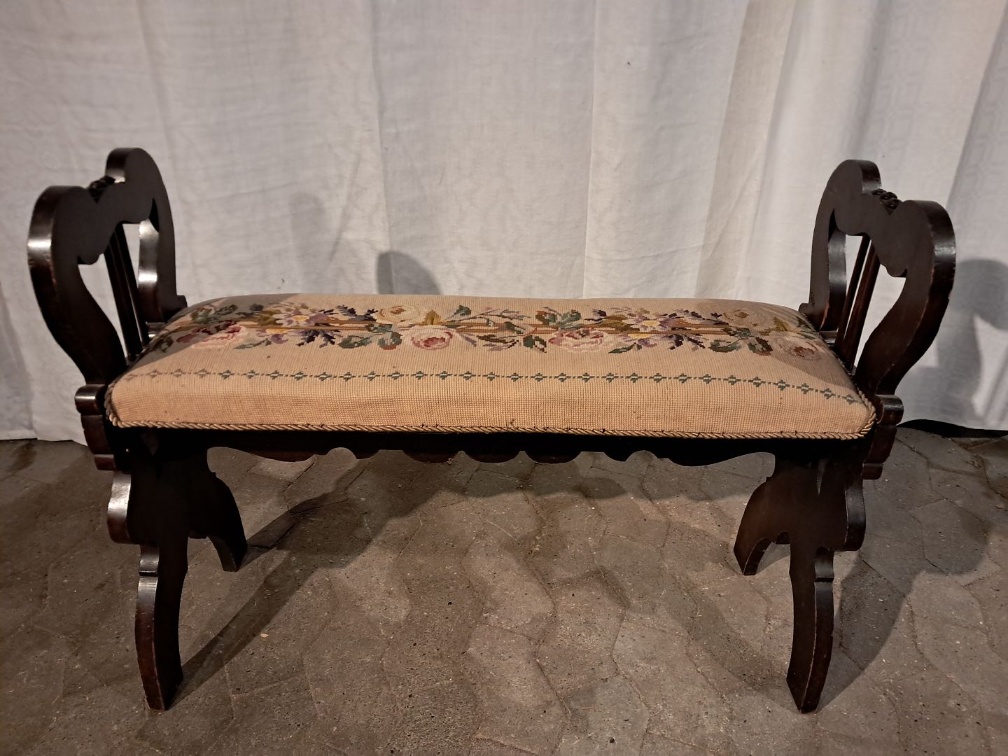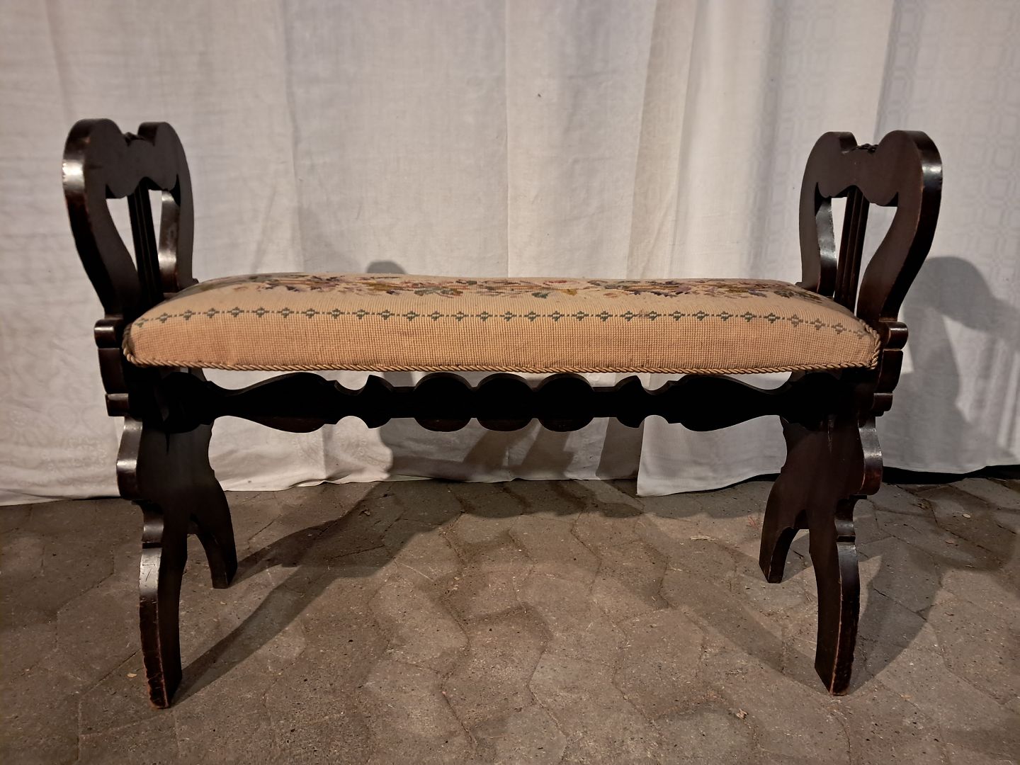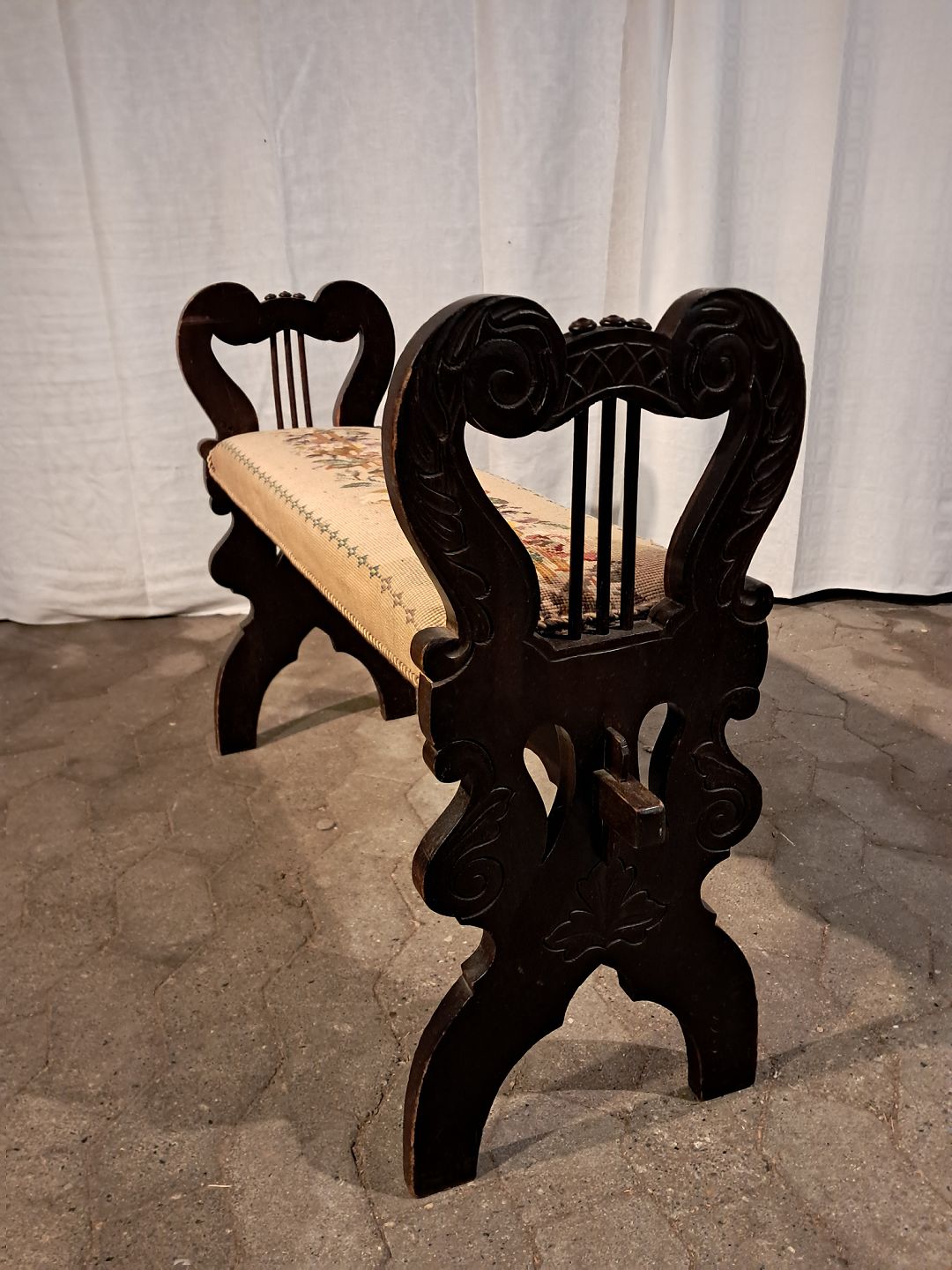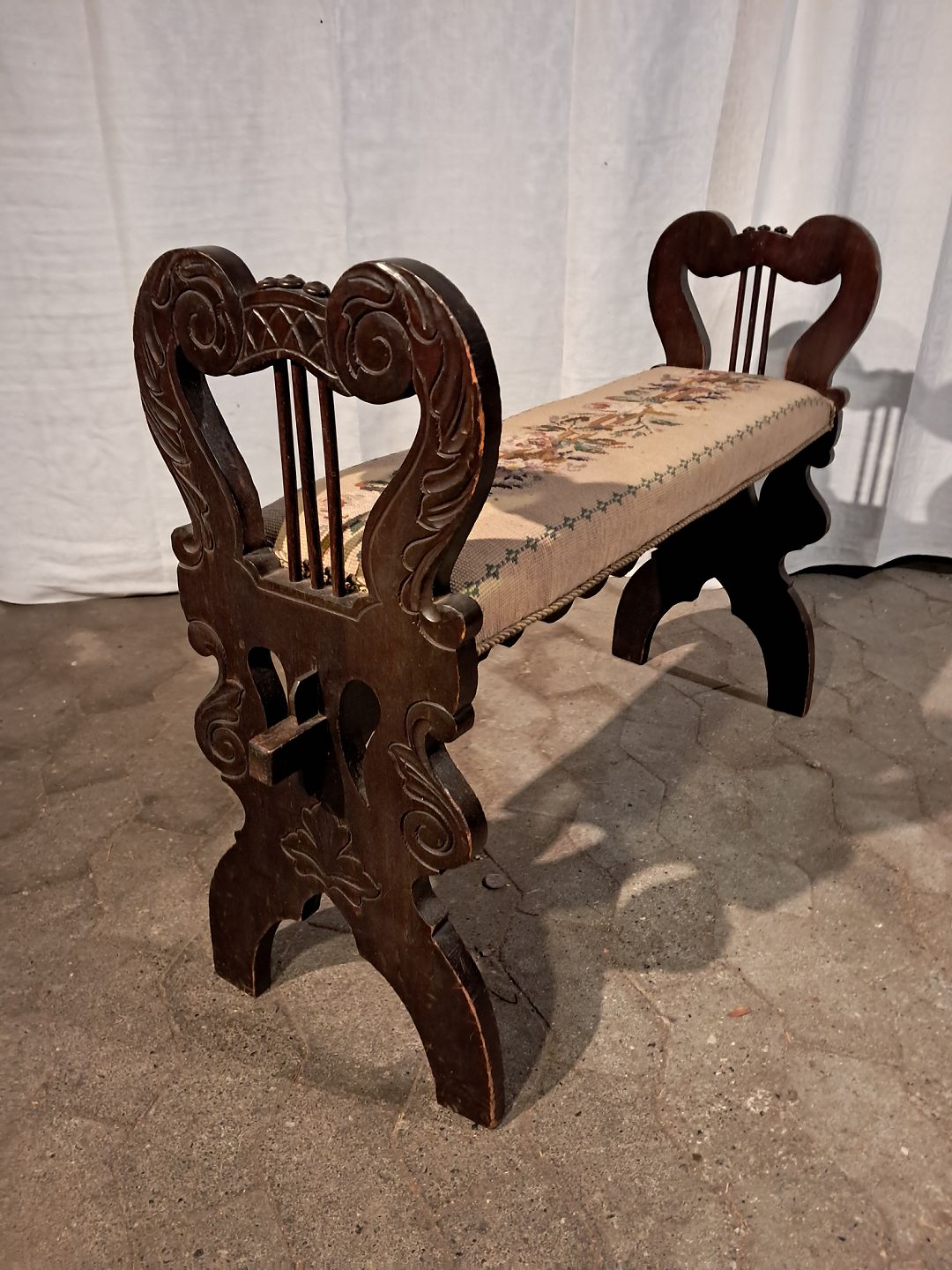 Klaverbænk i massivt fyrretræ, fra 1910erne. Den har brugsspor. Højde 67cm Sædehøjde 47cm Bredde 100cm Dybde 27cm Emne nummer: 91389