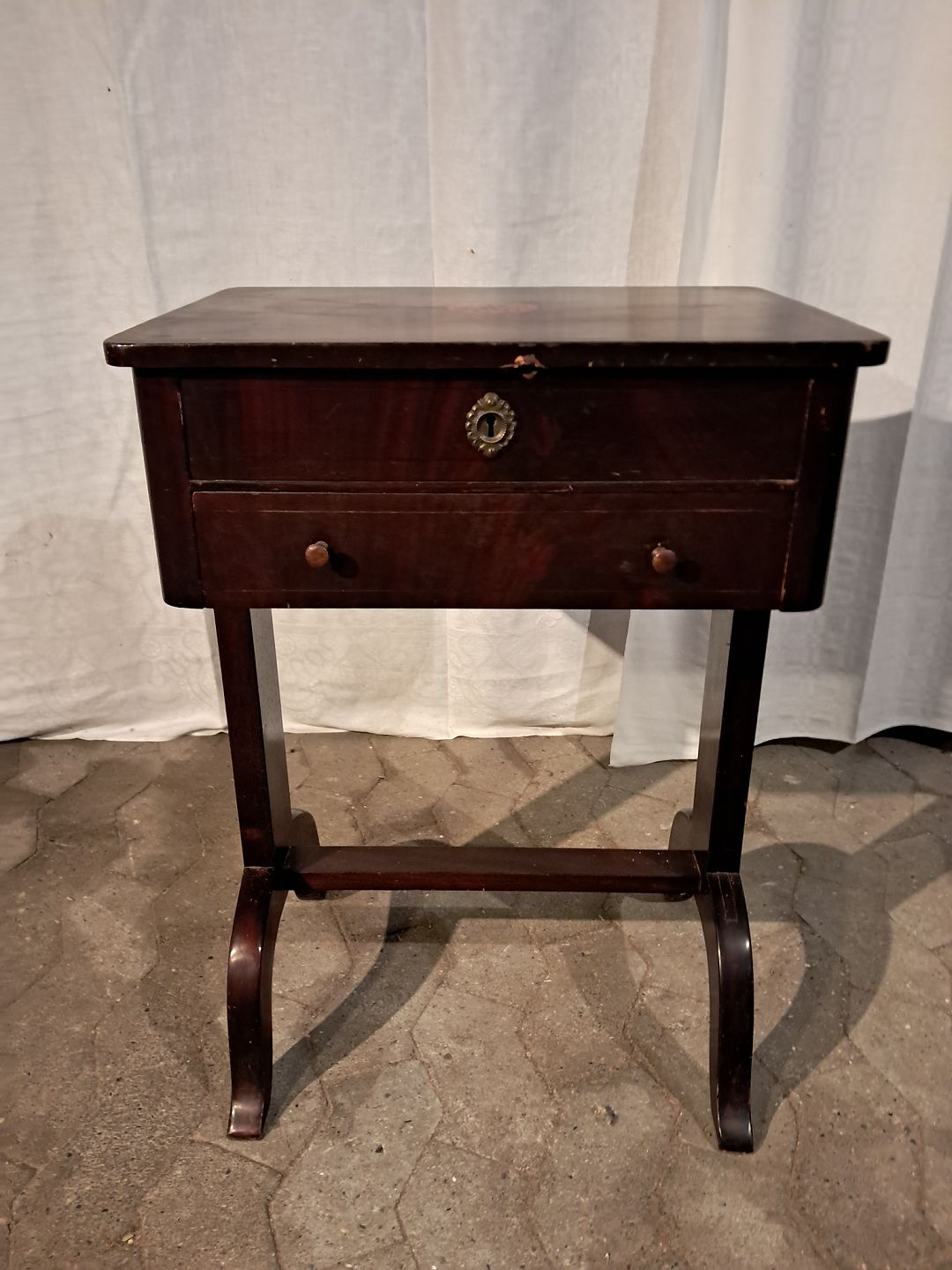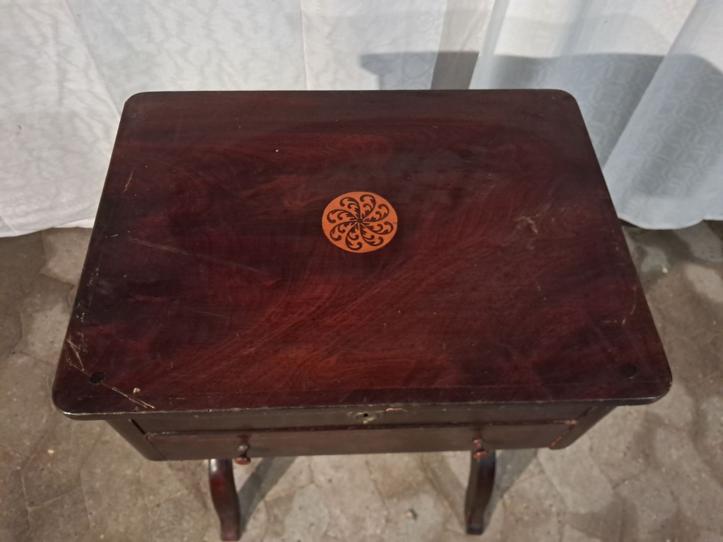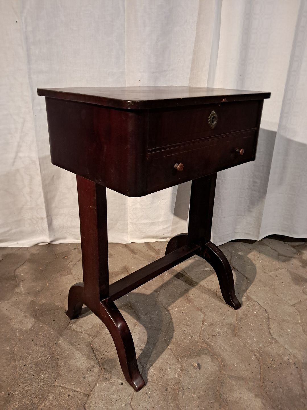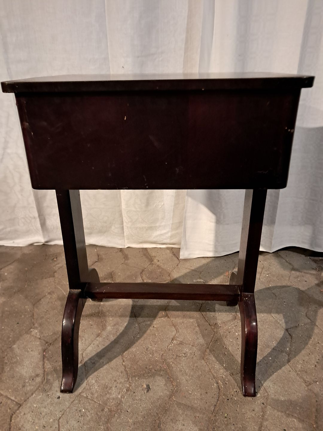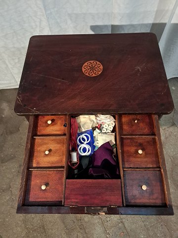 Sybord i fineret mahogni, fra 1900erne. Det har brugsspor. Højde 70cm Bredde 50cm Dybde 37cm Emne nummer: 91391