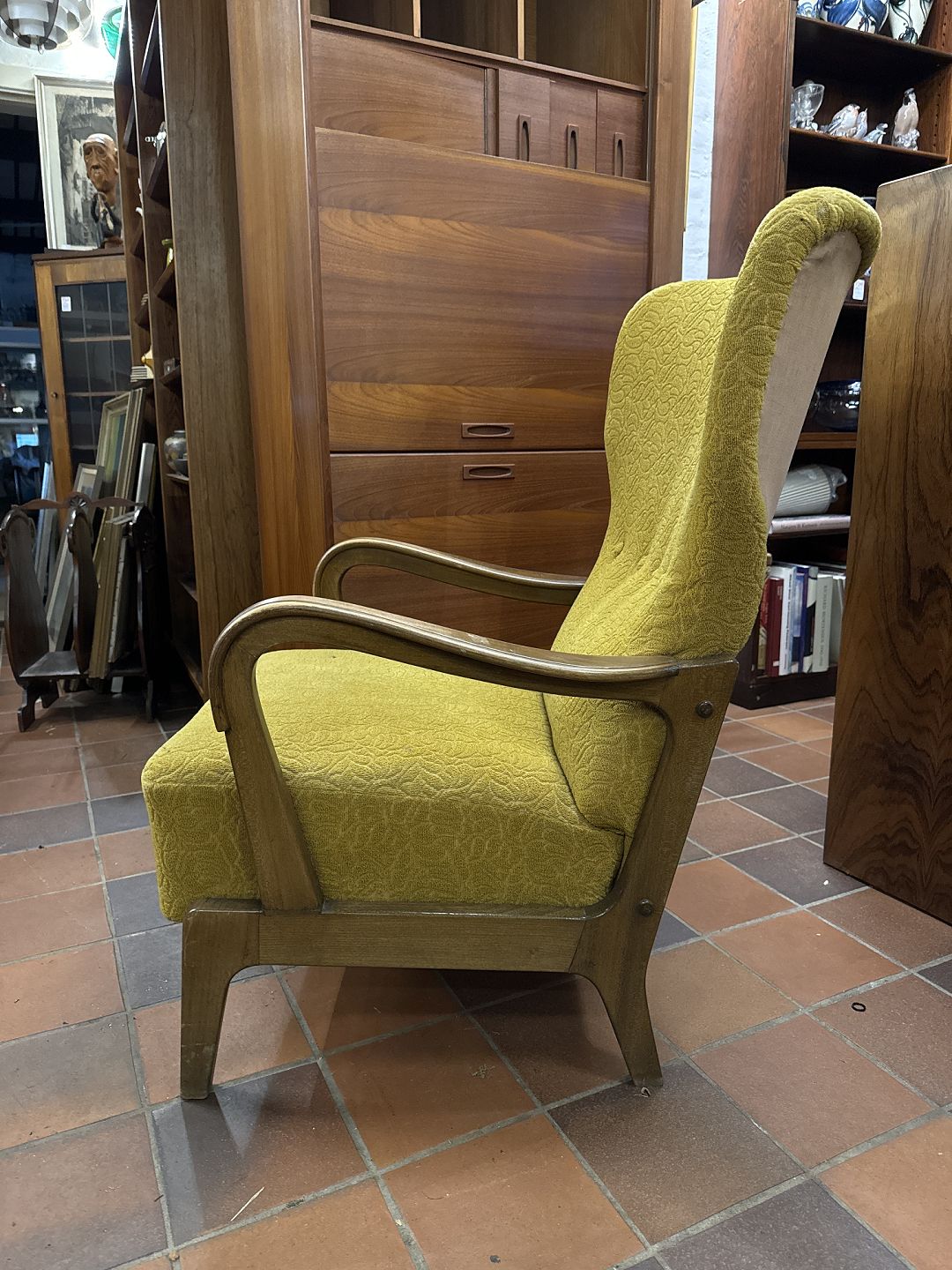 Dansk møbeldesign øreklapstol udført med stel af bejdset nød samt polstret med uldstof. Produceret ca. 1950